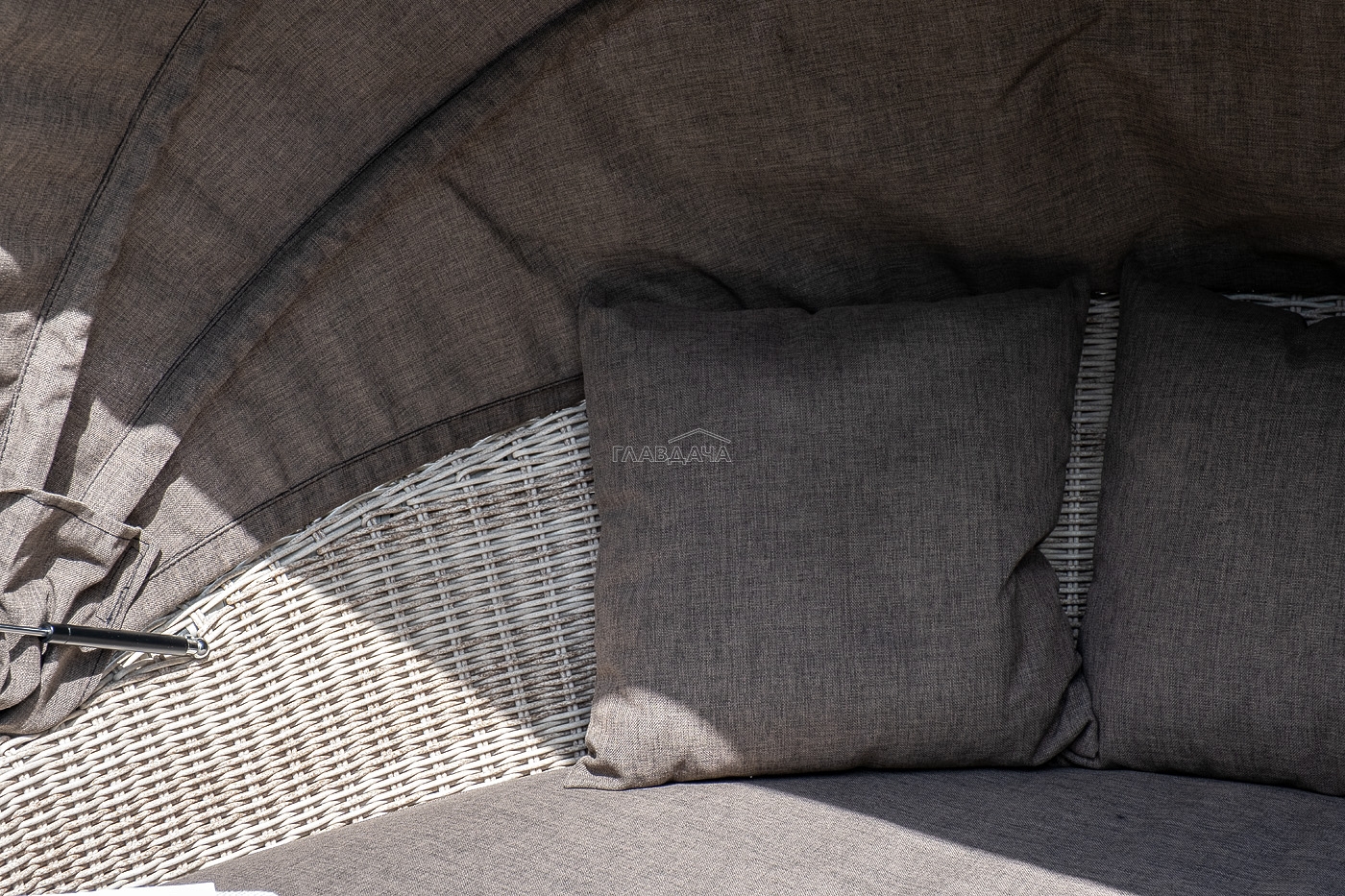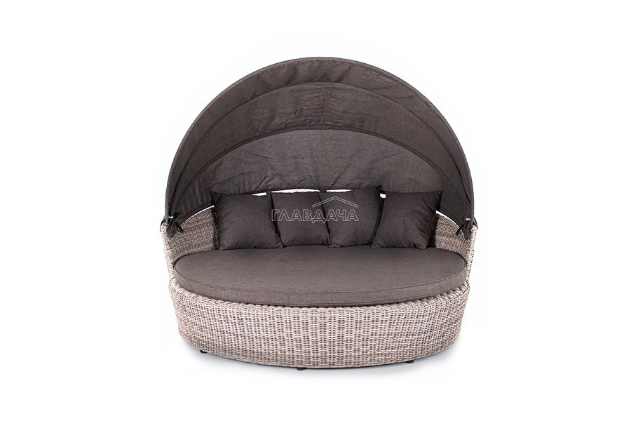 Диаметр кровати составляет 1850 мм, а высота 800 мм. Комплектацией предусмотрен набор из четырех серо-коричневых подушек - 450х450 мм и одного матраса - Ø1600 мм, высотой 60 мм.