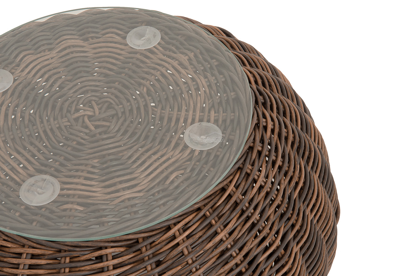 Каркас изготовлен из легкого алюминия и оплетен искусственным ротангом натурального коричневого оттенка. Поверхность столика дополнена стеклянной столешницей из закаленного стекла, толщиной 5 мм.