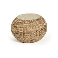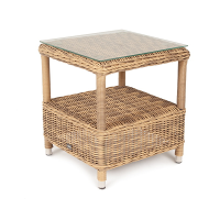 Модель состоит из каркаса, обвитого вручную ротангом коричневого цвета. Данный образец обладает ударопрочной стеклянной 5 мм столешницей, конструкцией предусмотрена полочка для принадлежностей.