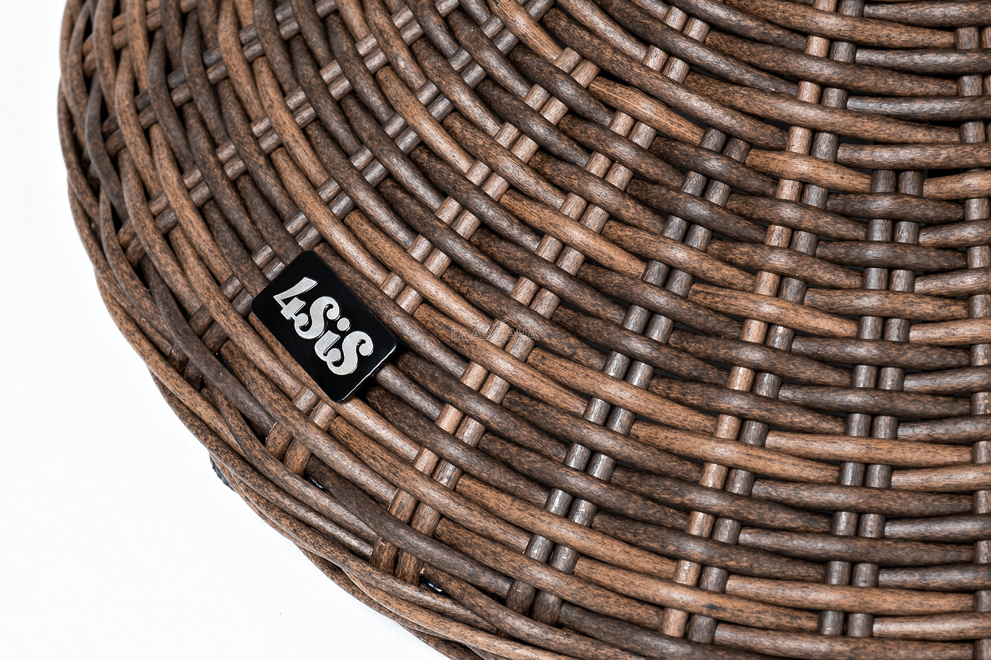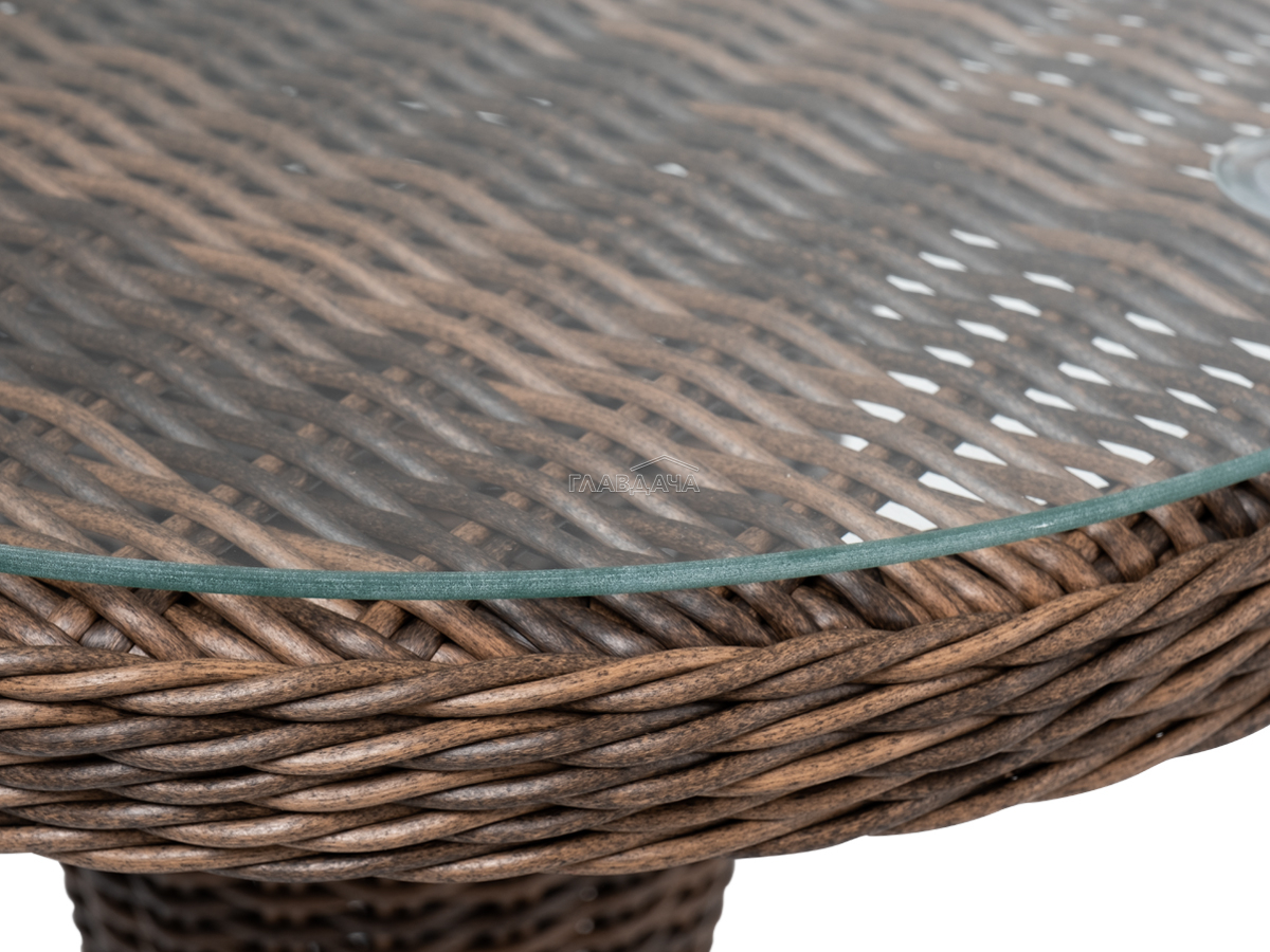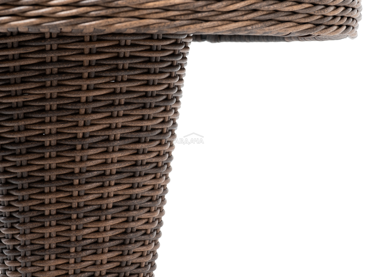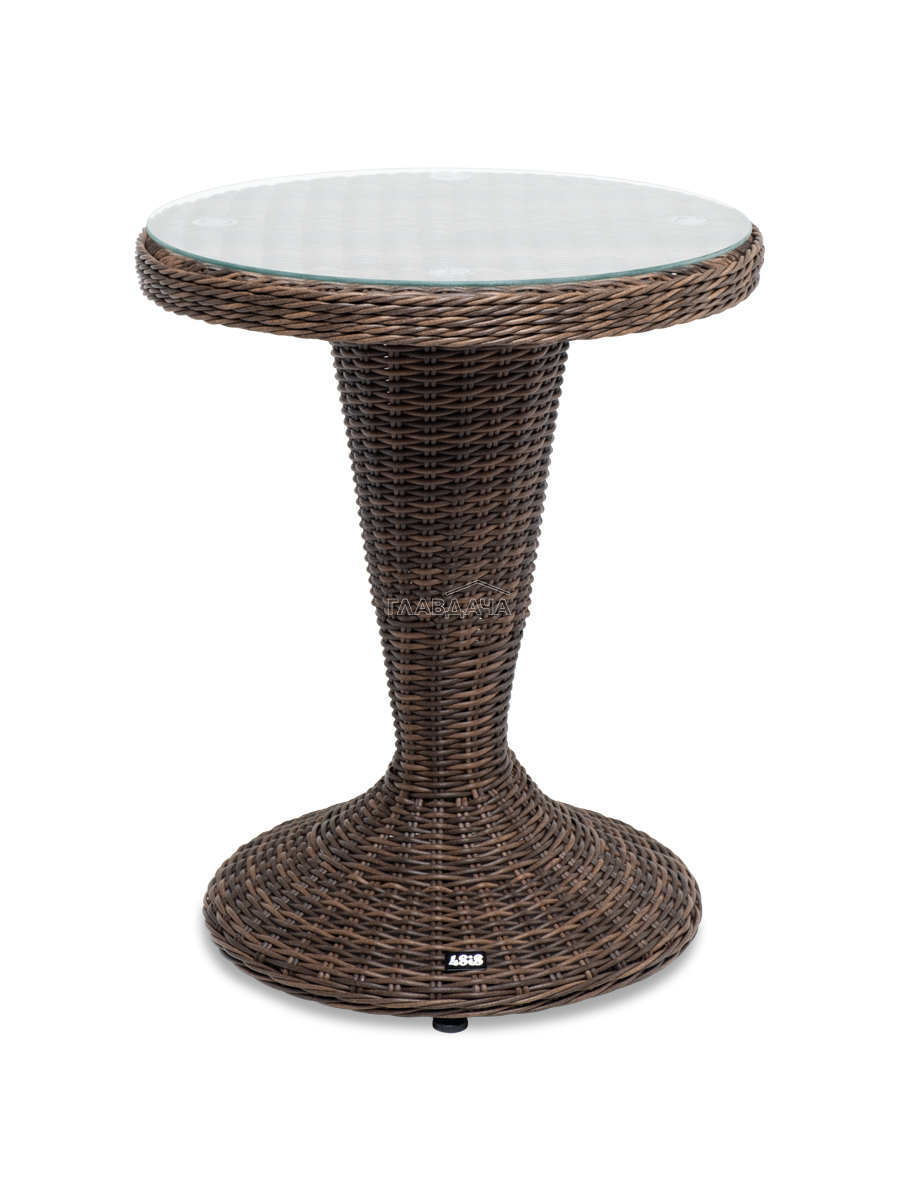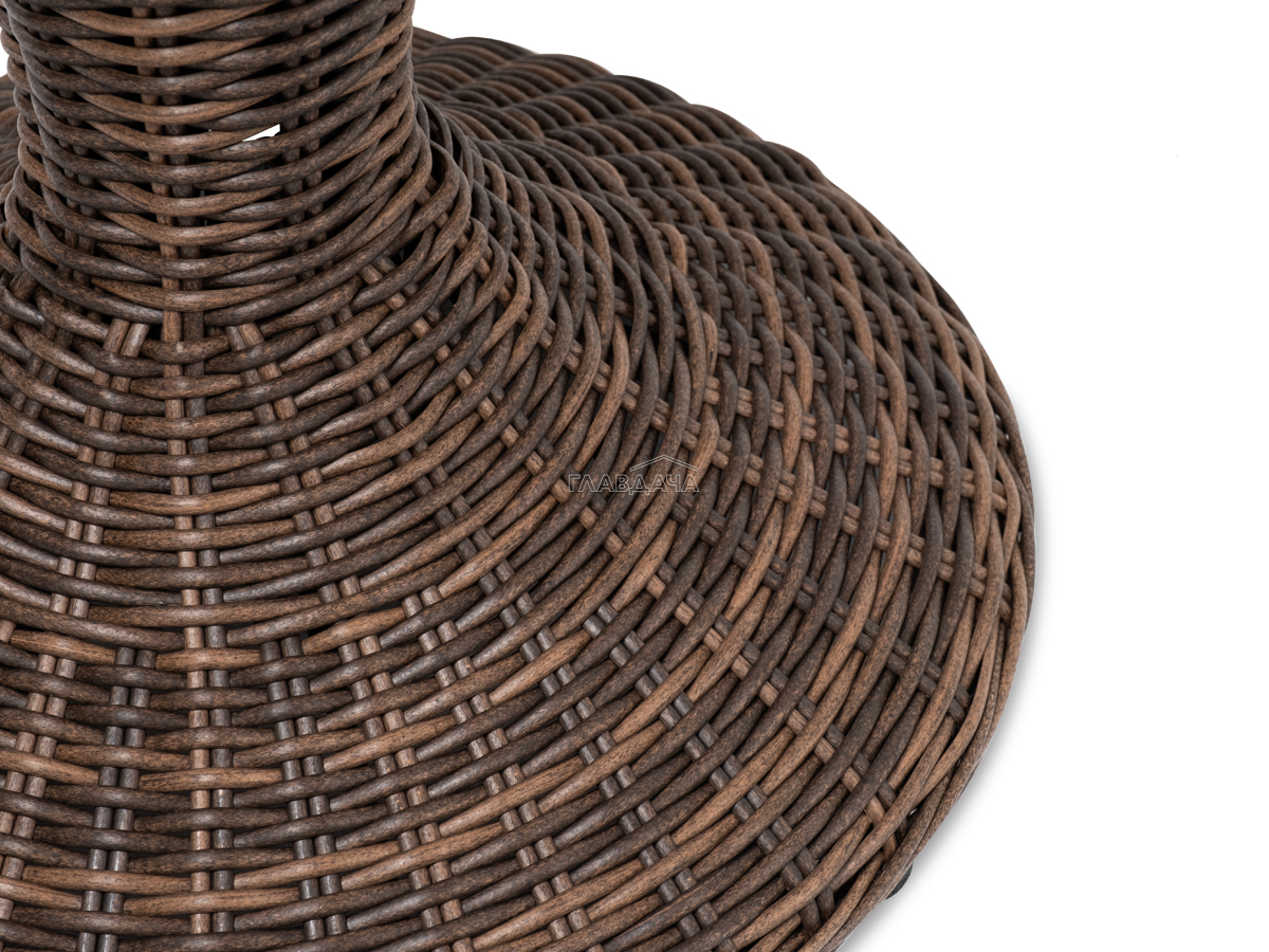 Каркас изготовлен из легкого алюминия и оплетен искусственным ротангом коричневого оттенка. Поверхность столика дополнена стеклянной столешницей из закаленного стекла, толщиной 5 мм.