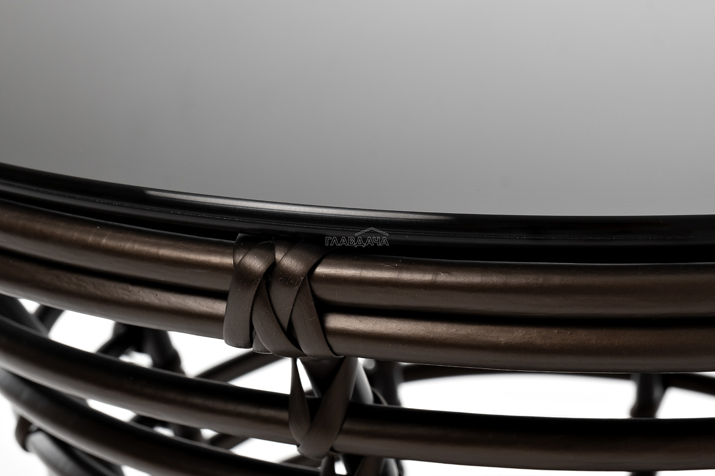 Каркас столика изготовлен из алюминия, вручную оплетенного круглым искусственным ротангом.