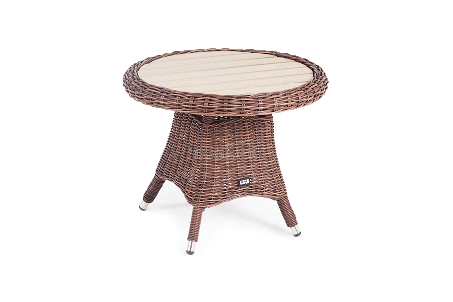 Размер модели – 600×600×480 мм. Столик располагает прочным каркасом, который изготовлен из качественного алюминия, отвечающий за надежное расположение конструкции. Весь каркас оплетен вручную круглым искусственным ротангом коричневого цвета.