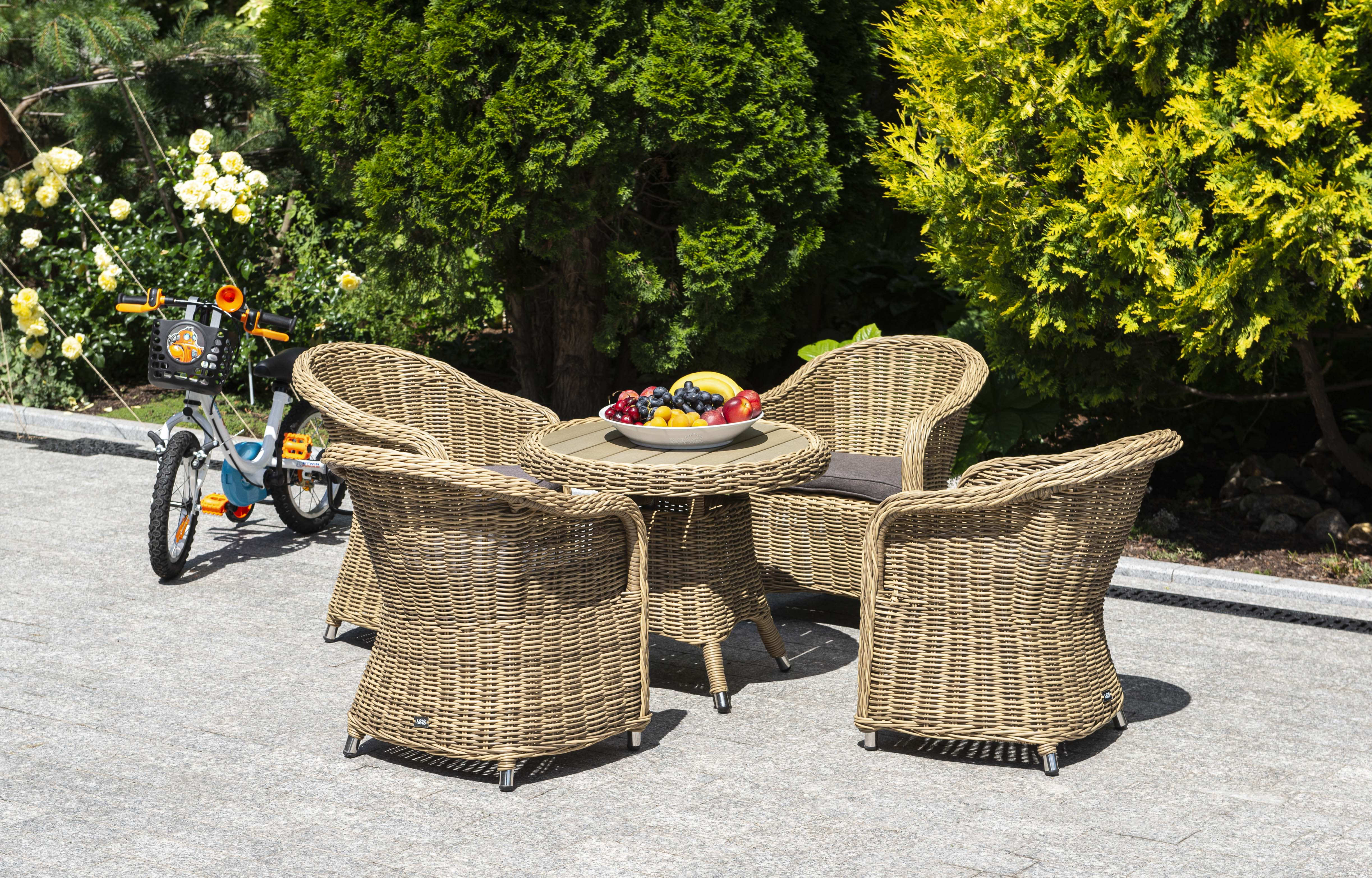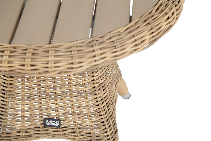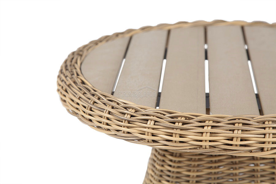 Размер модели – 600×600×480 мм. Столик располагает прочным каркасом, который изготовлен из качественного алюминия, отвечающий за надежное расположение конструкции. Весь каркас оплетен вручную круглым искусственным ротангом соломенного цвета.
