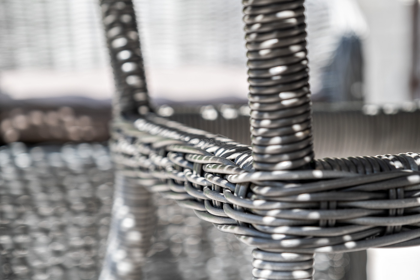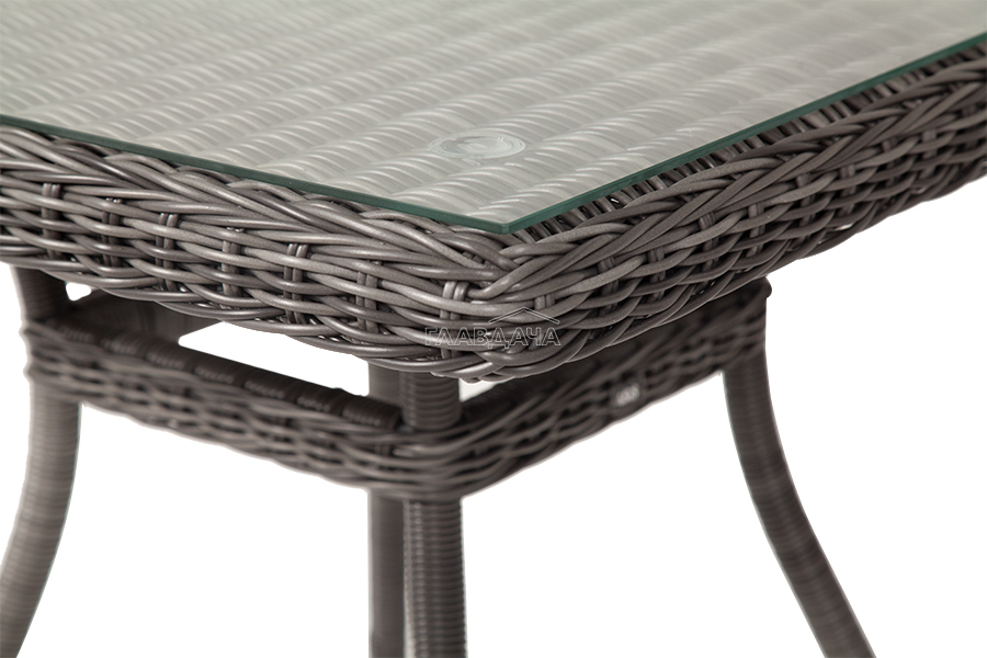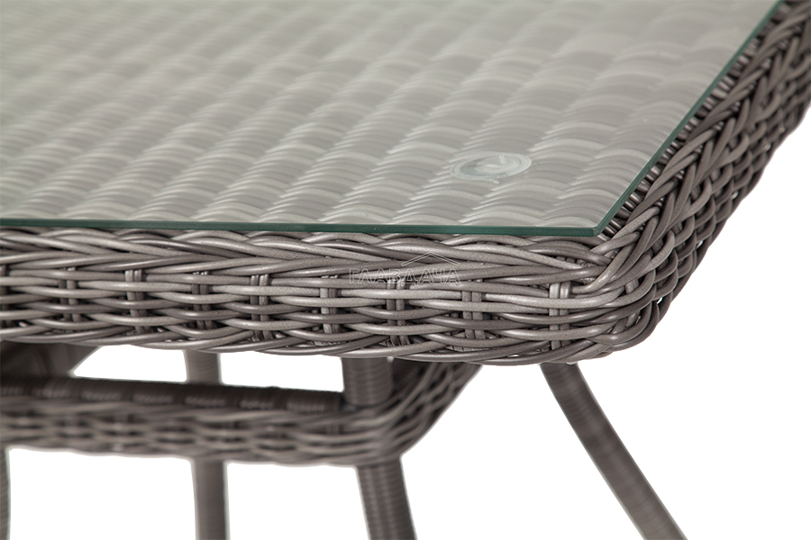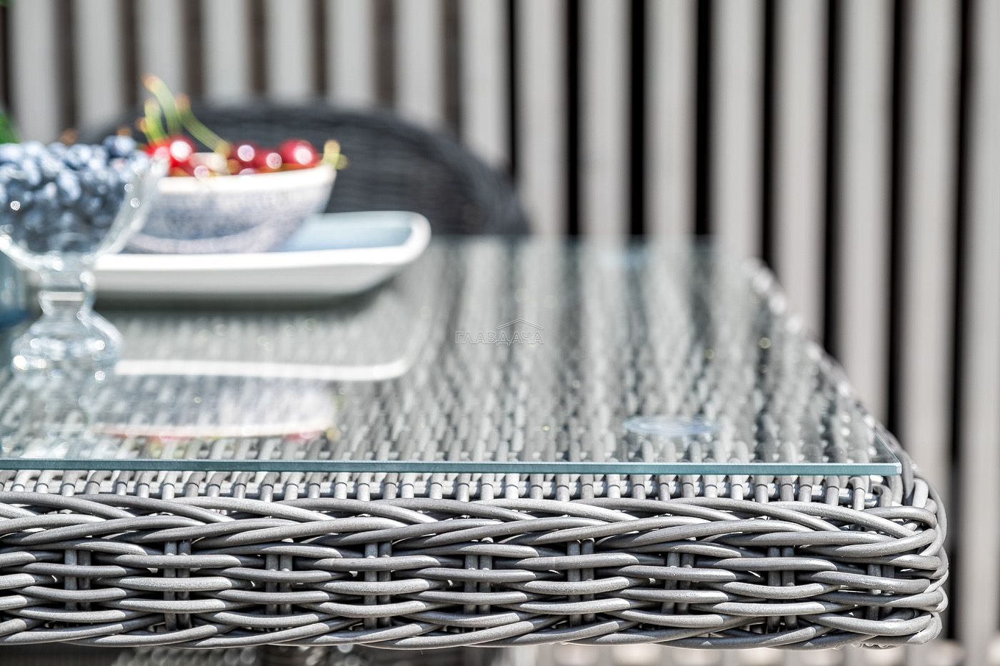 Благодаря столешнице из ударопрочного стекла толщиной 5 мм, можно не опасаясь ставить горячую посуду. Каркас изготовлен из прочного алюминия, оплетенного ротангом графитового цвета.