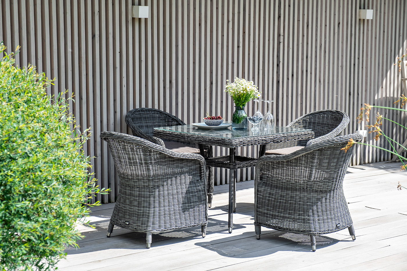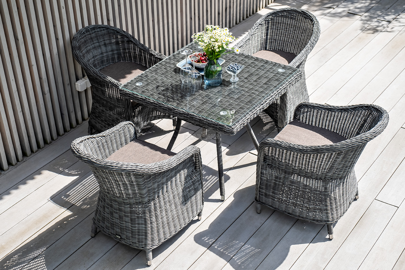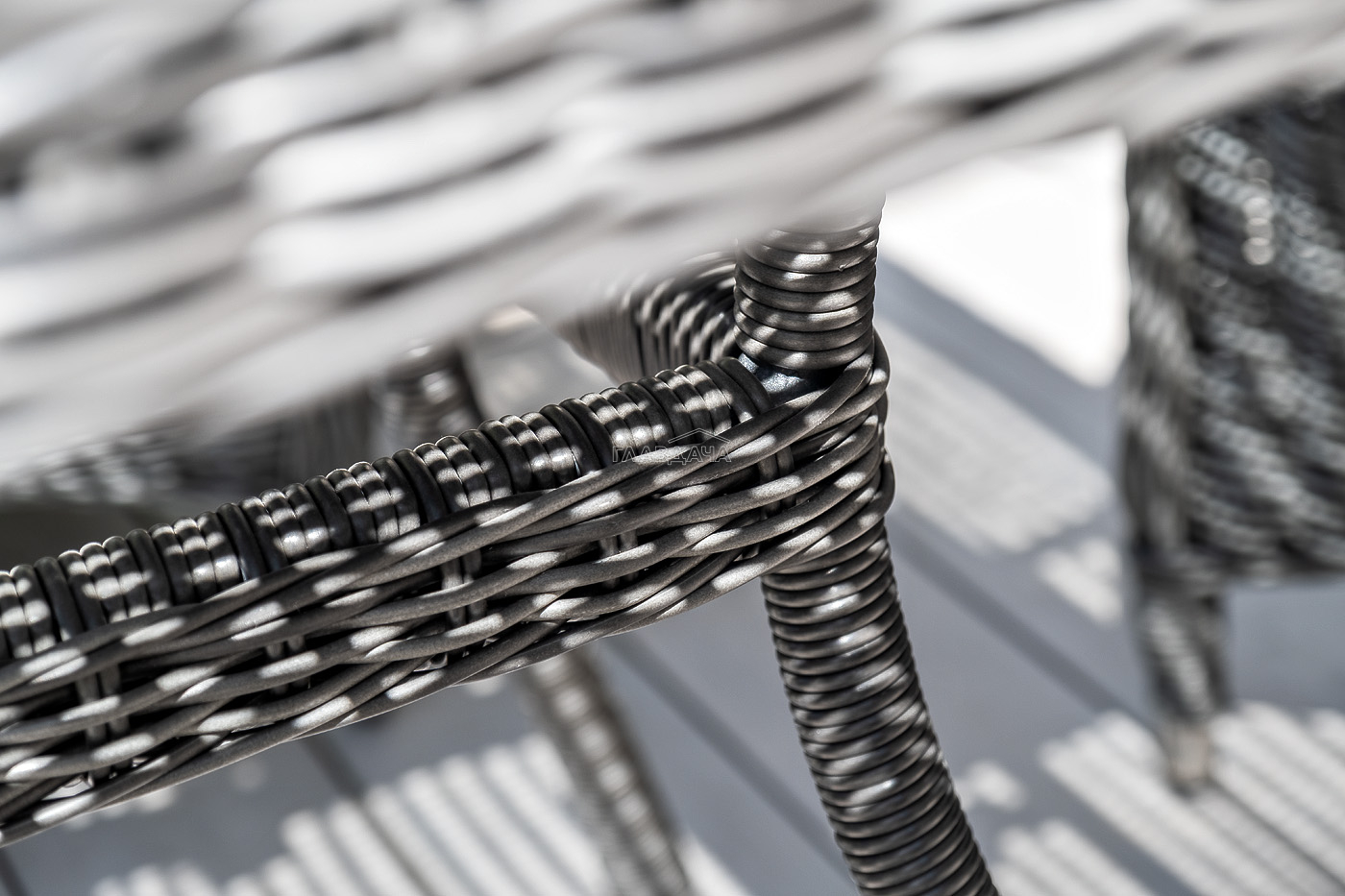 Благодаря столешнице из ударопрочного стекла толщиной 5 мм, можно не опасаясь ставить горячую посуду. Каркас изготовлен из прочного алюминия, оплетенного ротангом графитового цвета.