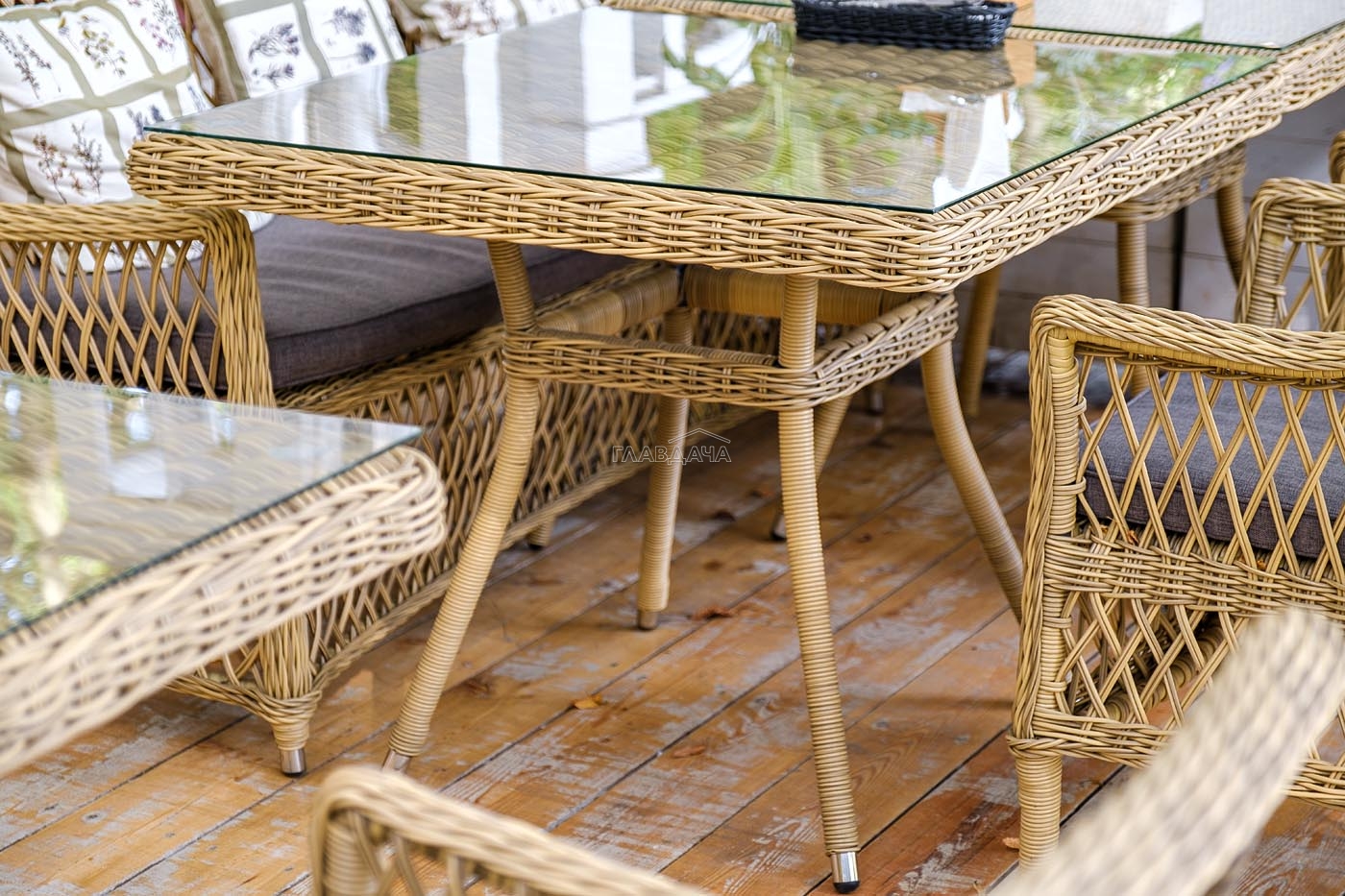 Каркас изготовлен из прочного алюминия, вручную оплетенного круглым искусственным ротангом натурального соломенного оттенка. В качестве столешницы использовано ударопрочное стекло, толщиной 5 мм. На стол можно ставить горячие тарелки и чашки, не опасаясь деформации покрытия.