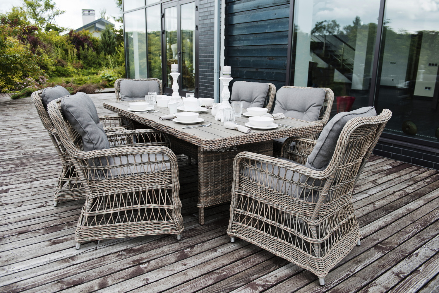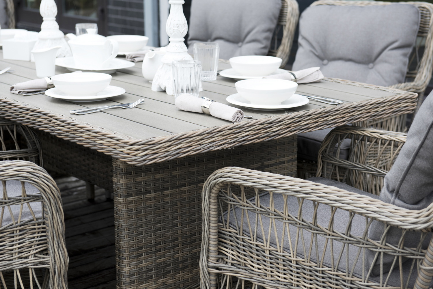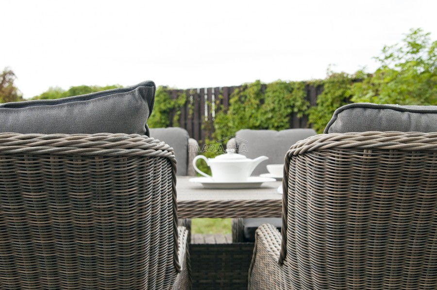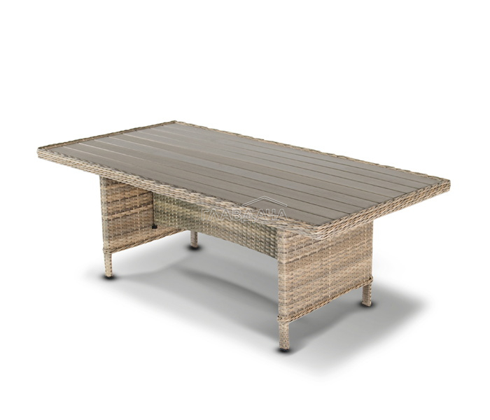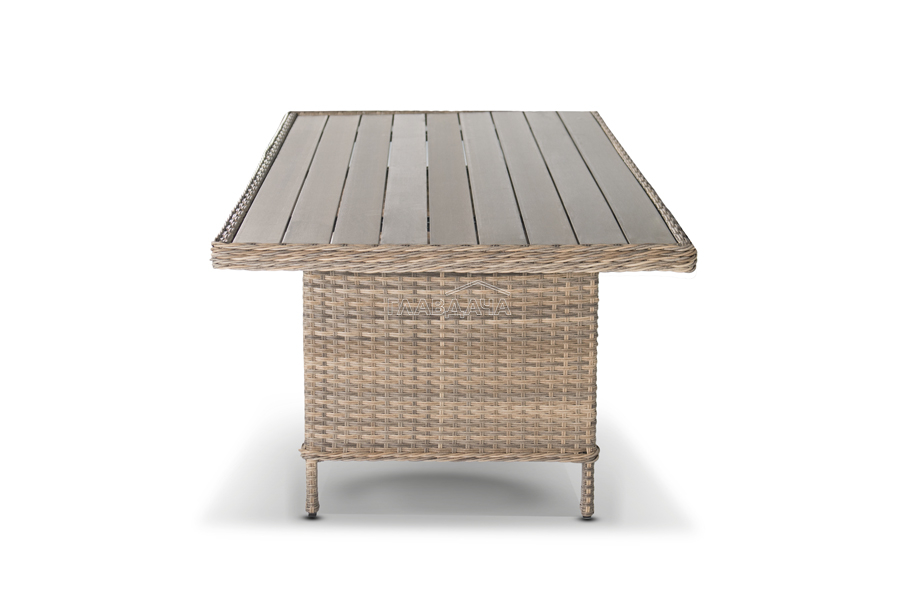 Каркас изготовлен из алюминия, декорированного долговечным искусственным ротангом комбинированного плетения – круглого и плоского. Стол выполнен в натуральном серо-соломенном оттенке, имитирующем цвет натуральной лозы. Столешница произведена из универсального полимерного материала ДПК, устойчивого к переменам погоды.