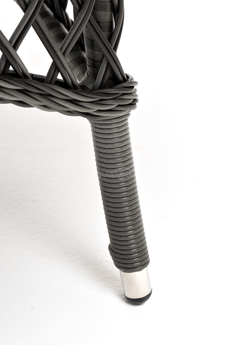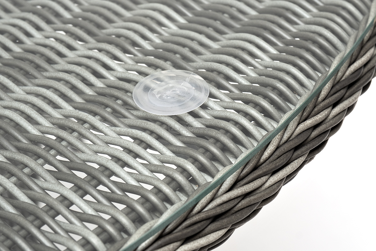 В качестве основания выступает каркас, выполненный из алюминия и оплетён круглым искусственным ротангом графитового цвета. Рабочую плоскость покрывает 5 мм столешница из ударопрочного закаленного стекла.