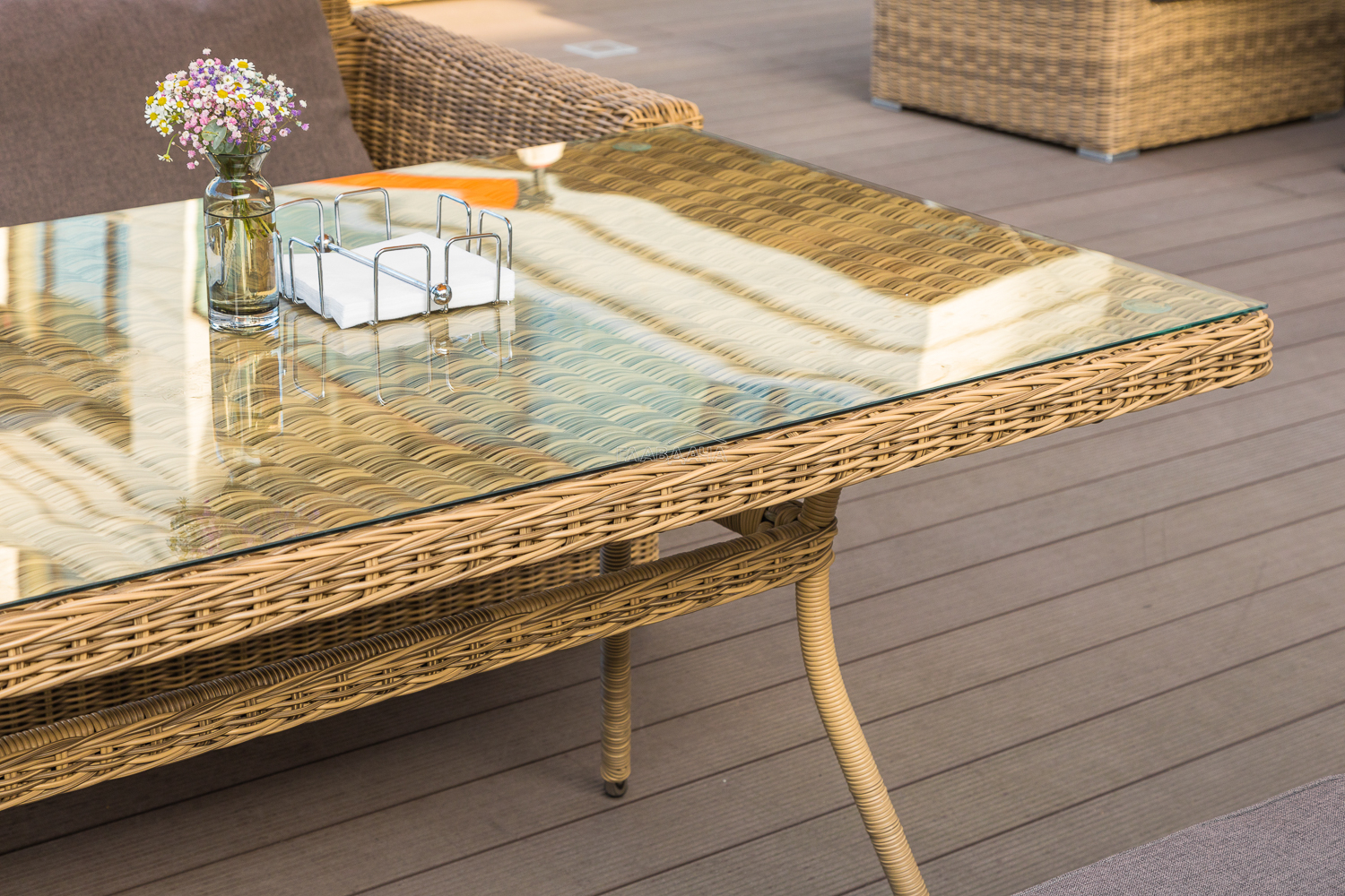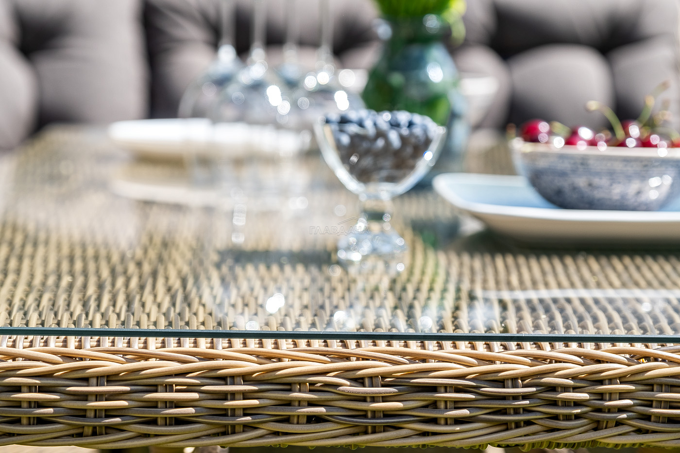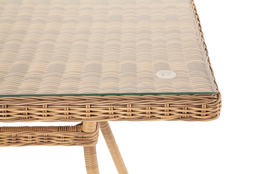 Каркас садового стола изготовлен из алюминия, вручную оплетенного круглым искусственным ротангом натурального соломенного оттенка.