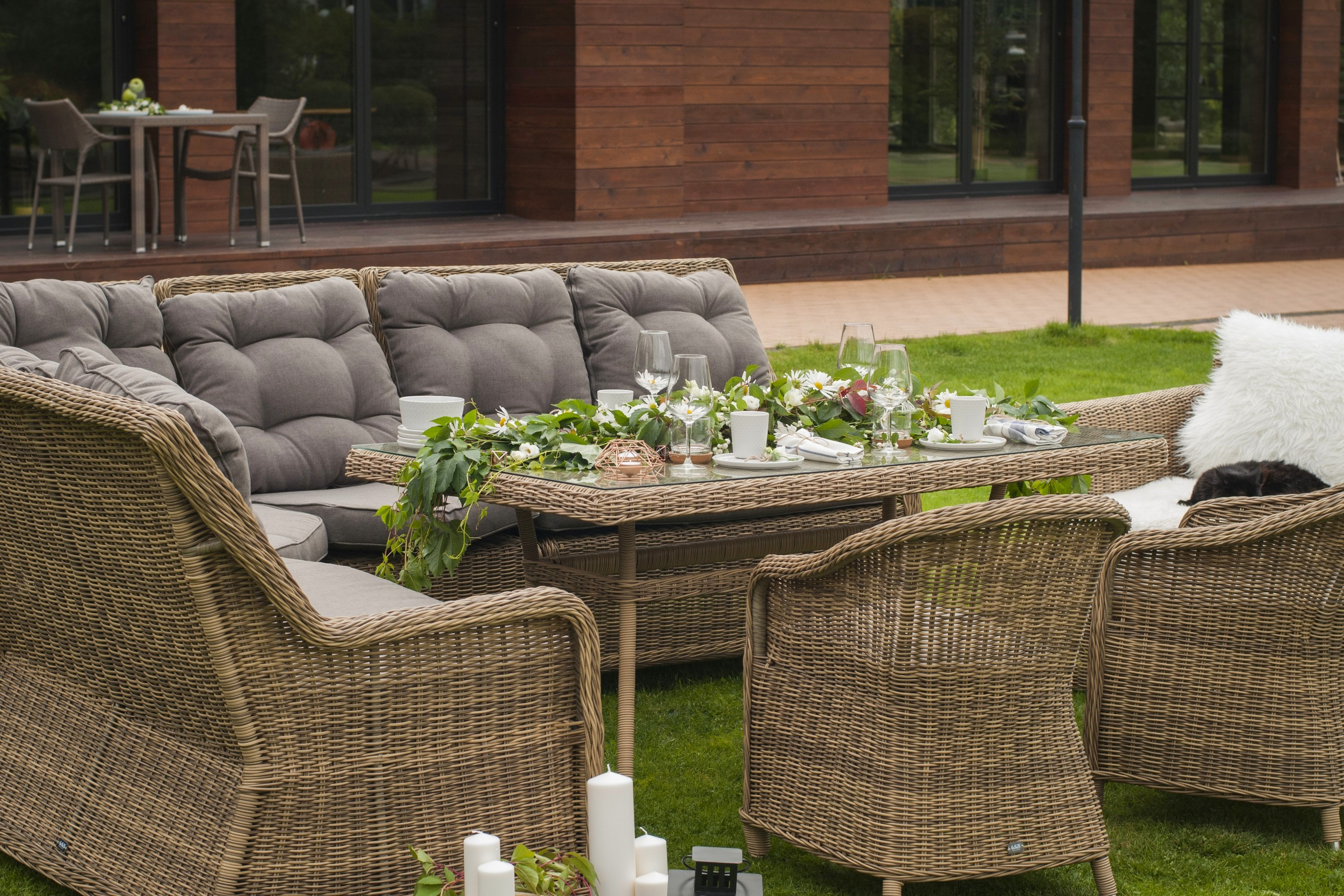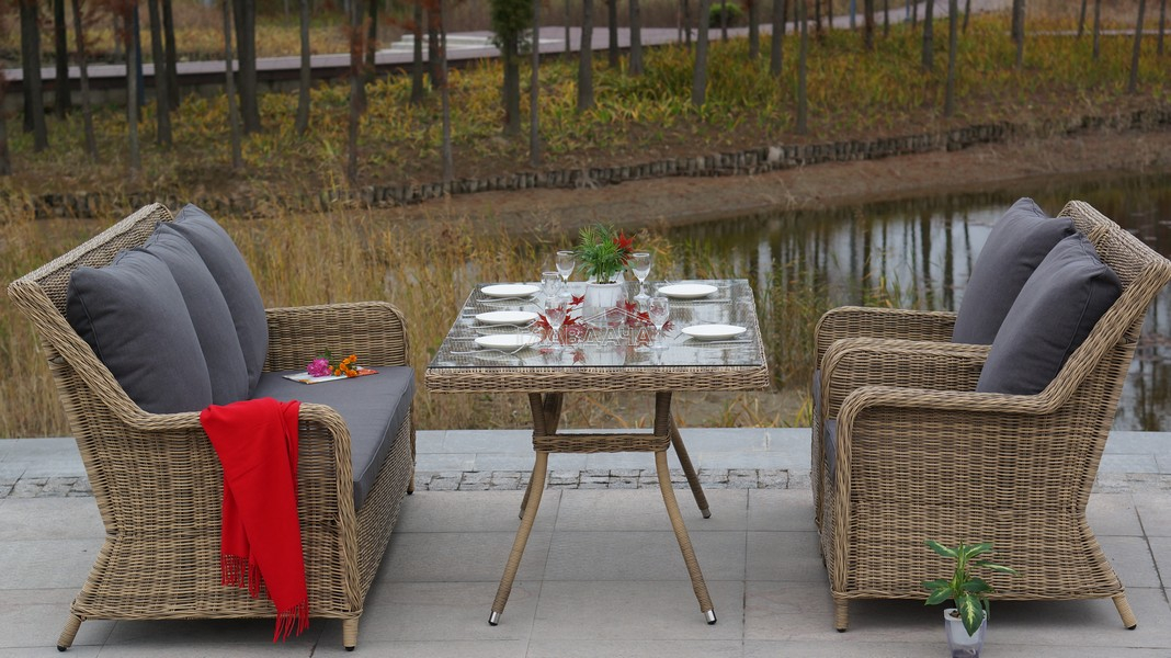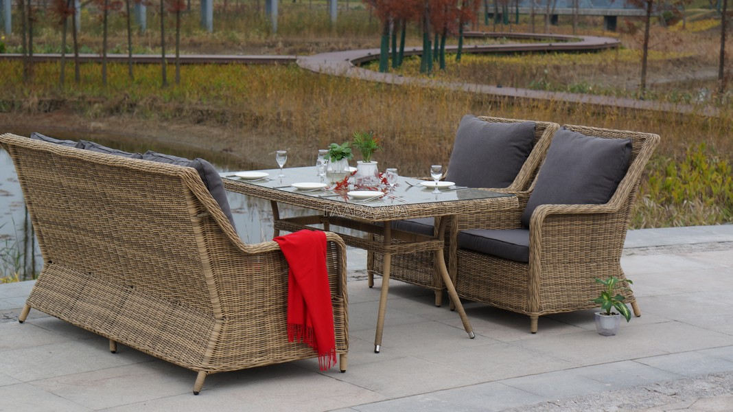 Размеры плетеного стола: 1600×900×750 мм. Рассчитан на 6 персон.