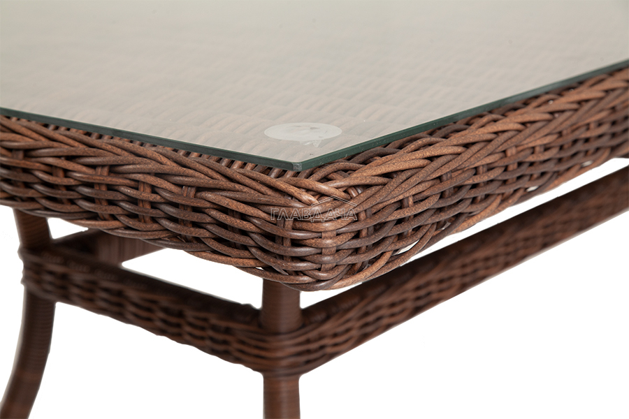 Каркас изделия изготовлен из прочного, но очень легкого алюминия, оплетенного вручную искусственным ротангом круглого плетения насыщенного шоколадного оттенка. Это долговечный материал, устойчивый к переменам погоды, атмосферным осадкам, прямым солнечным лучам. Благодаря ему стол можно использовать круглогодично под открытым небом.