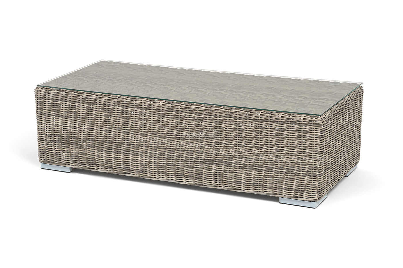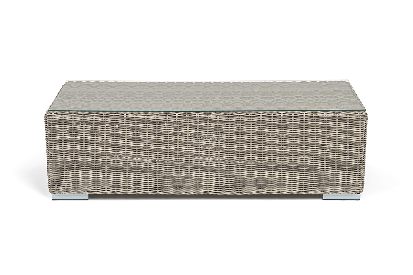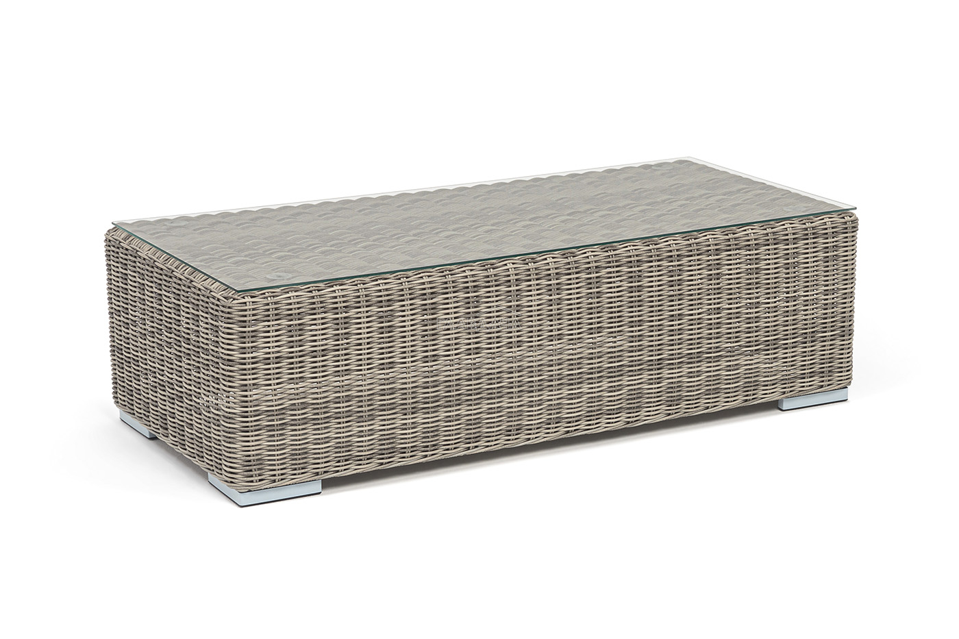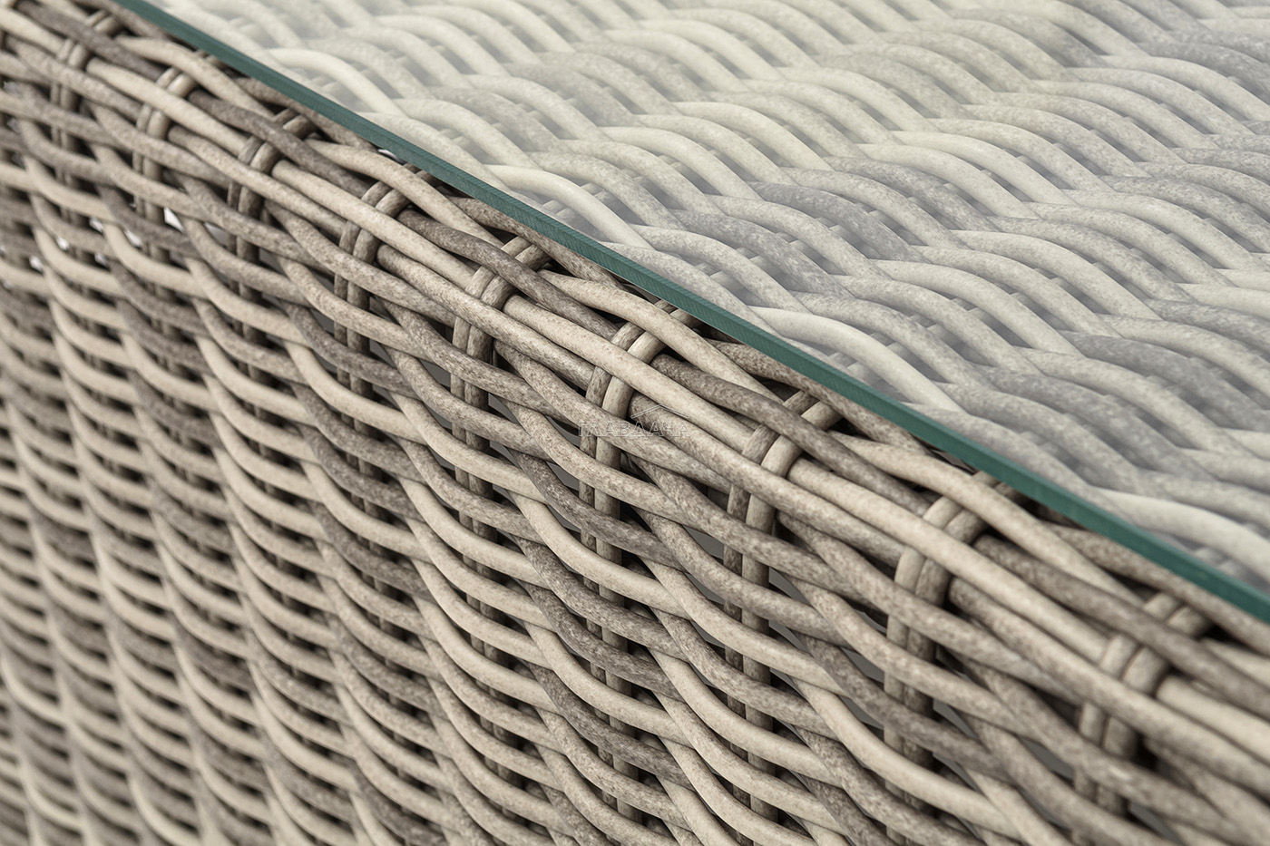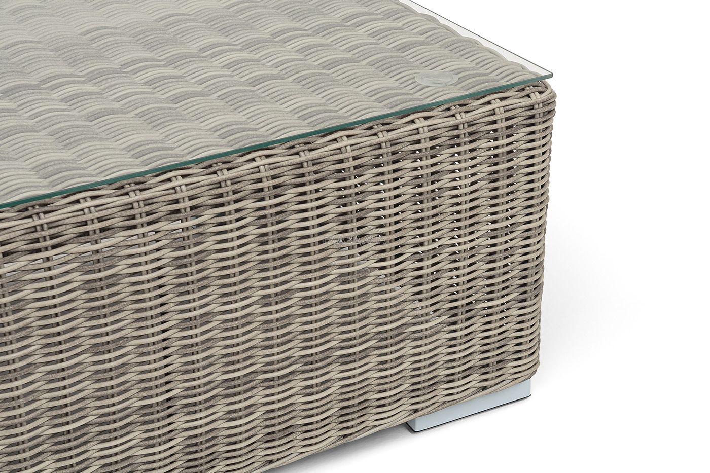 Каркас столика изготовлен из алюминия, вручную оплетенного круглым искусственным ротангом.
