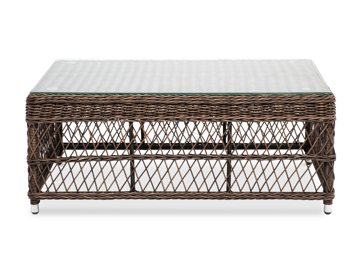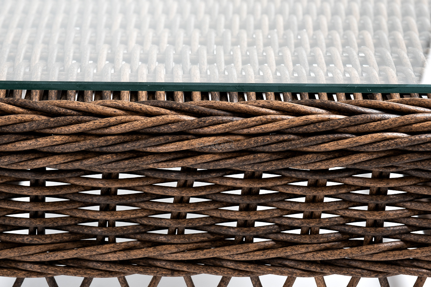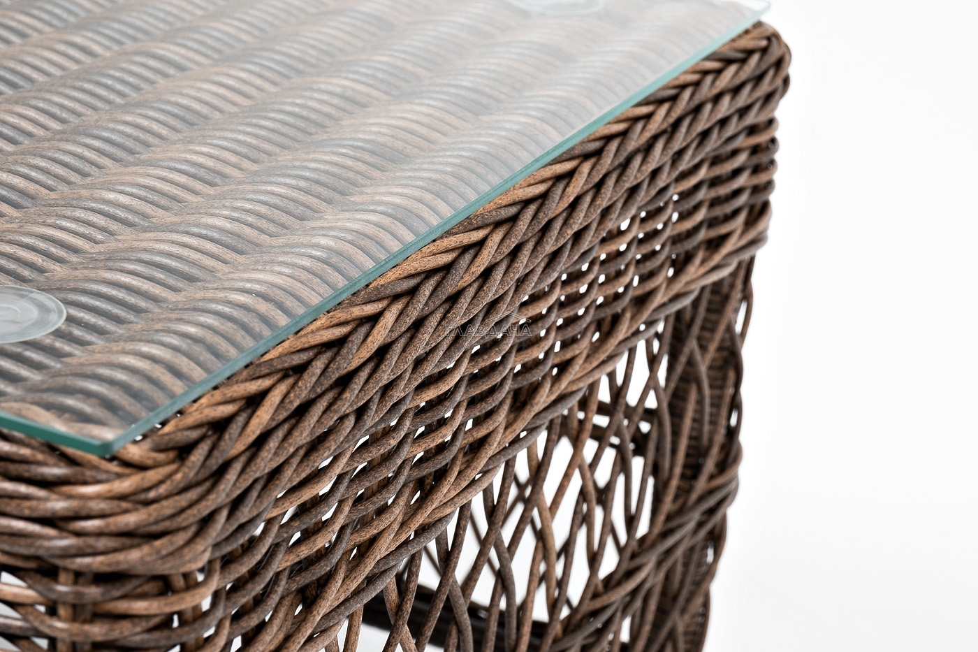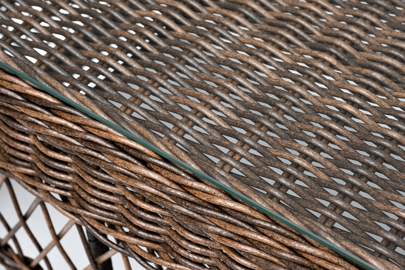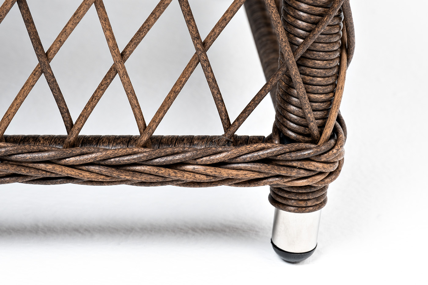 Каркас изготолен из алюминия, который гарантирует устойчивость при размещении на любой поверхности. В качестве декоративного элемента выступает ручная оплетка на основе круглого искусственного ротанга, представленного в коричневом оттенке.