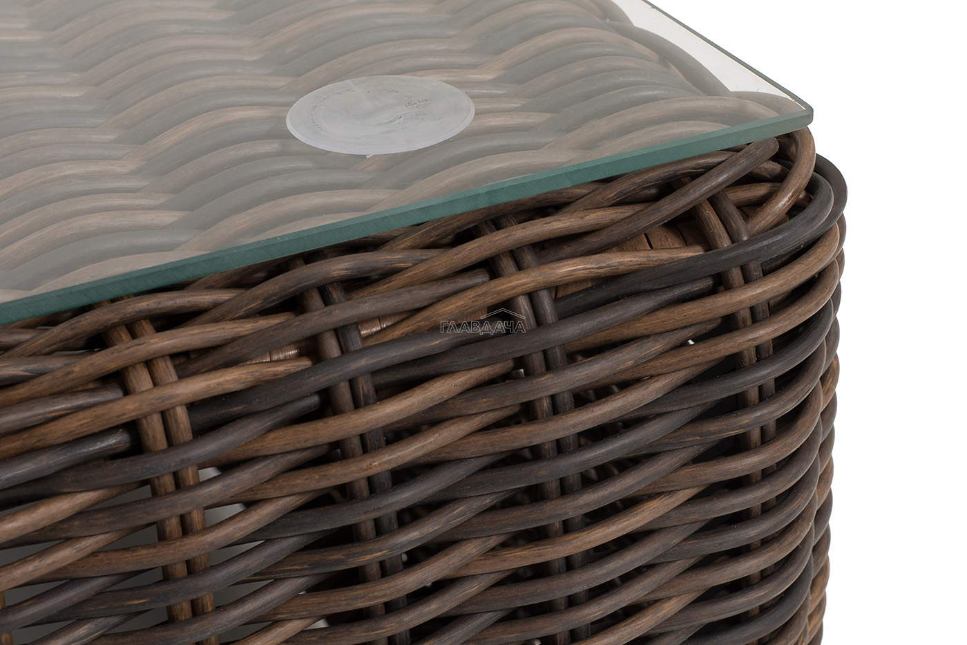 Размер модели – 950×950×370 мм. Ее каркас сделан из высокопрочного алюминия, который оплетен искусственным ротангом с помощью ручного круглого плетения. Столик представлен в коричневом цвете.