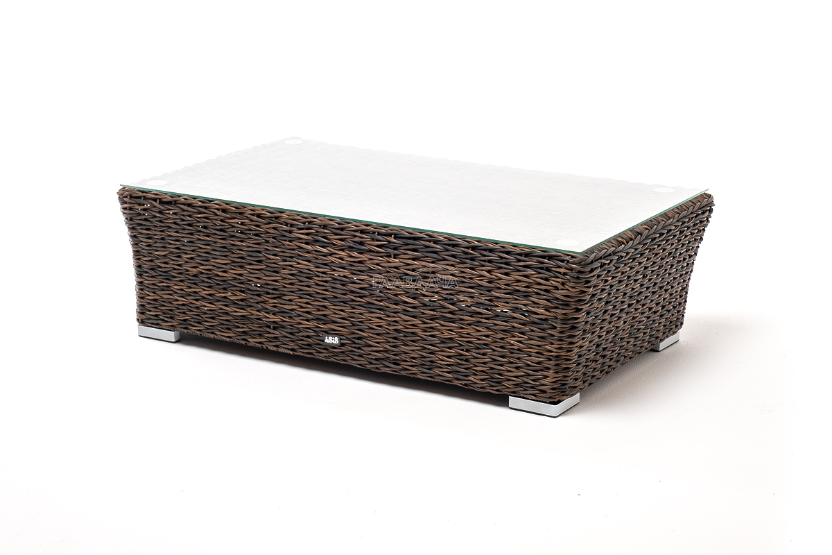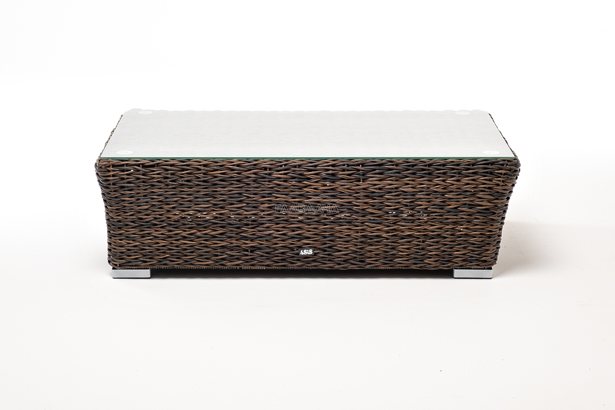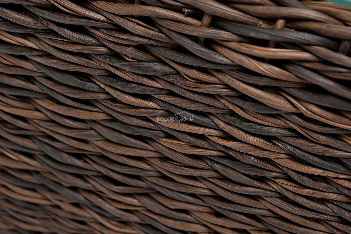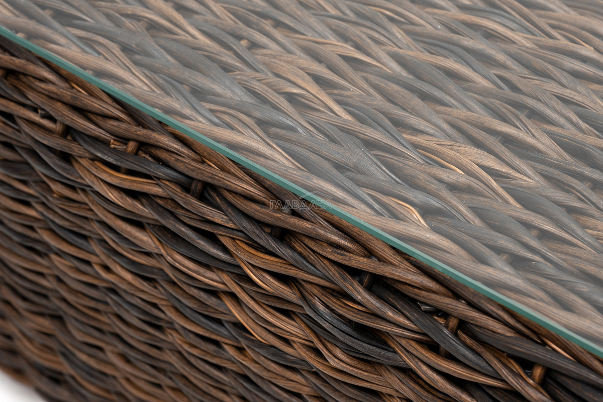 Размер модели – 1100×660×340 мм. Устойчивость и прочность ей придает каркас, выполненный из высококачественного алюминия. Каркас оплетен вручную с помощью искусственного ротанга вида "гиацинт". Мебель выполнена в коричневом цвете.