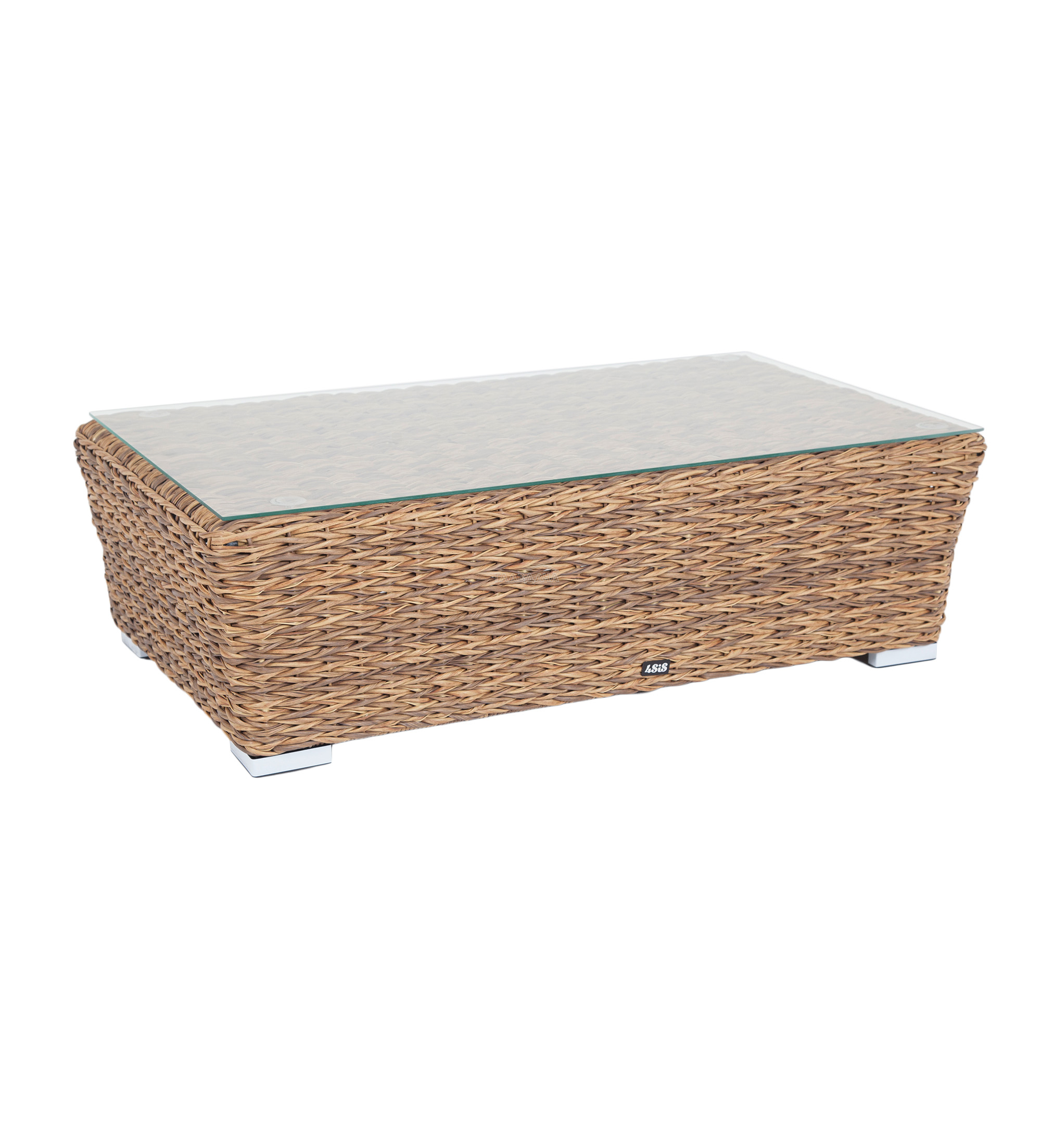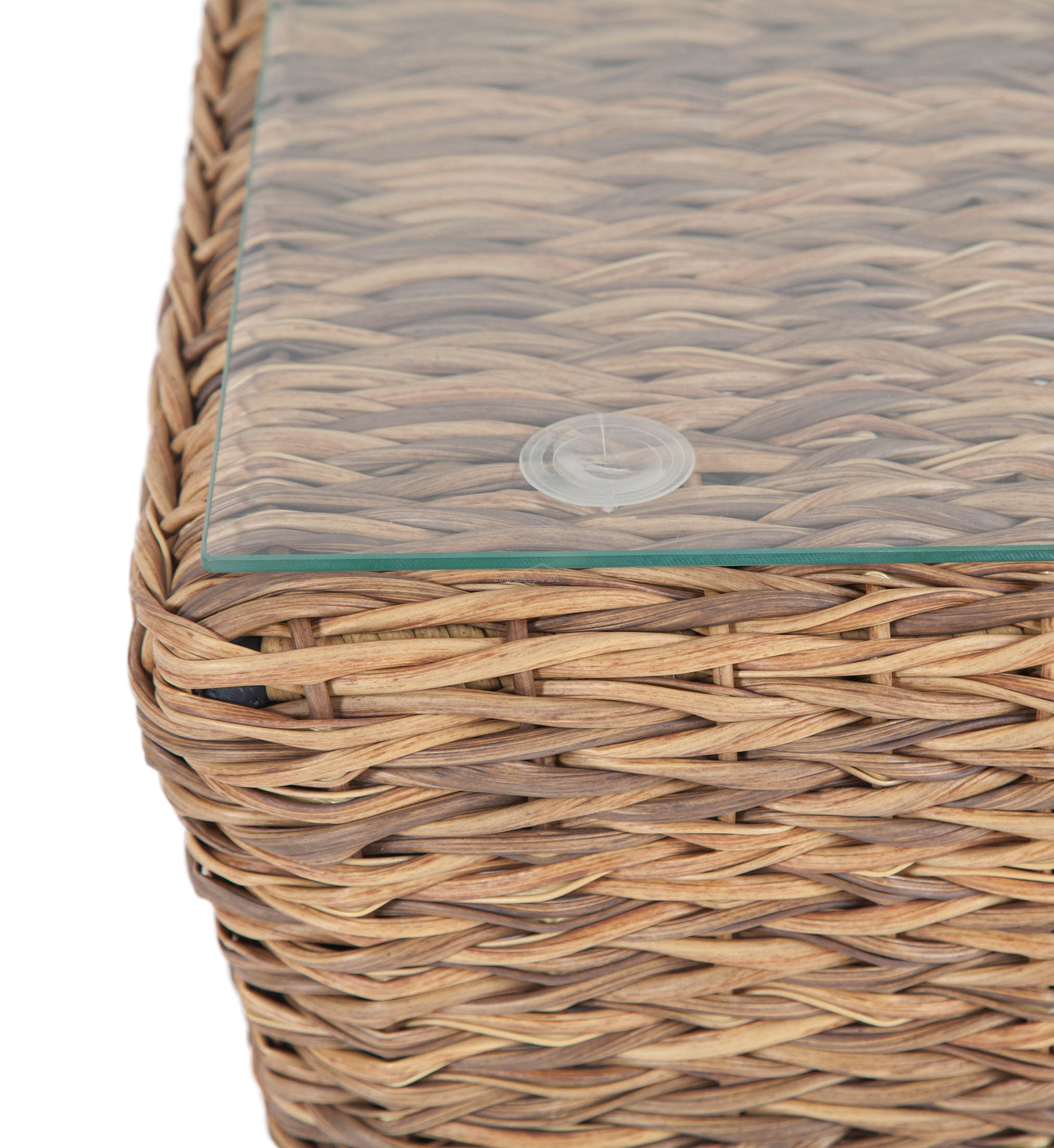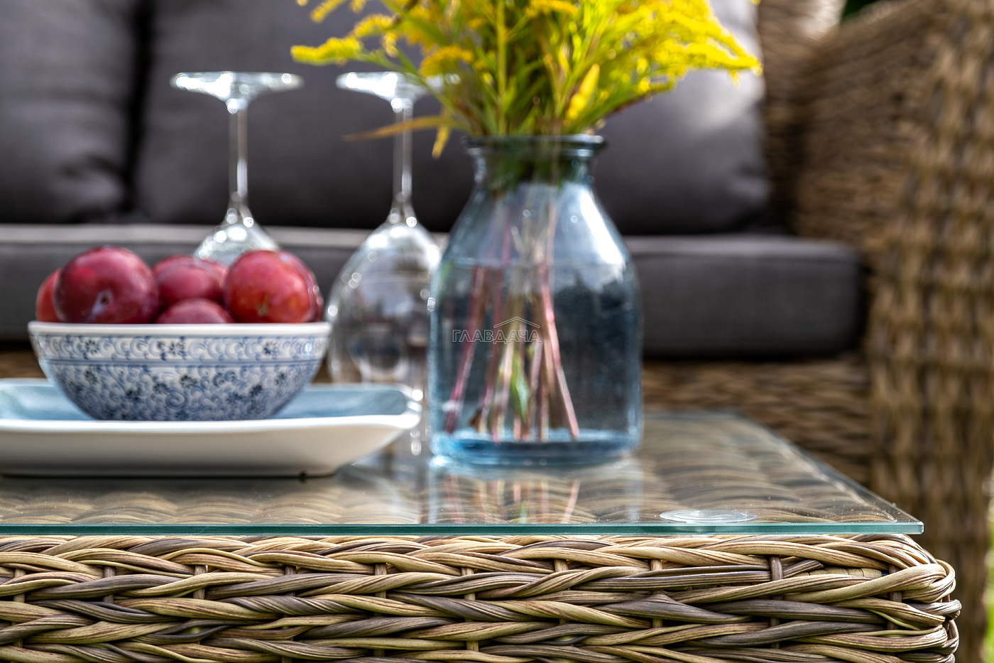 Размер модели – 1100×660×340 мм. Устойчивость и прочность ей придает каркас, выполненный из высококачественного алюминия. Каркас оплетен вручную с помощью искусственного ротанга вида "гиацинт". Мебель выполнена в соломенном цвете.