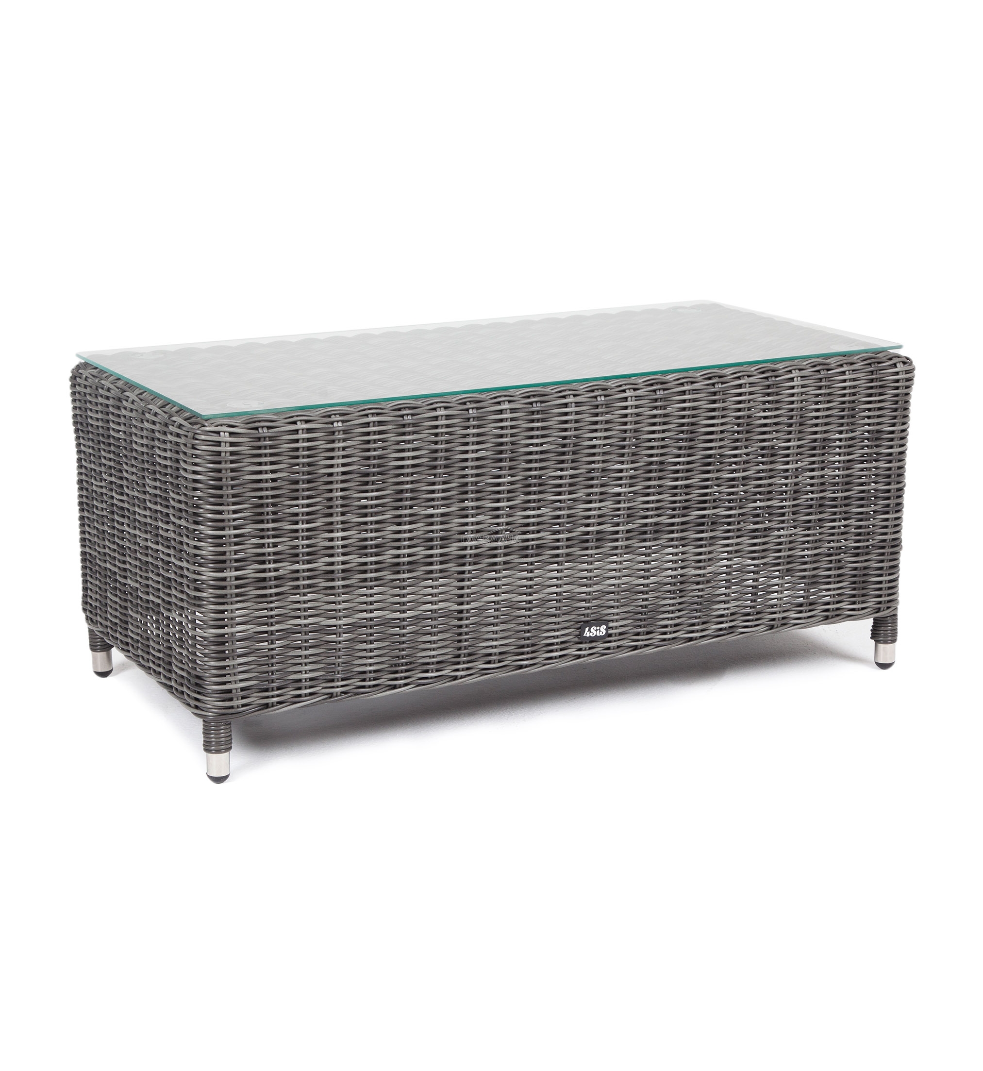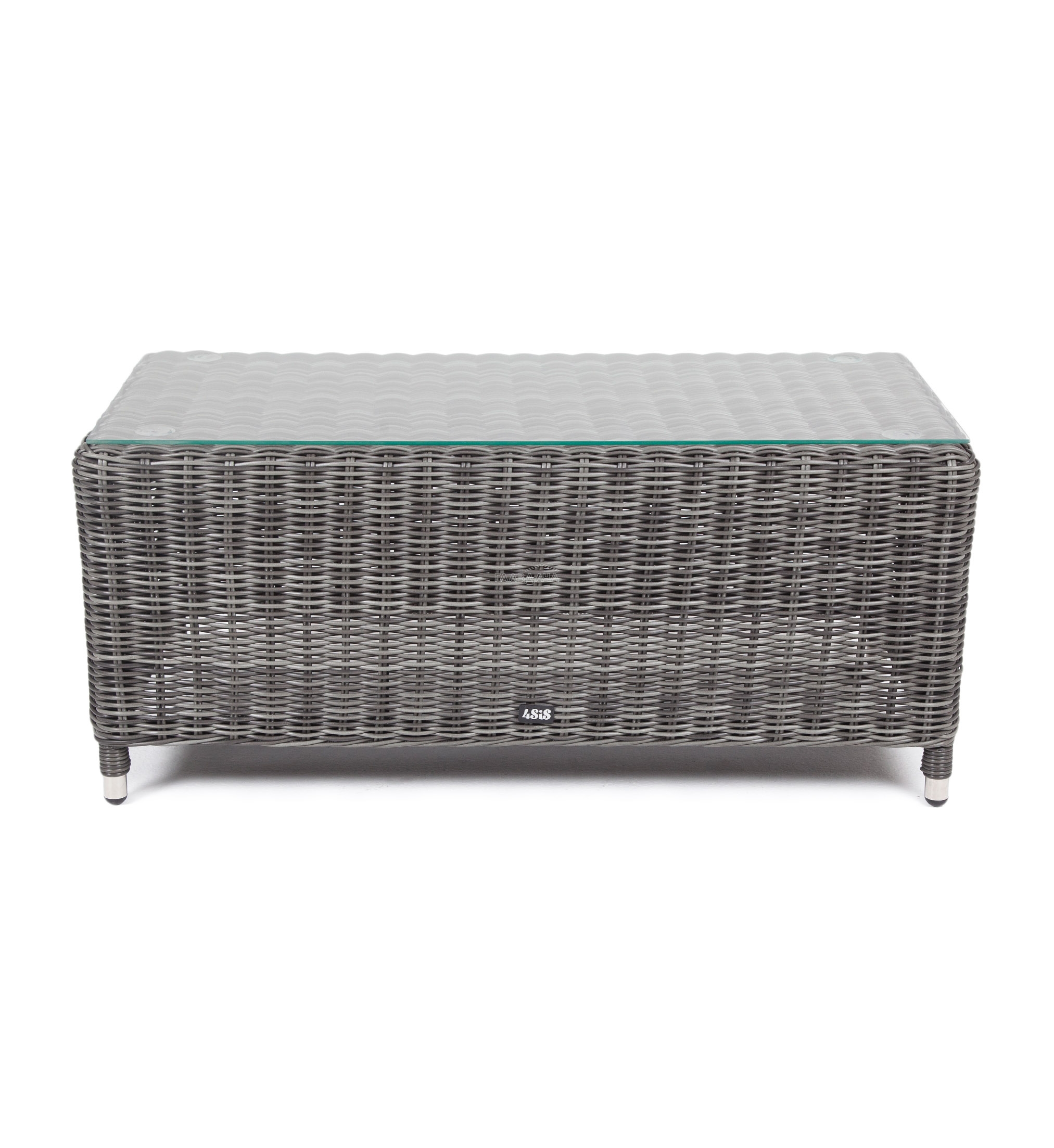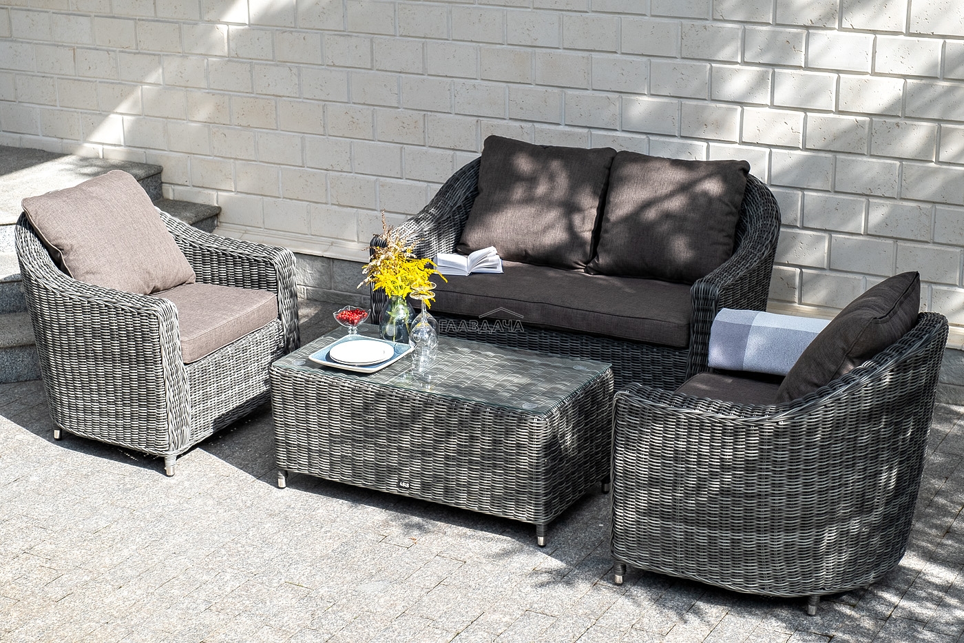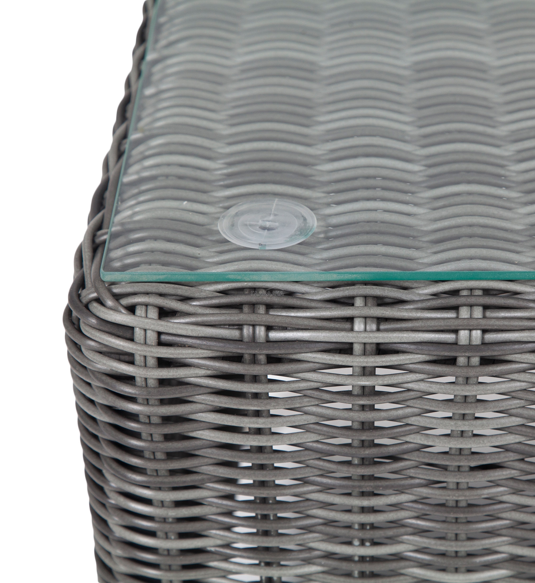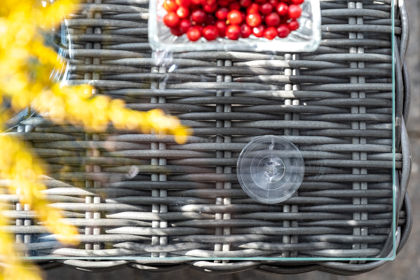 В основе мебели находится алюминиевый каркас высокой прочности. Декоративной составляющей является ручная круглая оплетка, которая выполнена из искусственного ротанга. Столик представлен в цвете "графит".
