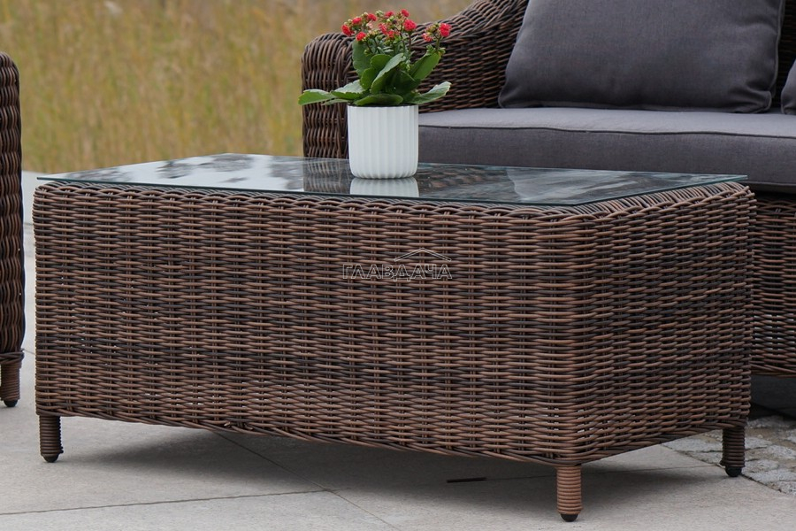 В основе мебели находится алюминиевый каркас высокой прочности. Декоративной составляющей является ручная круглая оплетка, которая выполнена из искусственного ротанга. Столик представлен в шоколадном цвете.