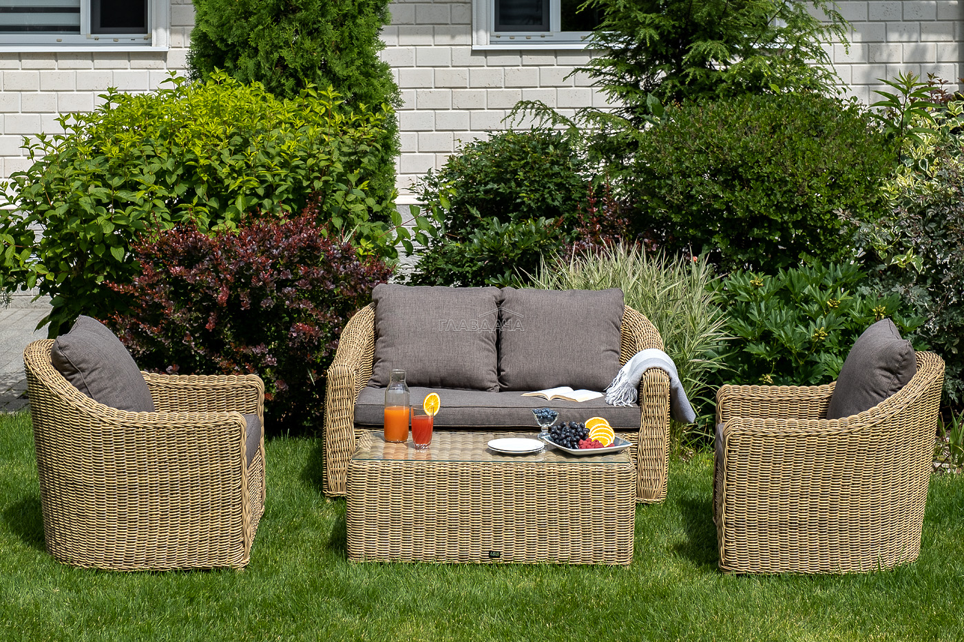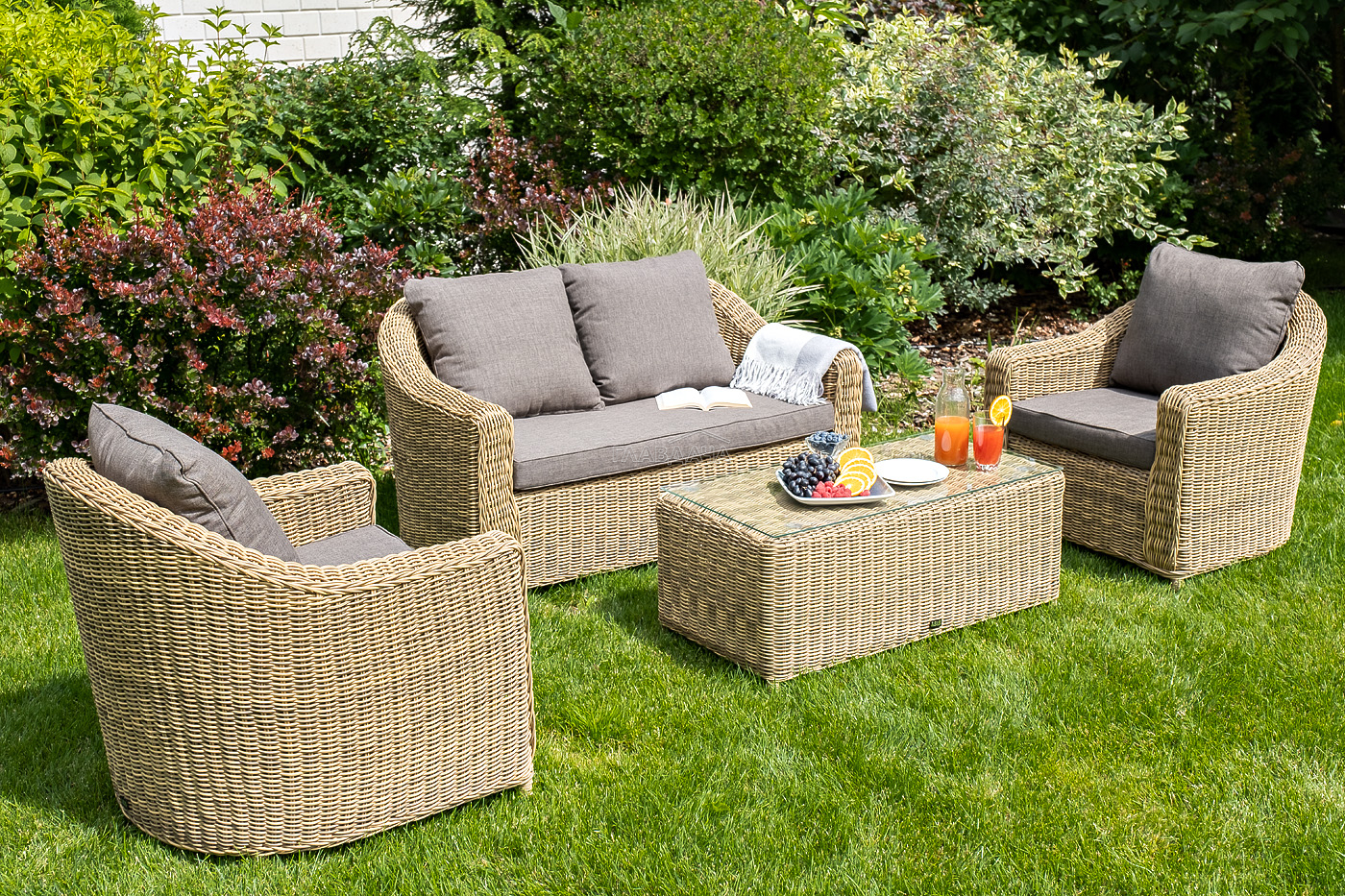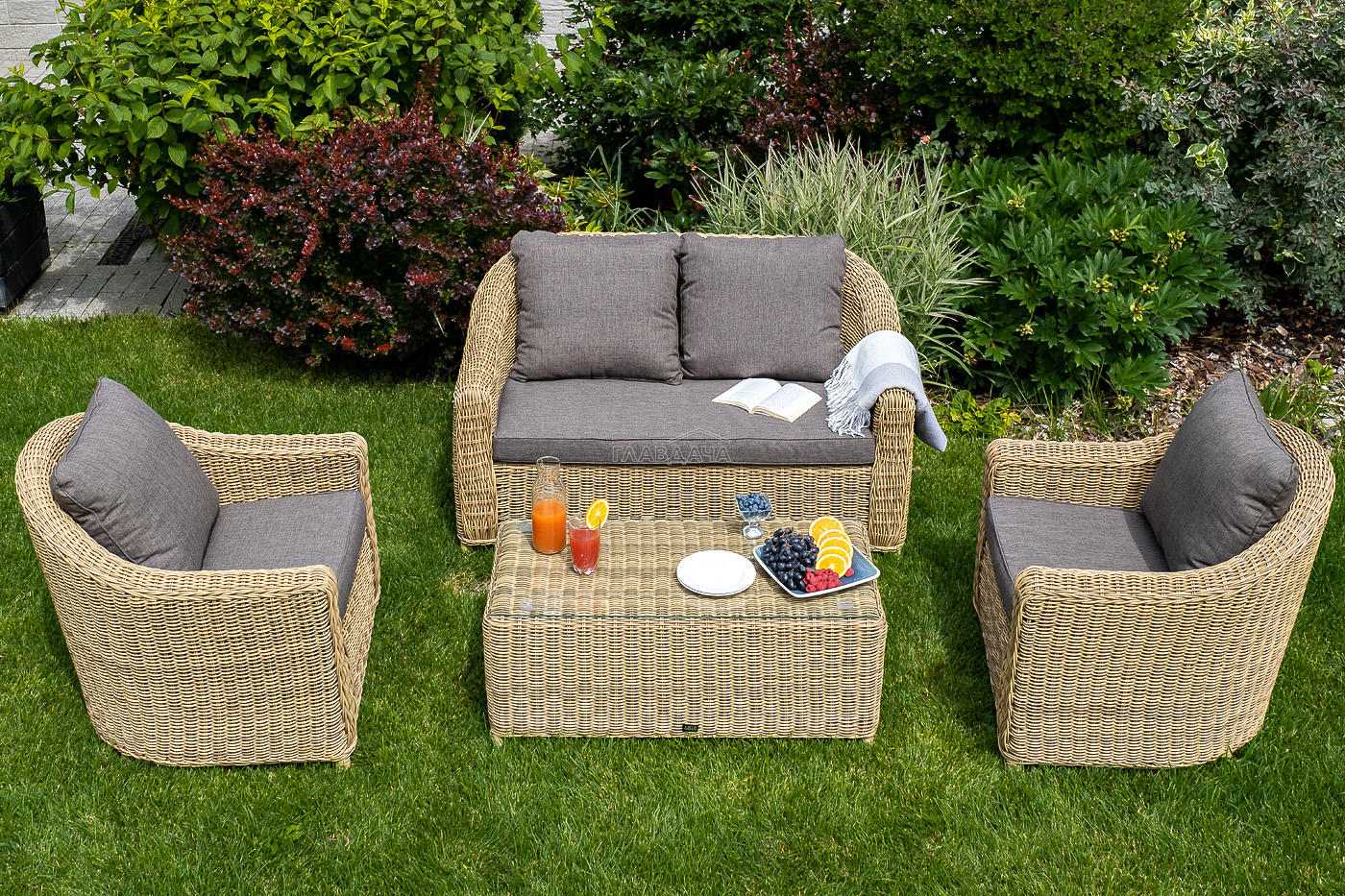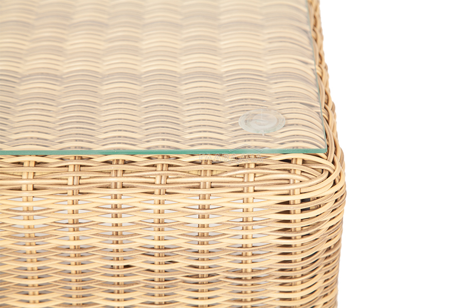 Журнальный столик из круглого искусственного ротанга «Кон Панна» соломенного цвета, подходит для эксплуатации при различных погодных условиях.