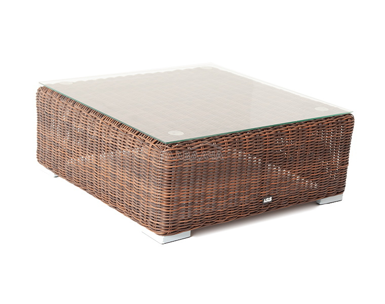 Размер модели – 740×740×300 мм. Ее каркас сделан из высокопрочного алюминия, который оплетен искусственным ротангом с помощью ручного круглого плетения. Столик представлен в коричневом цвете.