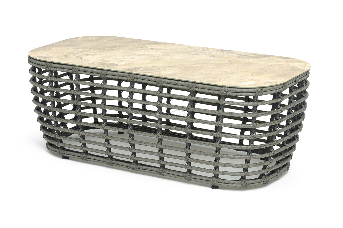 Каркас столика изготовлен из алюминия, вручную оплетенного круглым искусственным ротангом.