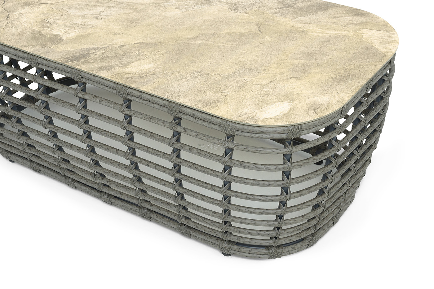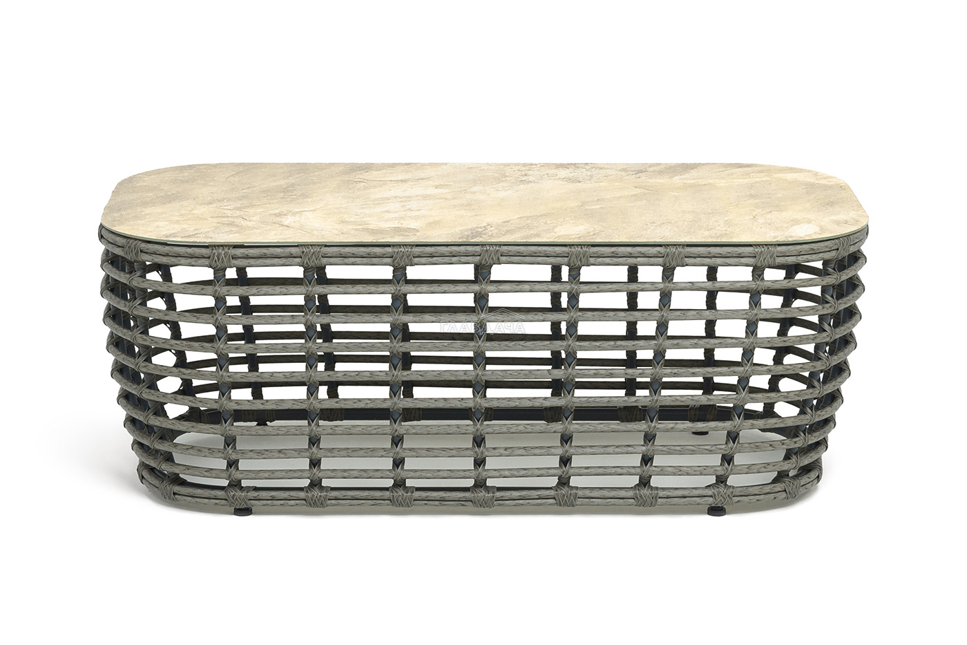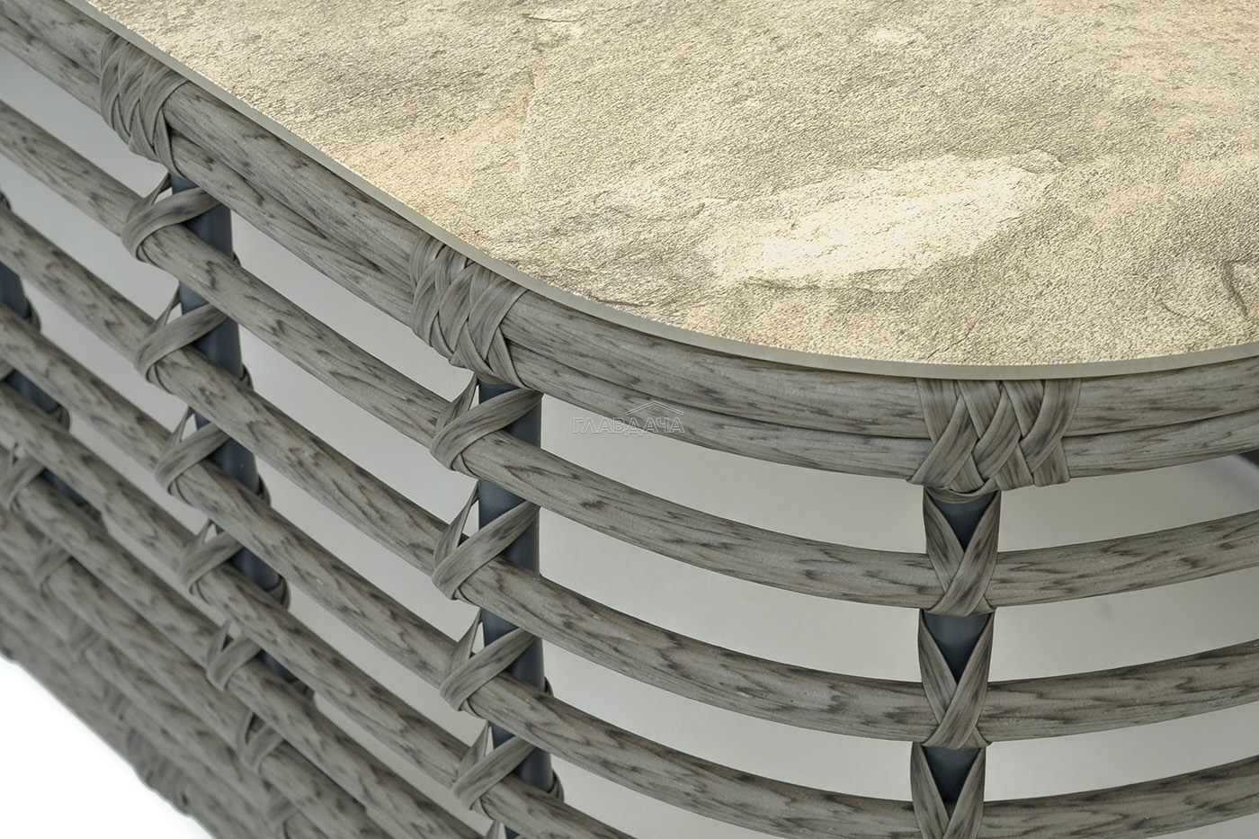 Плетеный столик представлен в сером цвете.