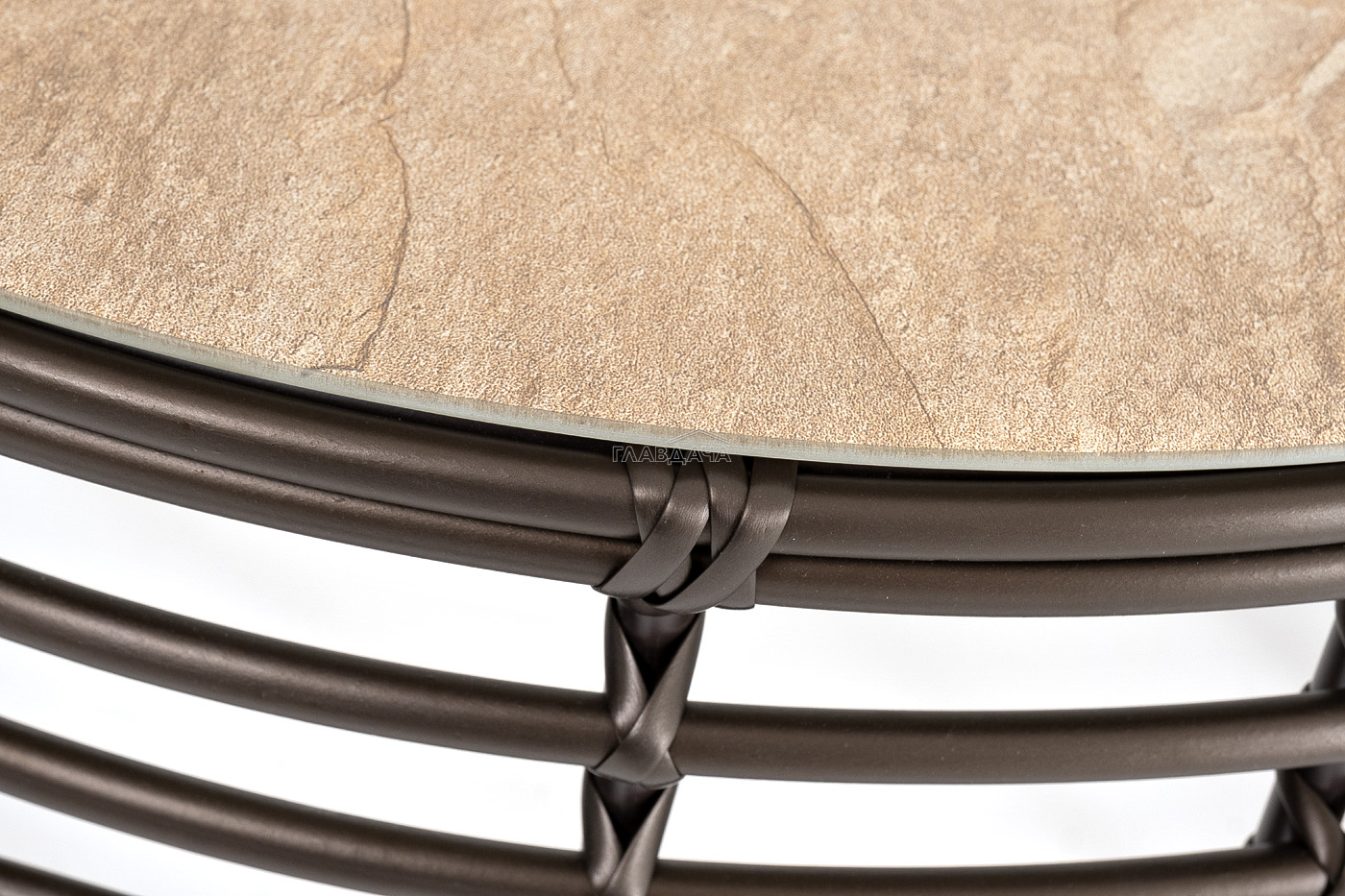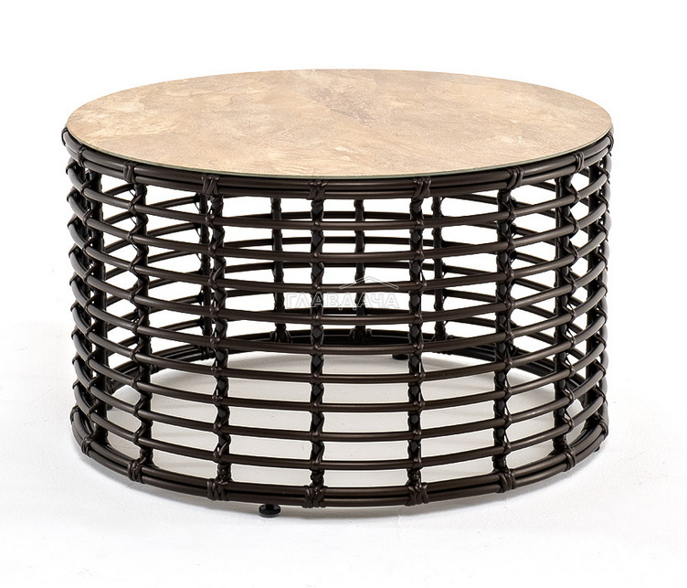 Каркас столика изготовлен из алюминия, вручную оплетенного круглым искусственным ротангом.
