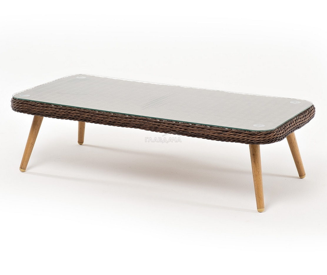 Алюминиевый каркас имеет цвет натурального дерева. Столик дополняет декоративная оплетка, при изготовлении которой используется круглый искусственный ротанг. Она представлена в коричневом цвете.
