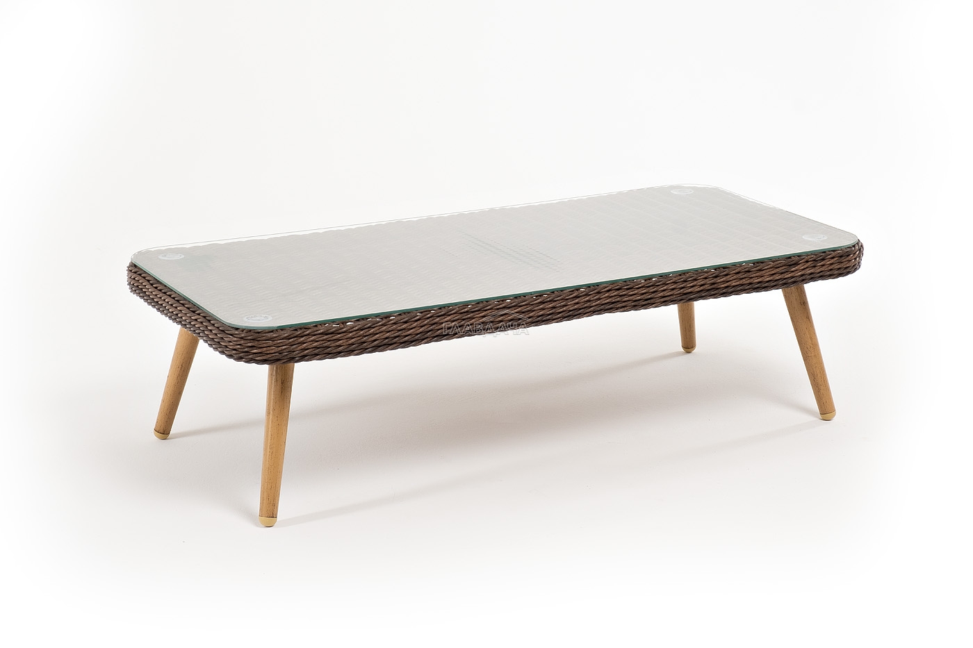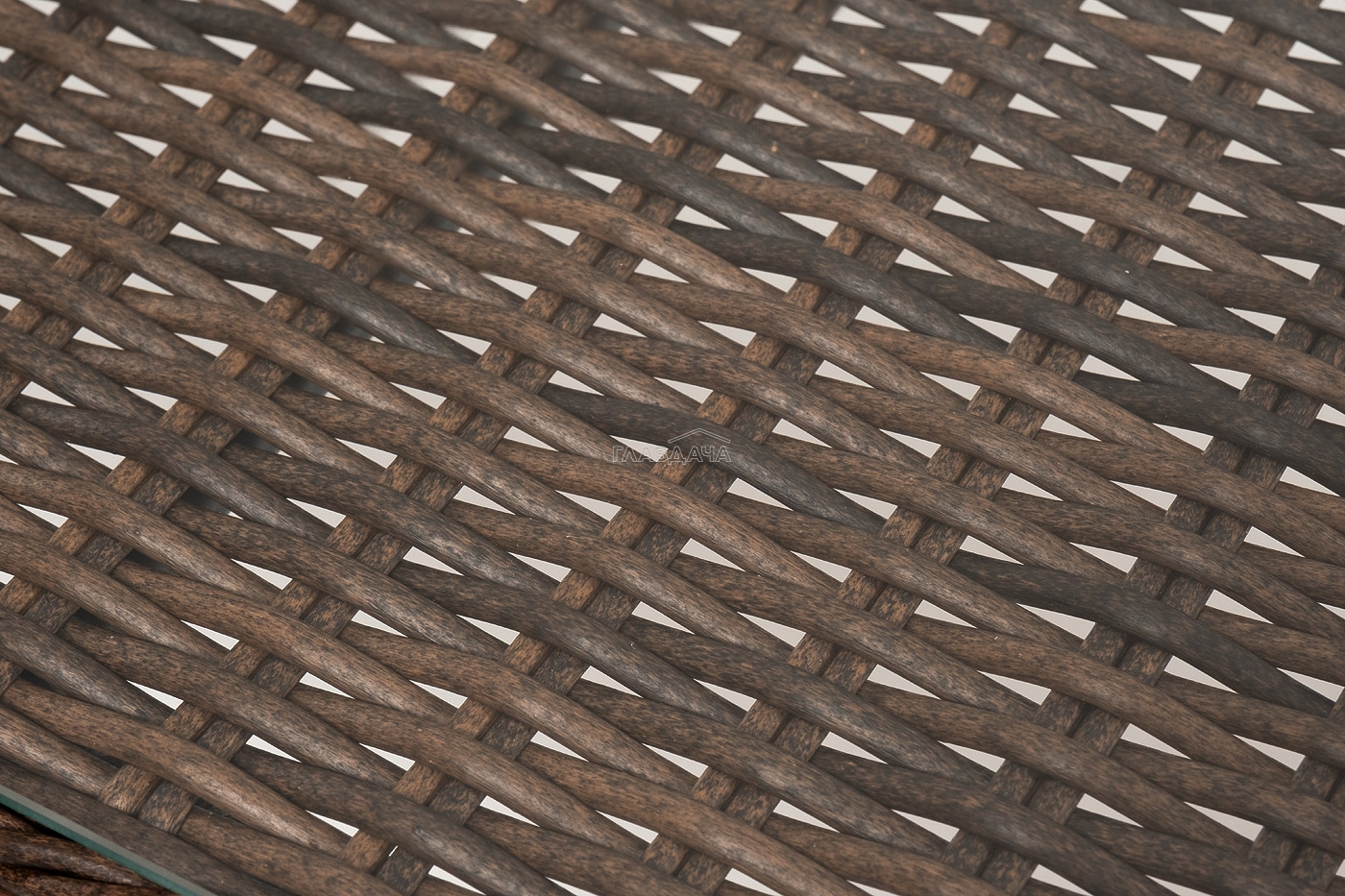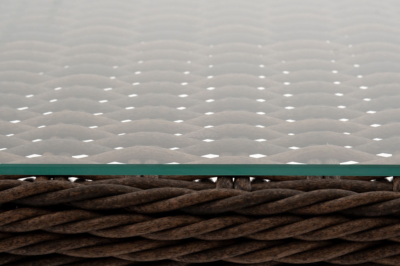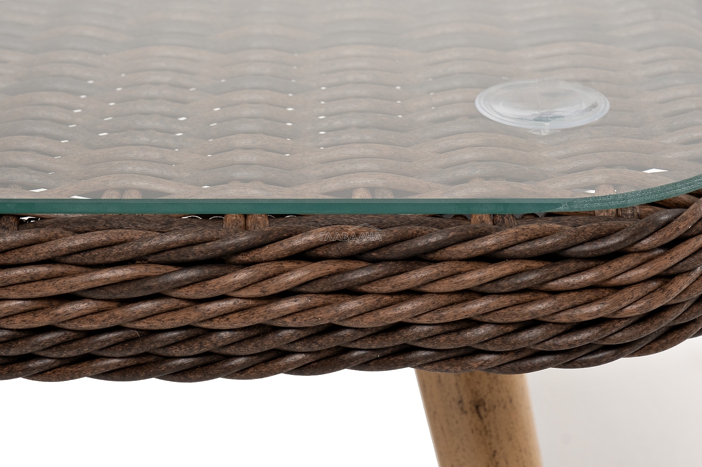 Столешницу из ротангового плетения дополняет прочное стекло, используемое для изготовления мебели. Стекло крепится с помощью держателей на силиконовых присосках и транспортируется в собранном виде.