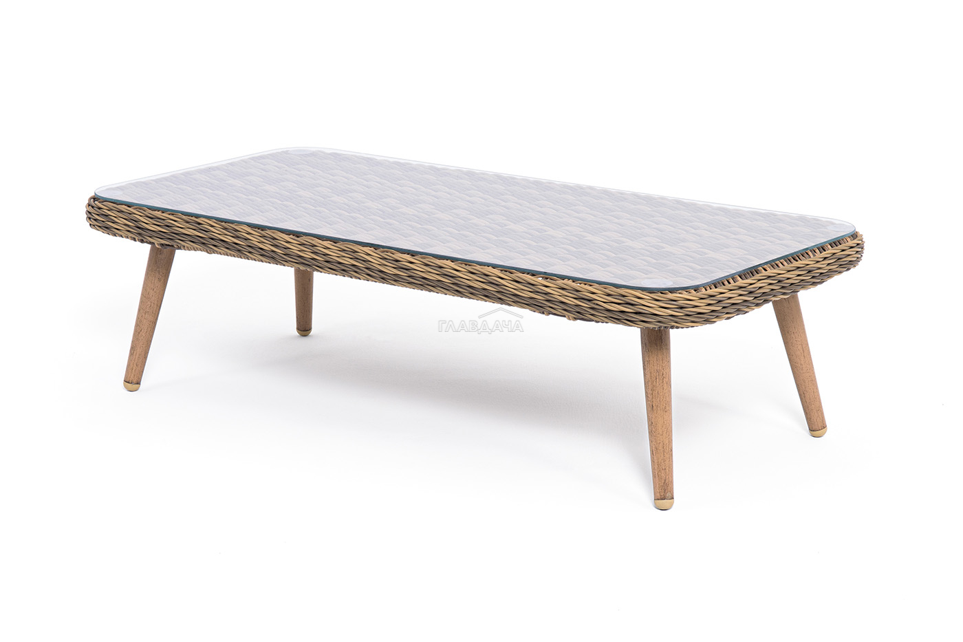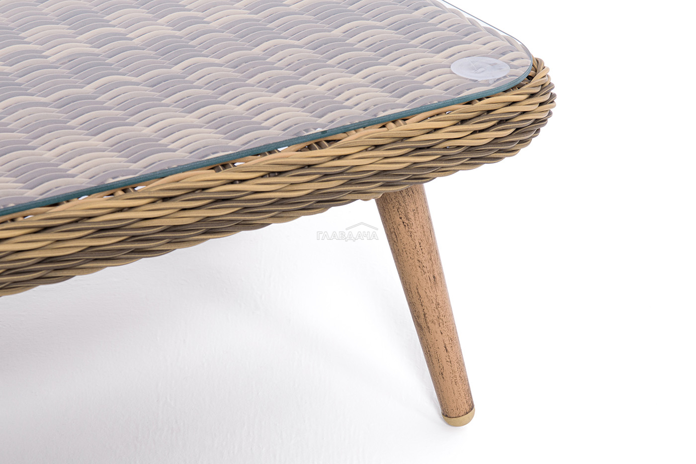 Алюминиевый каркас имеет цвет натурального дерева. Столик дополняет декоративная оплетка, при изготовлении которой используется круглый искусственный ротанг. Она представлена в соломенном цвете.