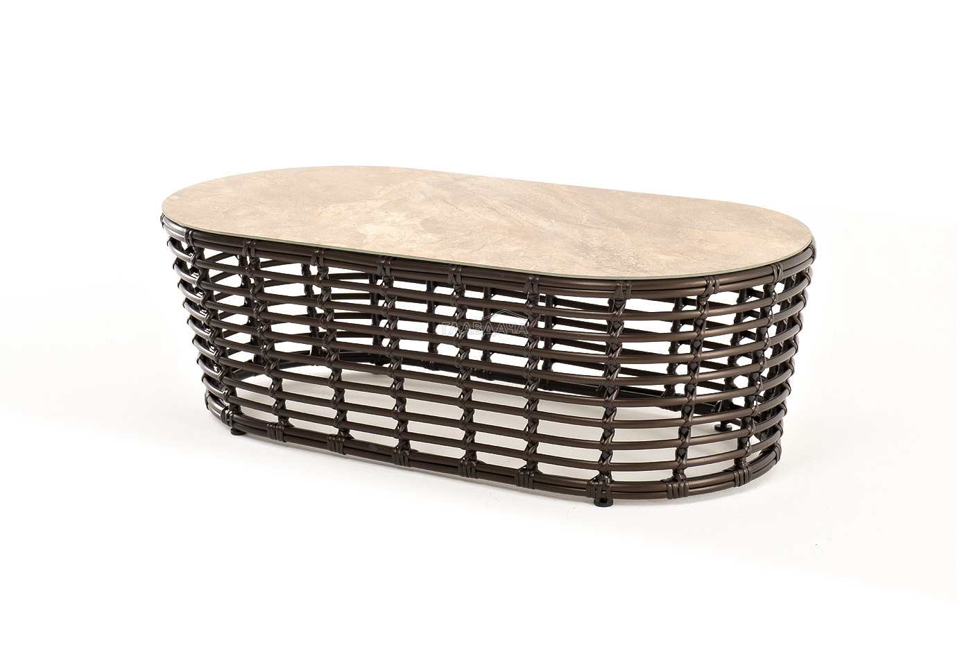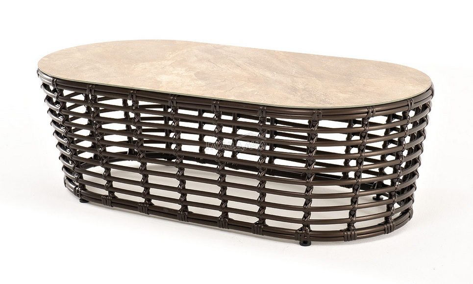 Каркас столика изготовлен из алюминия, вручную оплетенного круглым искусственным ротангом.