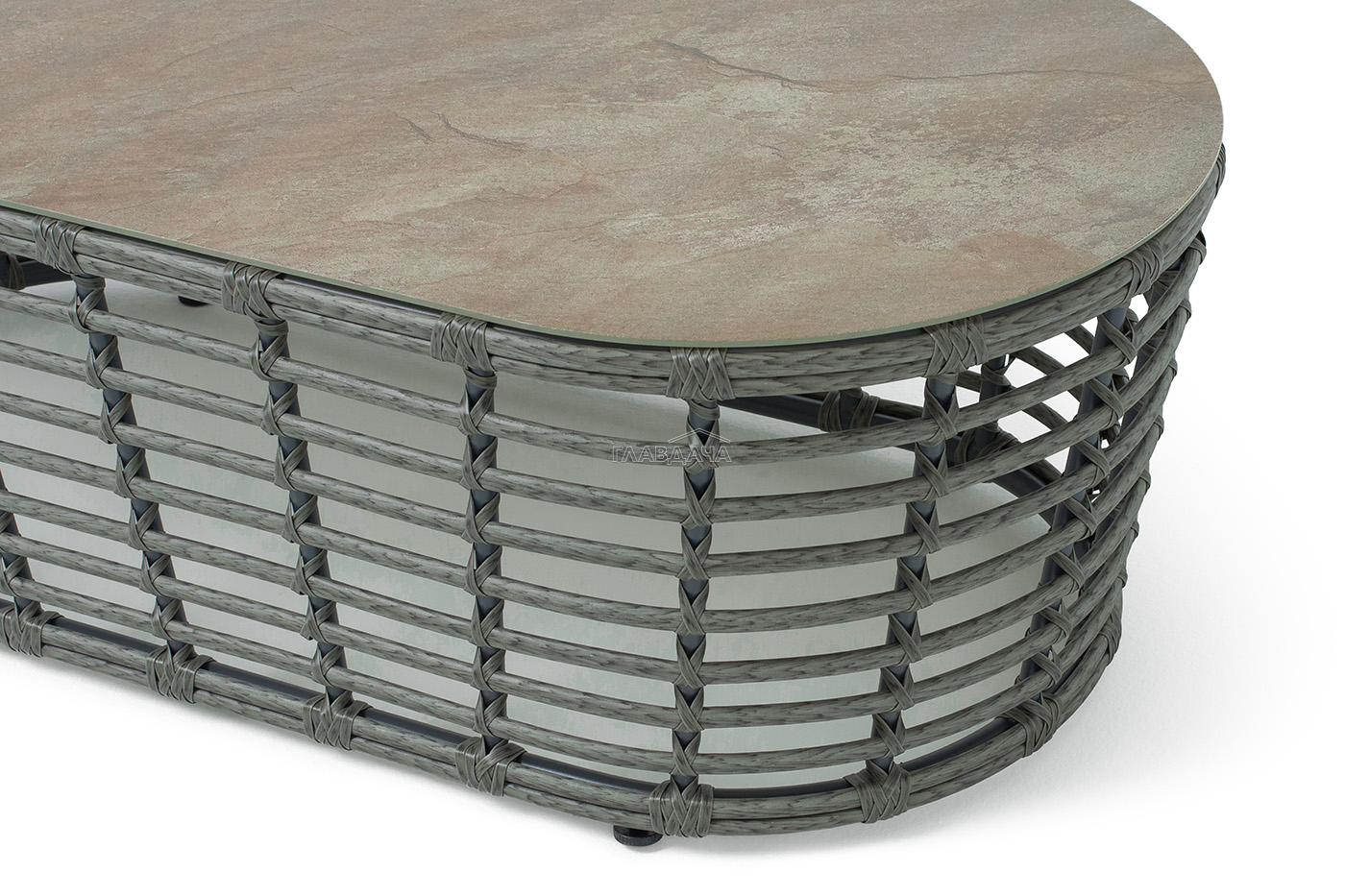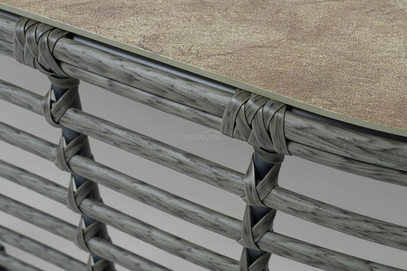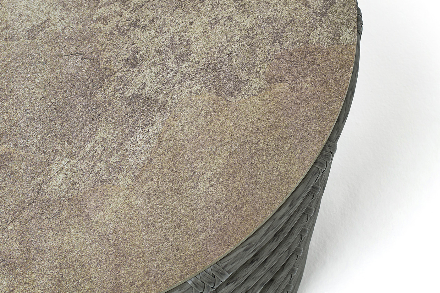 Каркас столика изготовлен из алюминия, вручную оплетенного круглым искусственным ротангом.
