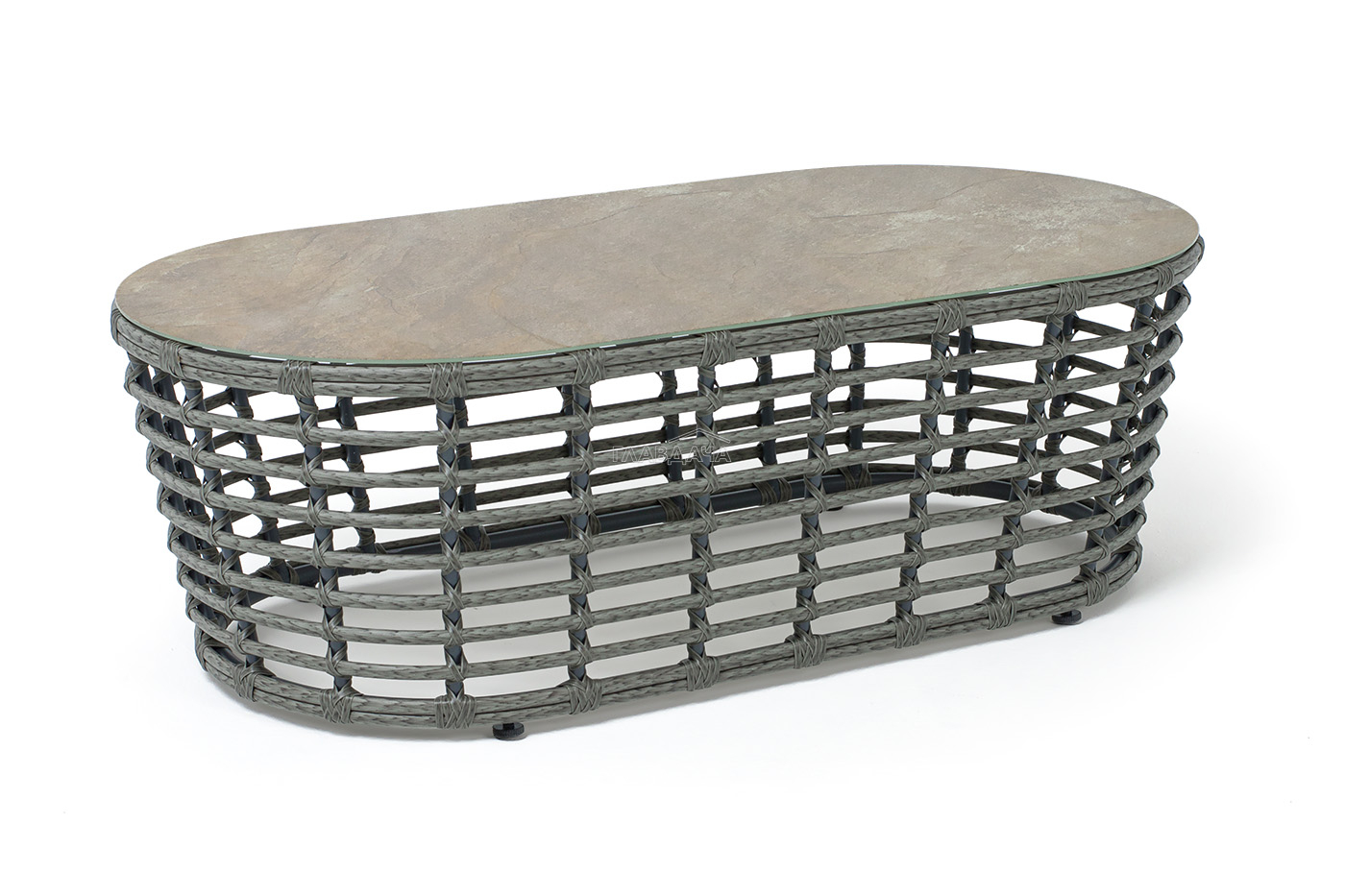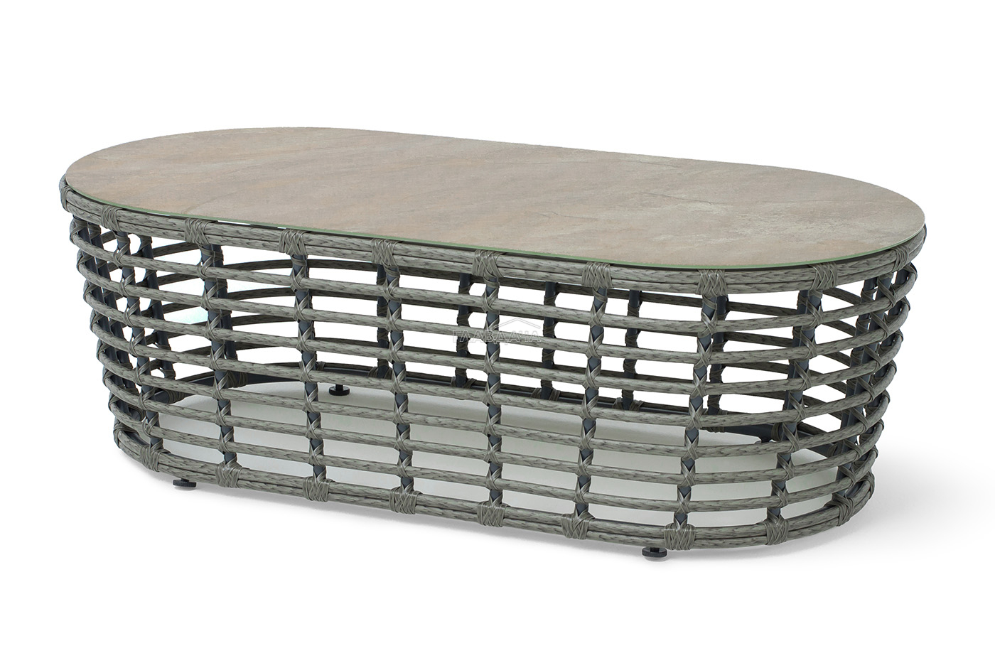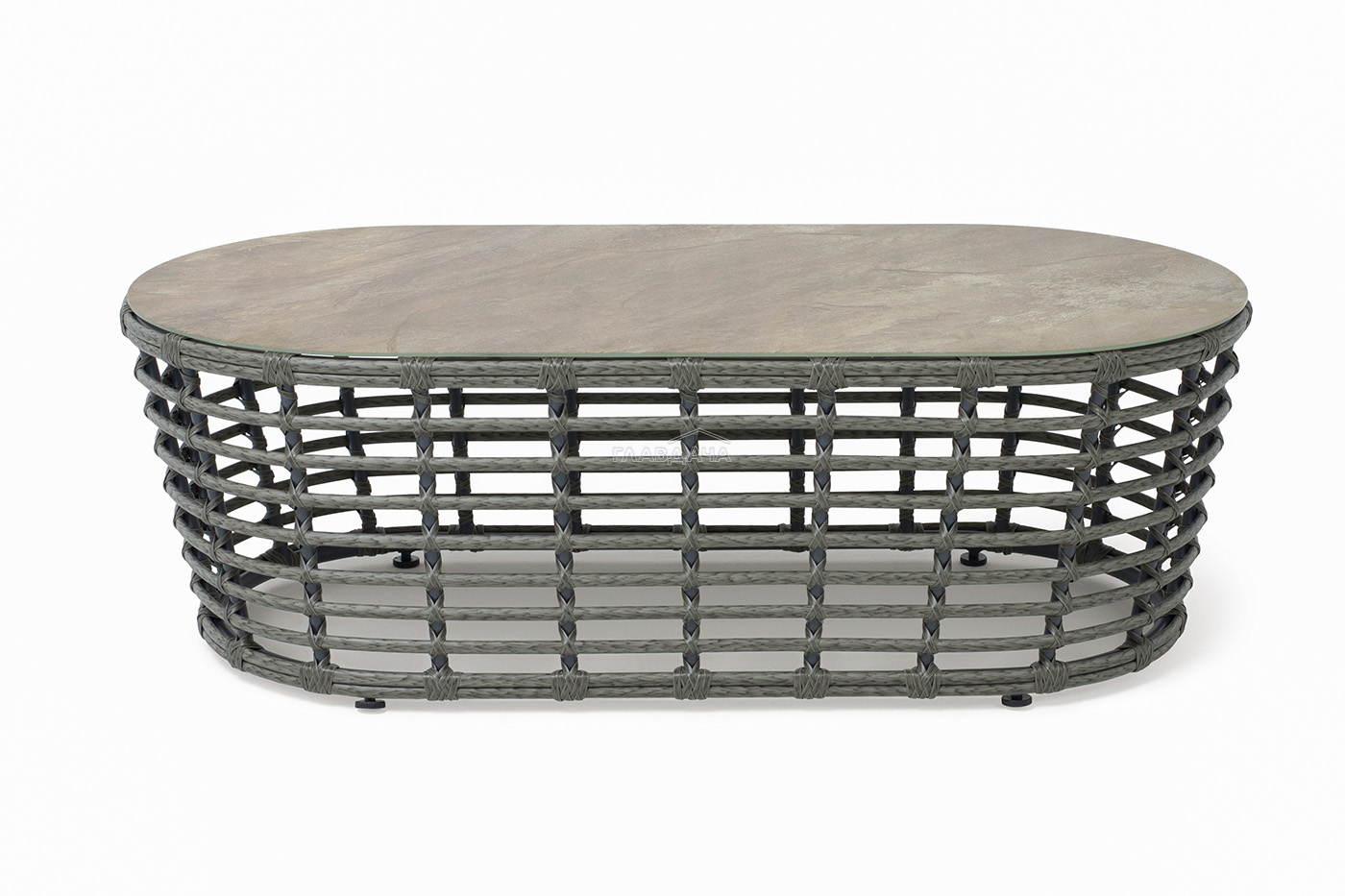 Каркас столика изготовлен из алюминия, вручную оплетенного круглым искусственным ротангом.