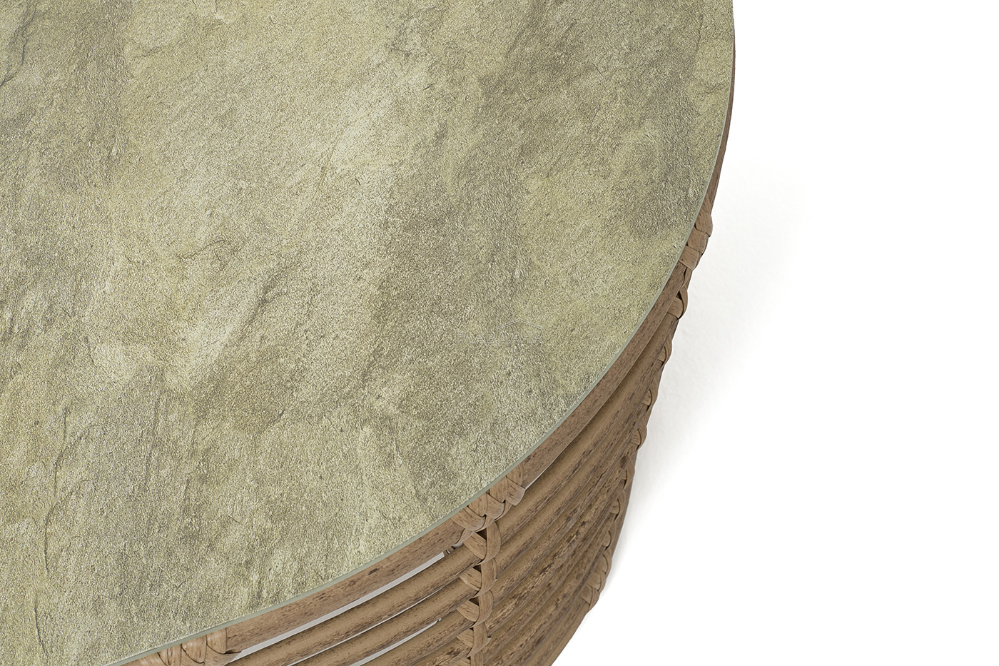 Каркас столика изготовлен из алюминия, вручную оплетенного круглым искусственным ротангом.