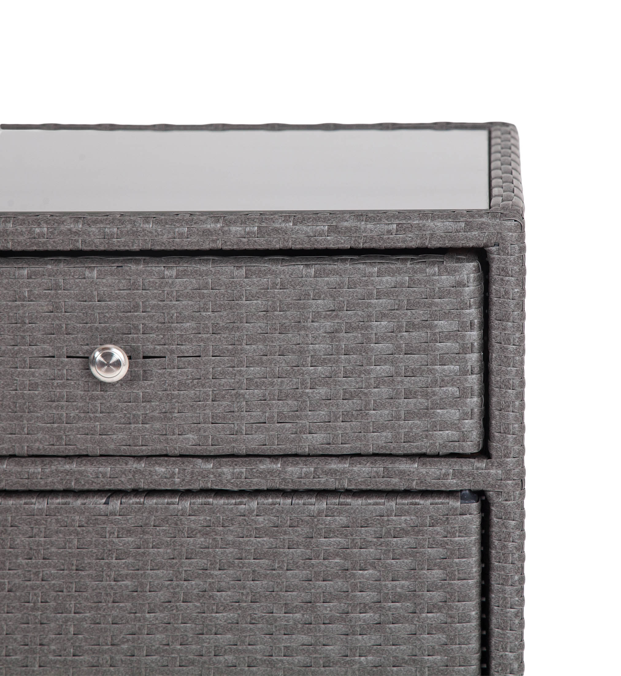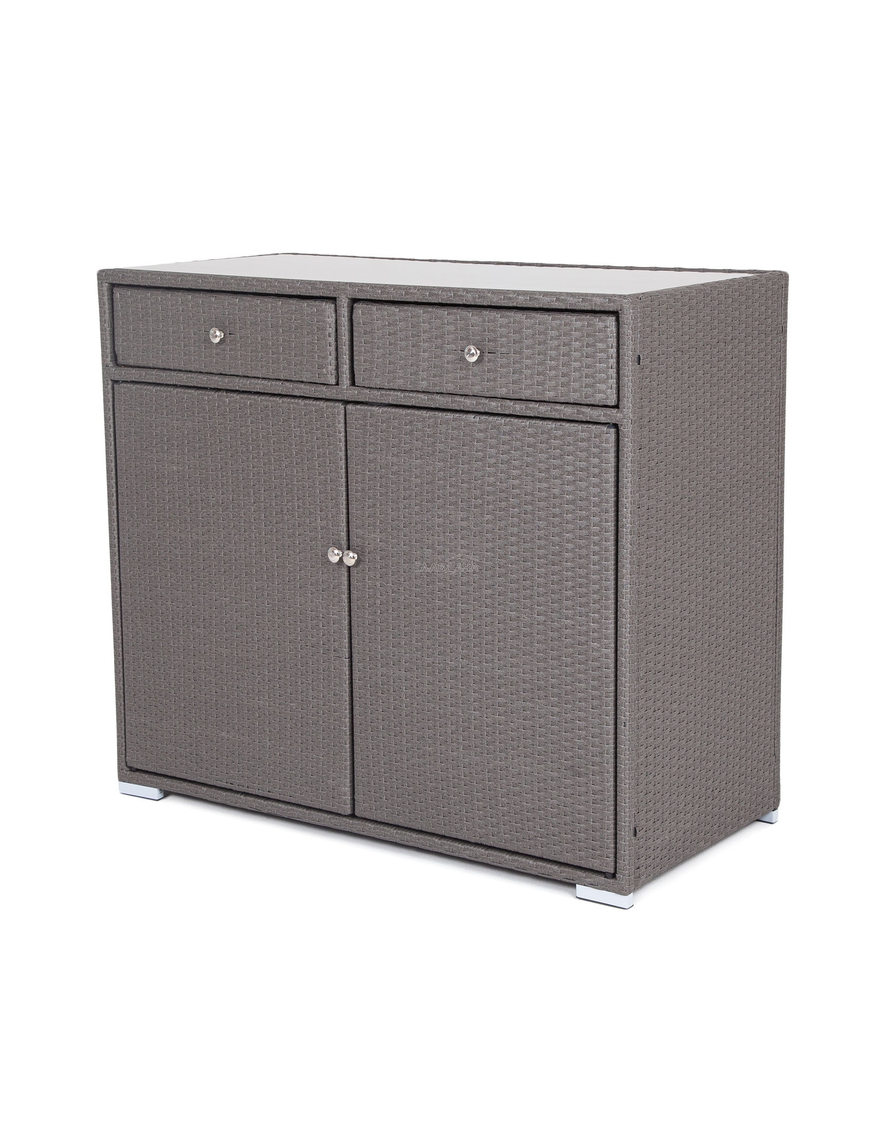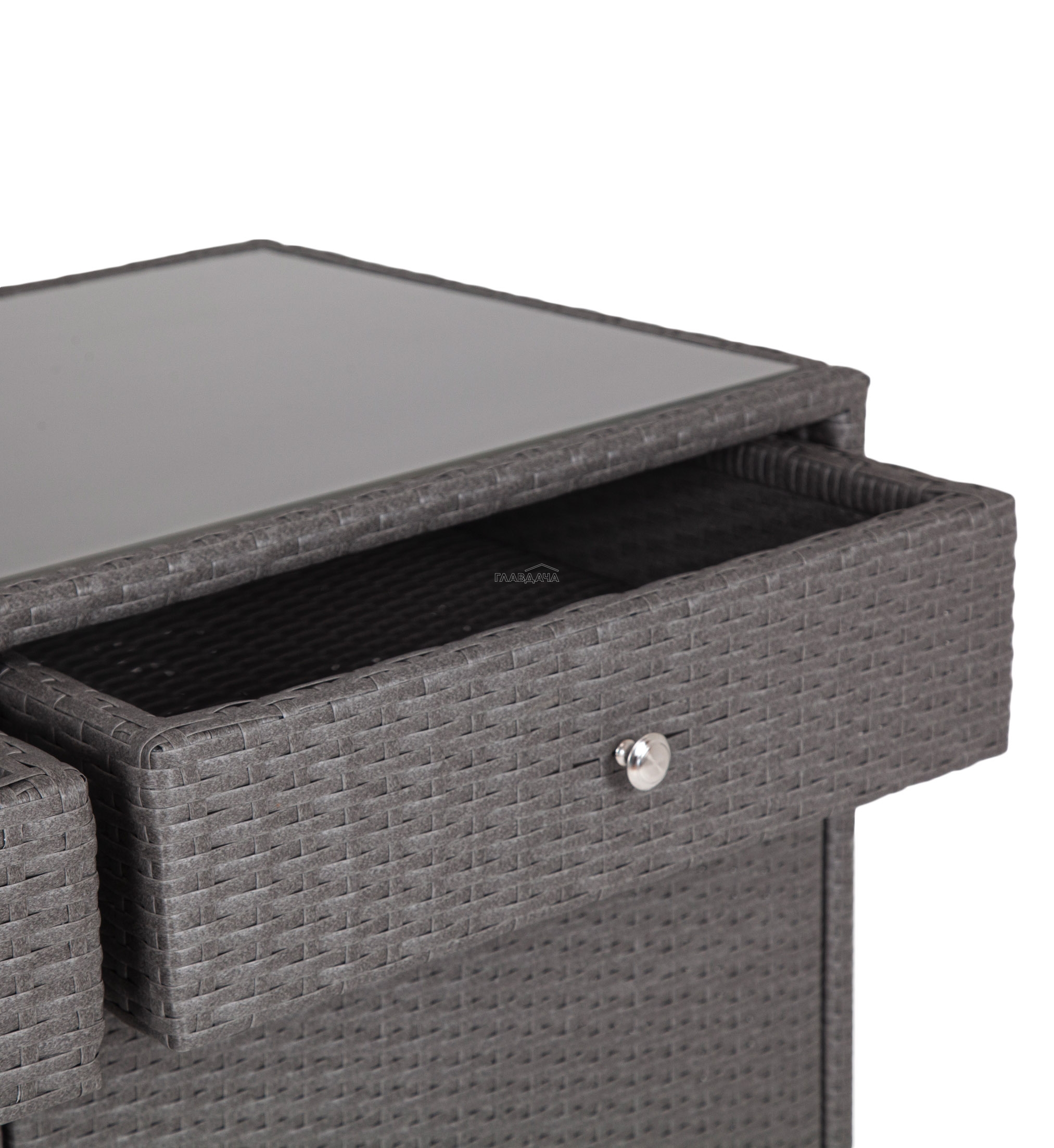 «Мальта» тумба изготовлена из алюминиевого каркаса, оплетенного плоским искусственным ротангом графитового цвета.