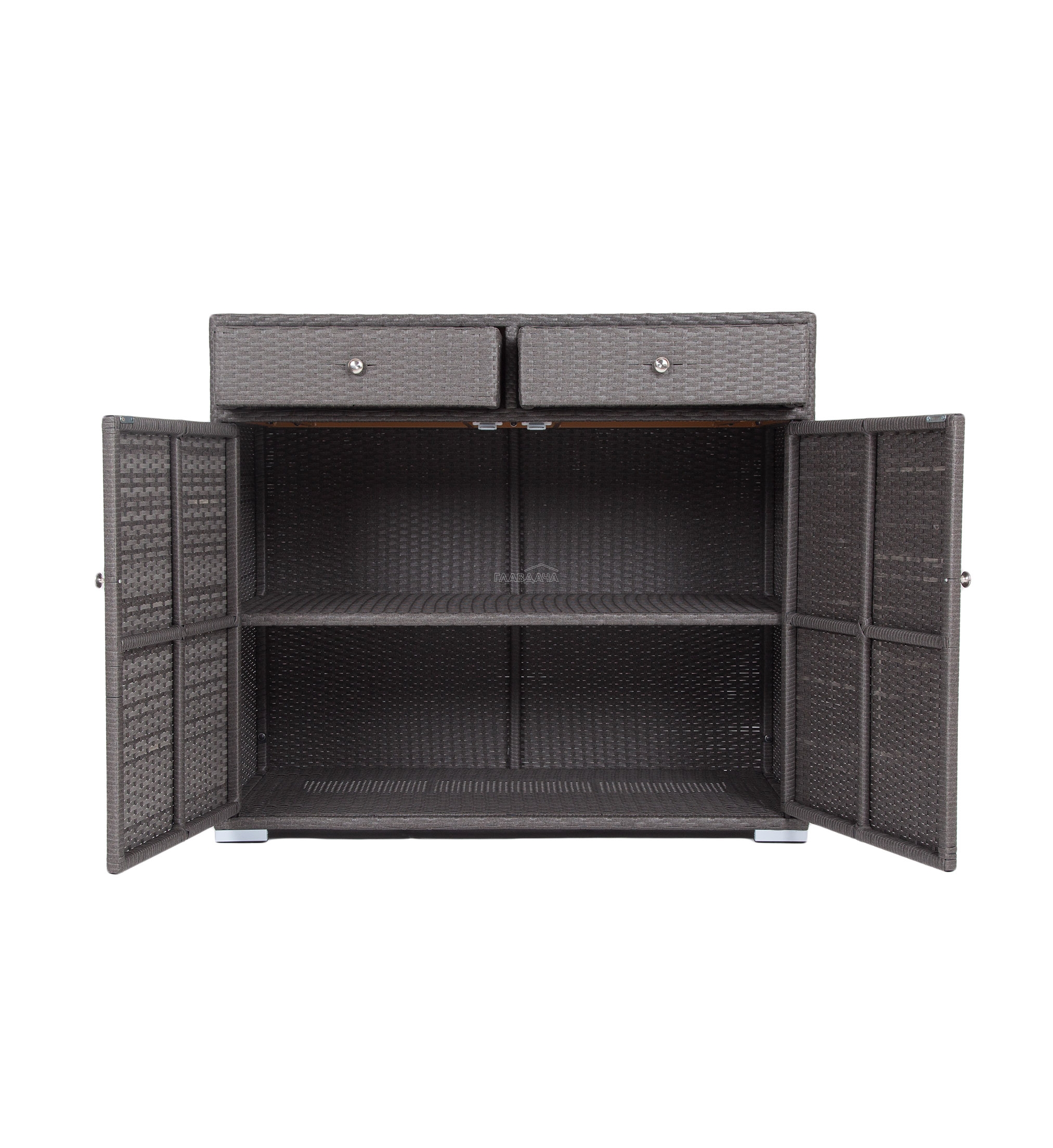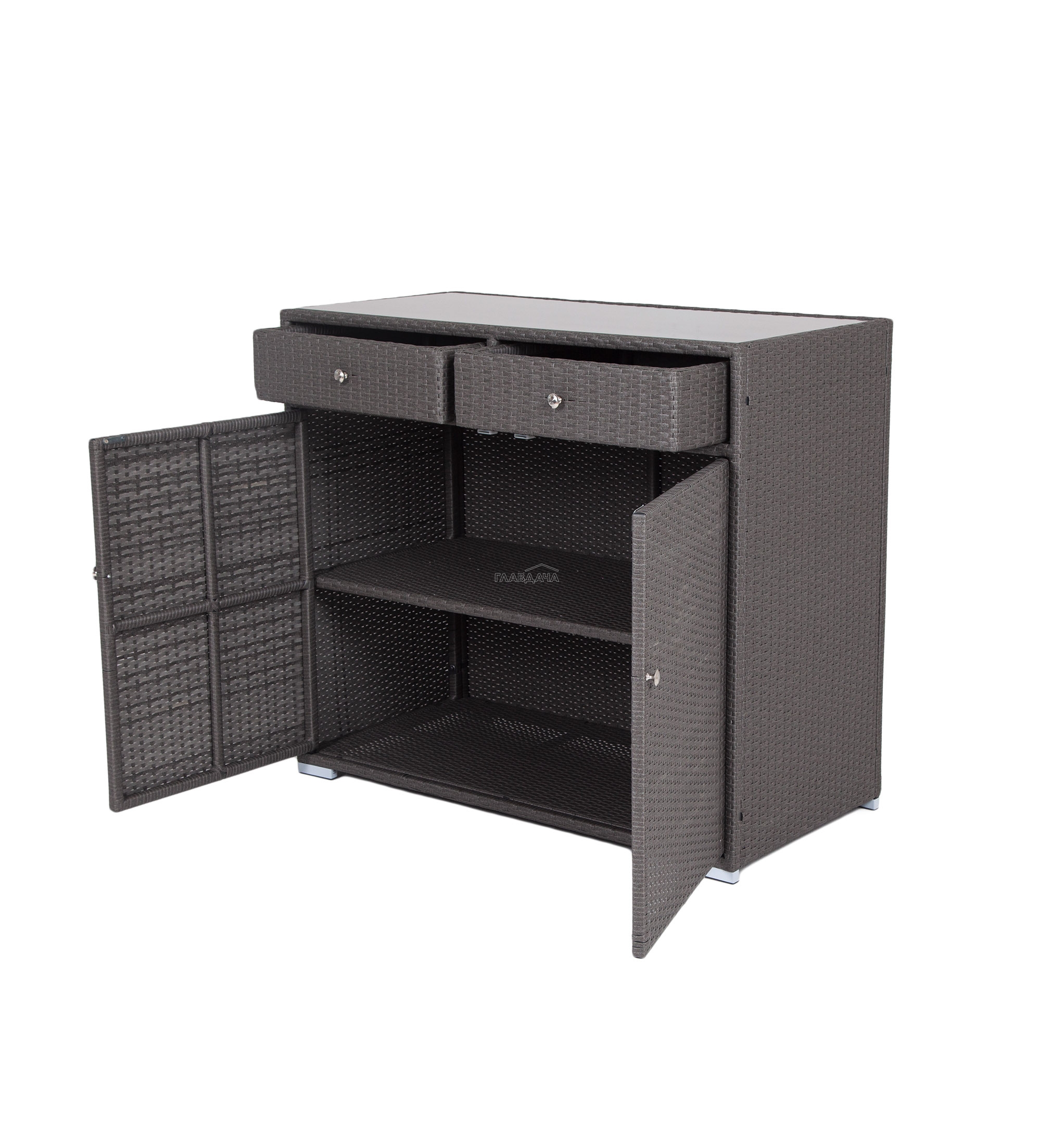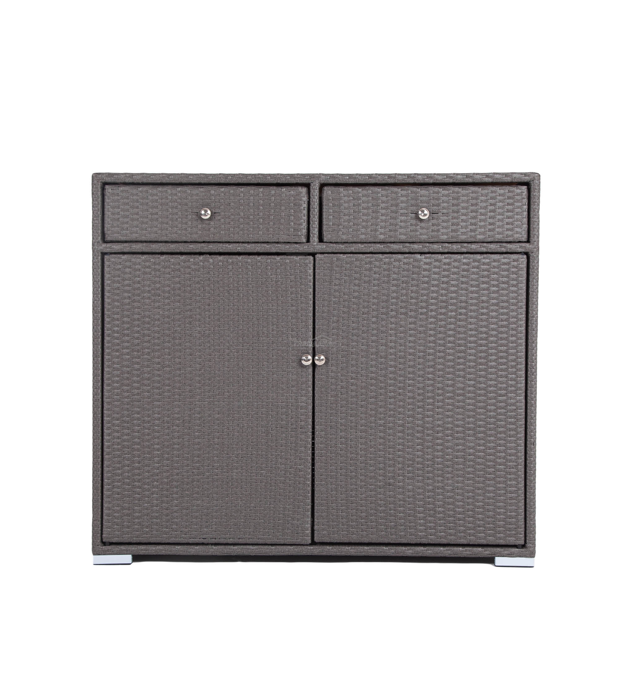 «Мальта» тумба изготовлена из алюминиевого каркаса, оплетенного плоским искусственным ротангом графитового цвета.