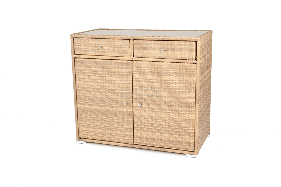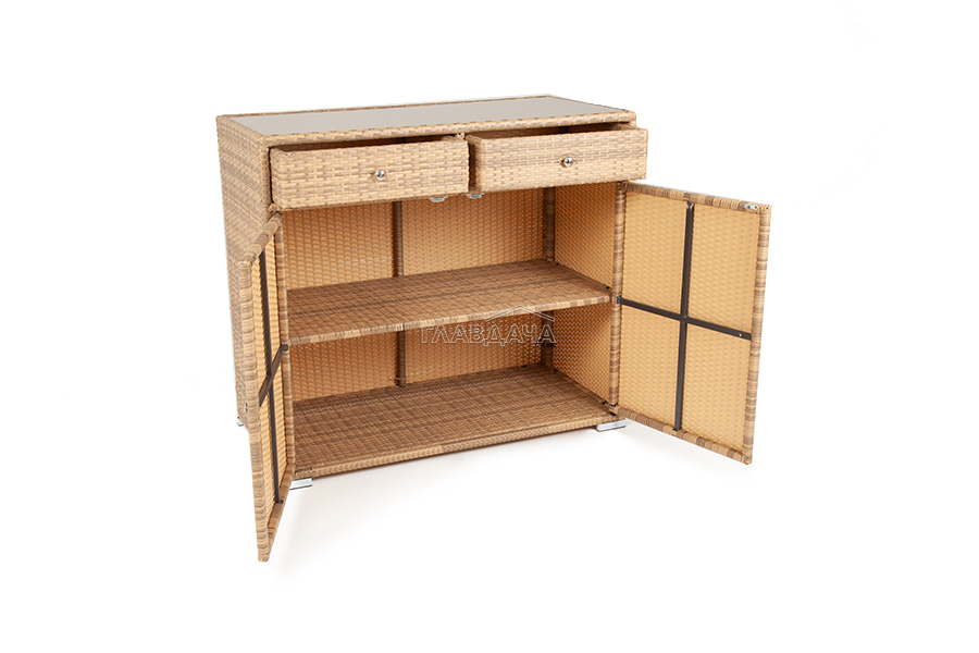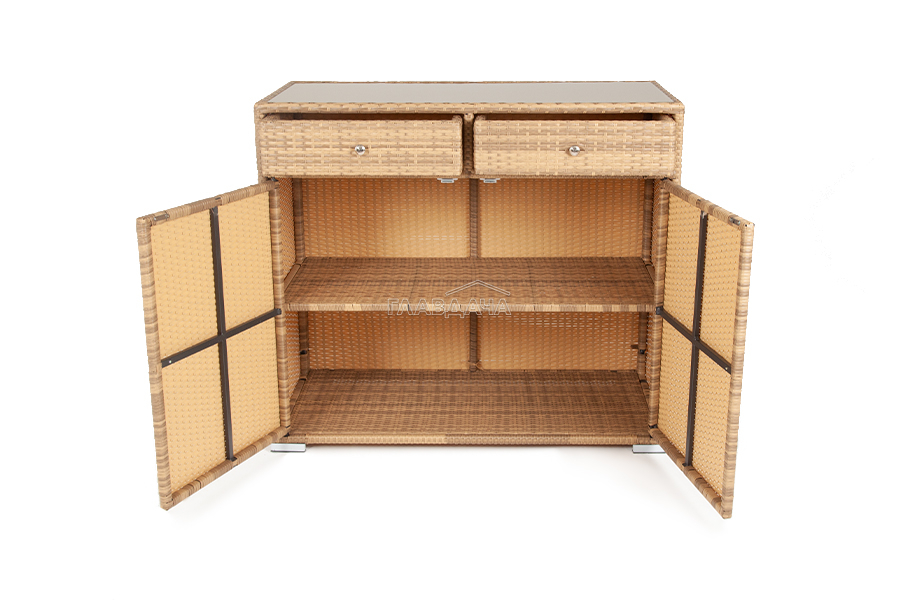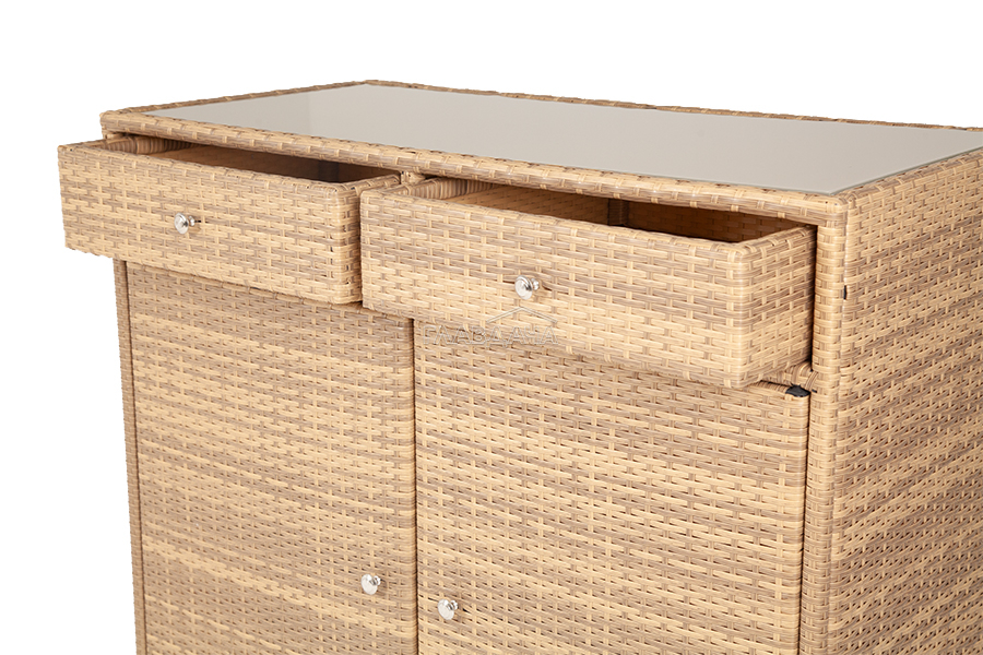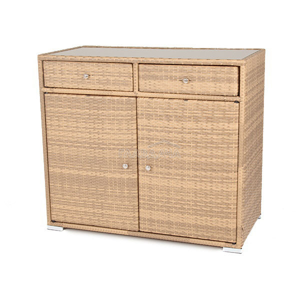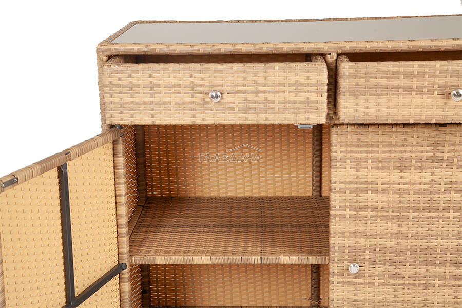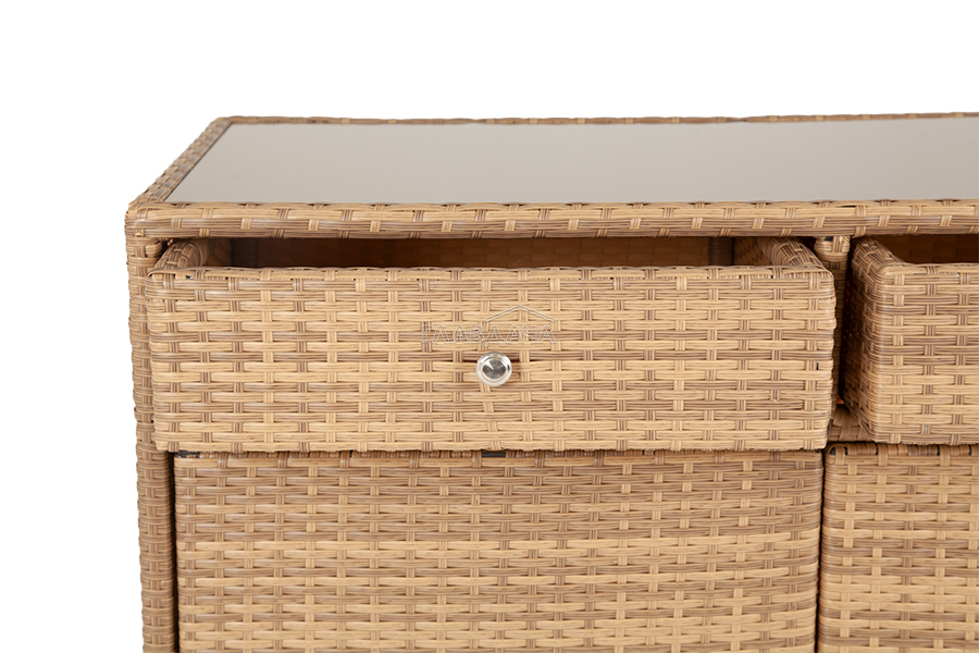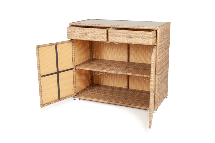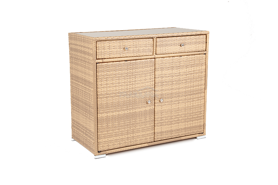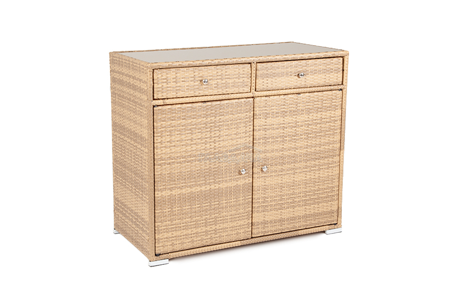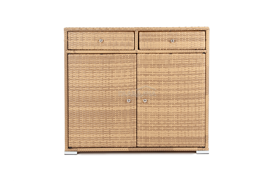 «Мальта» тумба изготовлена из алюминиевого каркаса, оплетенного плоским искусственным ротангом соломенного цвета.