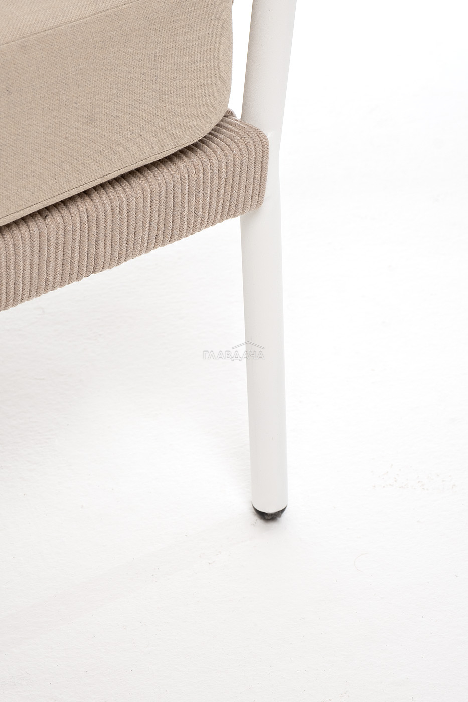 Диван имеет алюминиевый каркас, окрашенный порошковой краской в белый цвет. Боковины каркаса и спинка вручную оплетены роупом - эластичными синтетическими лентами, изготовленными из высокопрочных полиэфирных волокон. Цвет оплетки - бежевый.