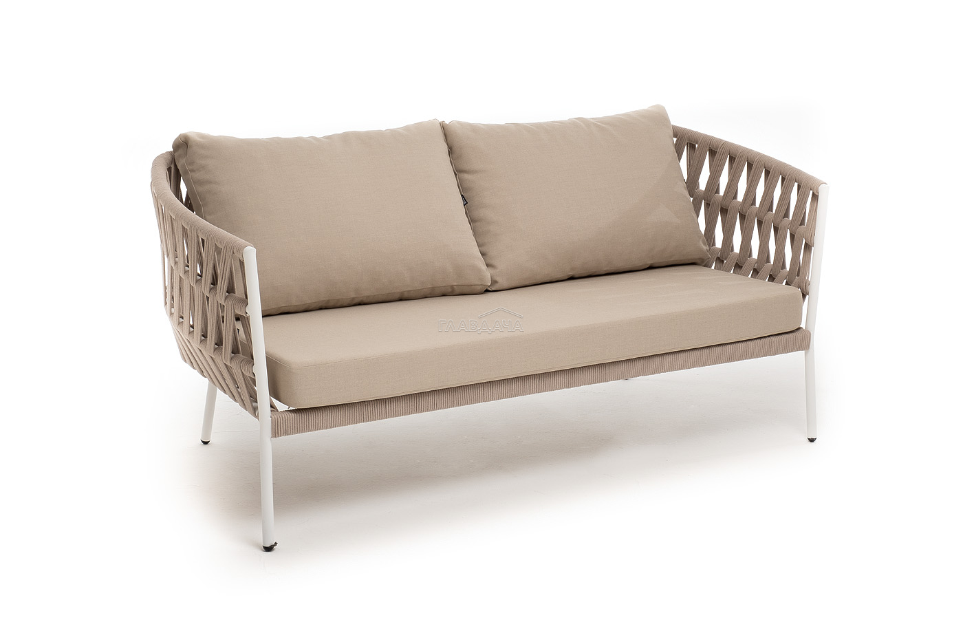 "Диего" диван 2-местный плетеный из роупа, каркас алюминий белый муар, роуп бежевый круглый, ткань бежевая 052