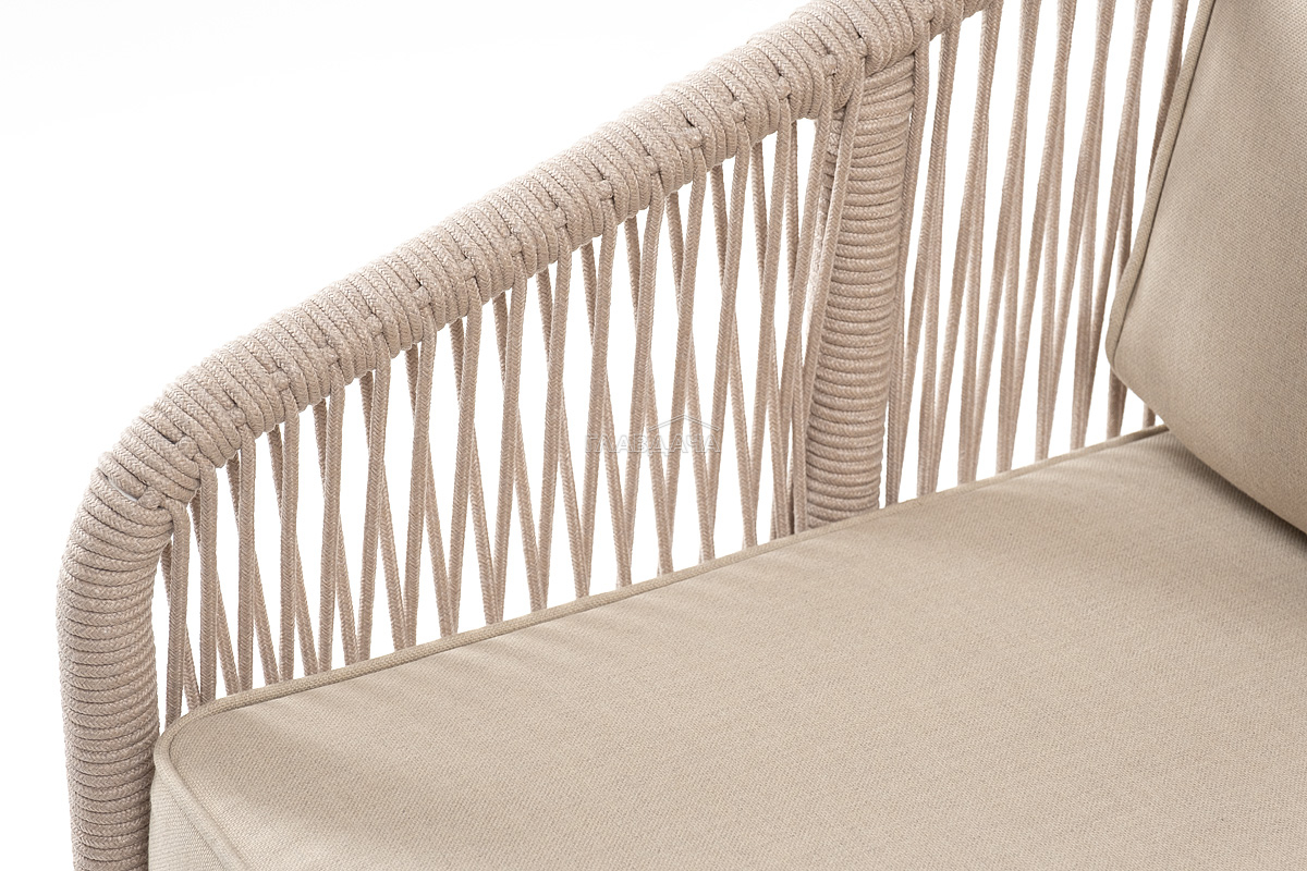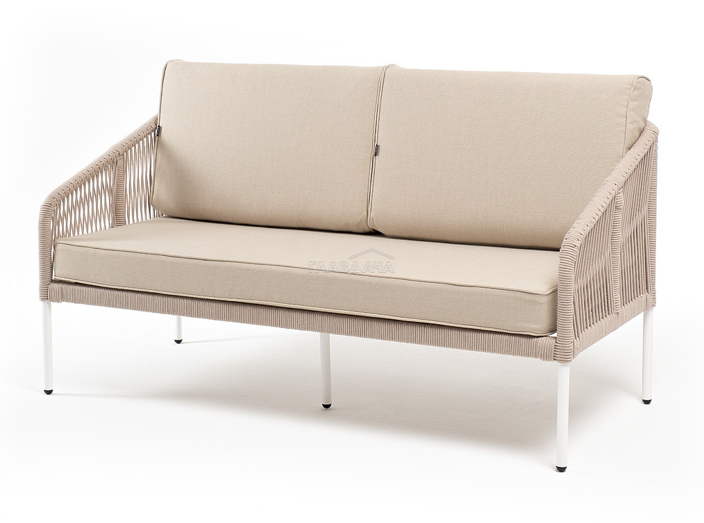 Диван имеет алюминиевый каркас, окрашенный порошковой краской в белый цвет. Боковины каркаса вручную оплетены роупом - эластичными синтетическими лентами, изготовленными из высокопрочных полиэфирных волокон бежевого цвета.