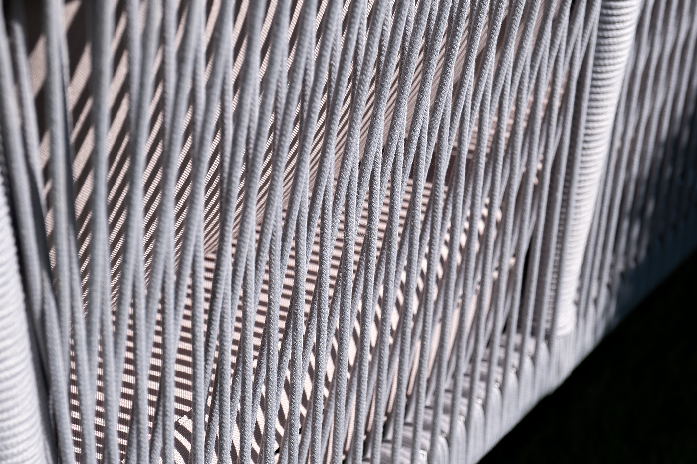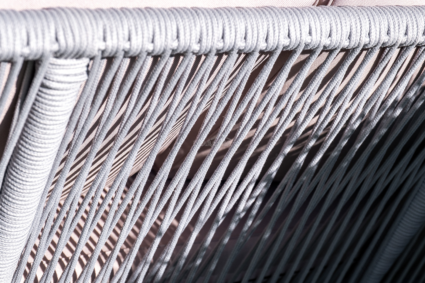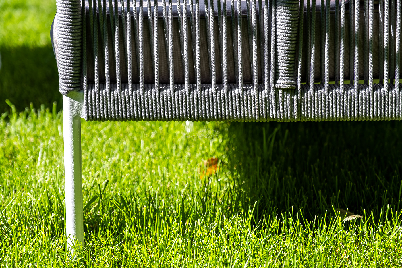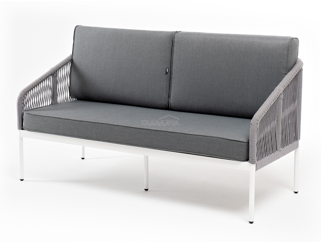 Диван имеет алюминиевый каркас, окрашенный порошковой краской в белый цвет. Боковины каркаса и спинка вручную оплетены роупом - эластичными синтетическими лентами, изготовленными из высокопрочных полиэфирных волокон. Цвет оплетки - светло-серый.