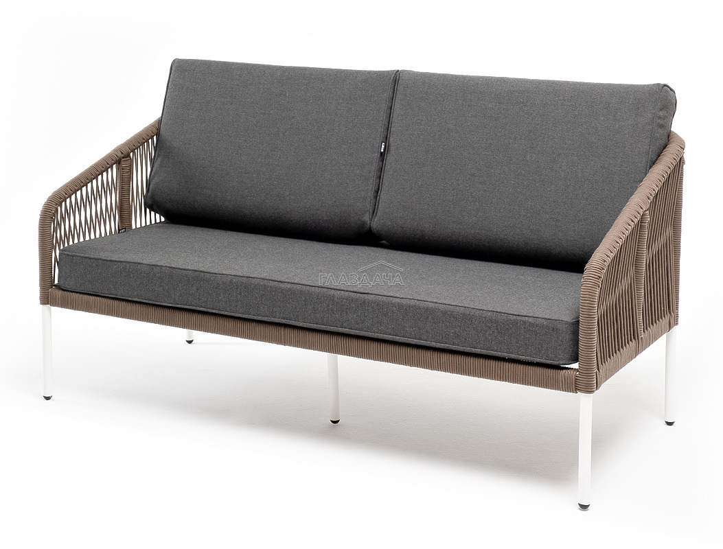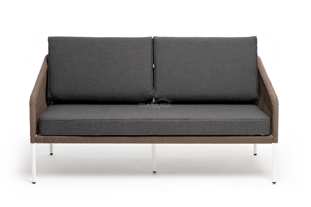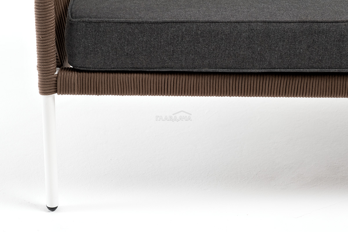 Каркас дивана изготовлен из прочного алюминия и окрашен порошковой краской в белый цвет. Боковины каркаса оплетены роупом - эластичными синтетическими лентами коричневого цвета, изготовленными из высокопрочных полиэфирных волокон. Такое плетение не только придает дивану особую изысканность, но и увеличивает срок его службы.