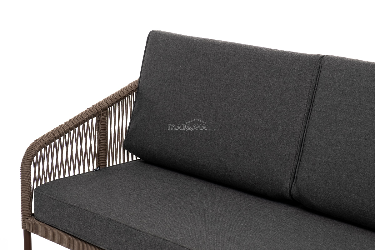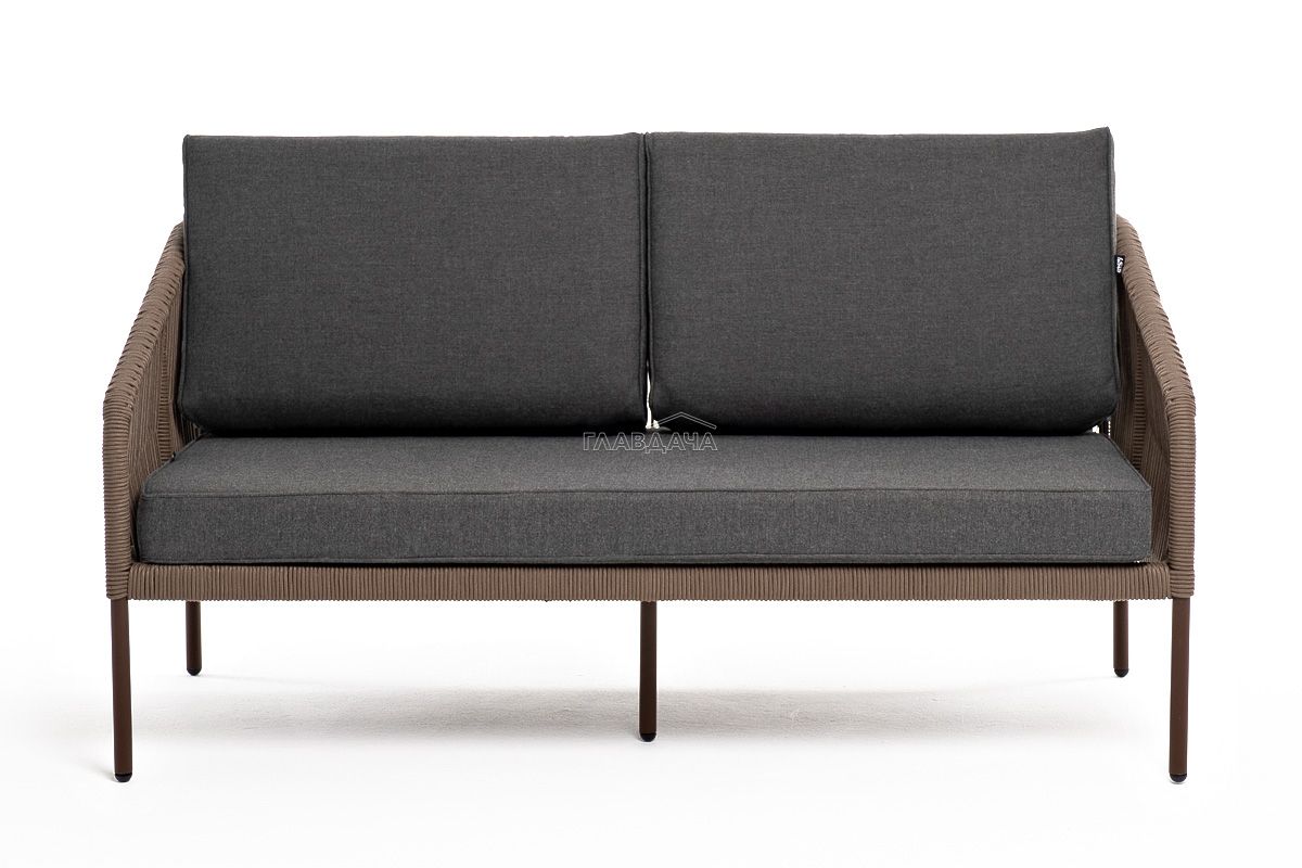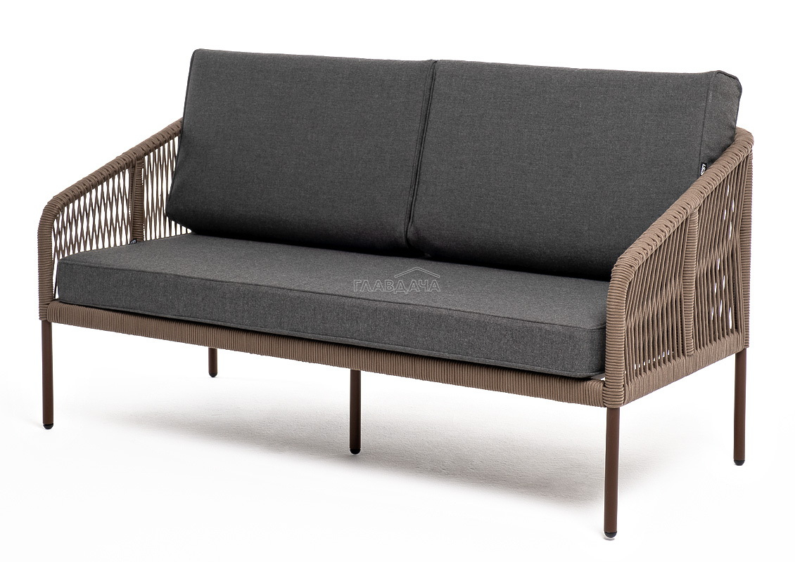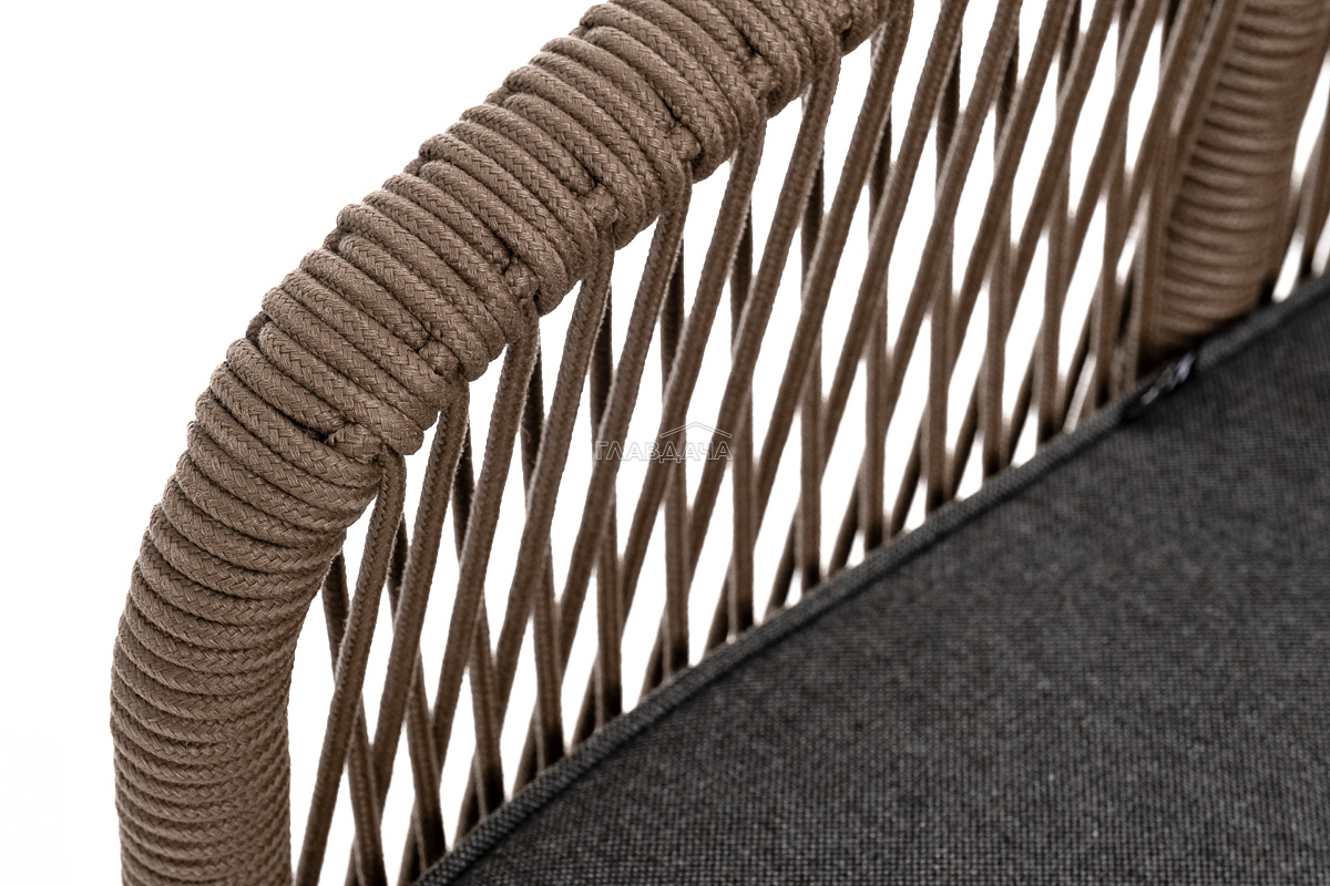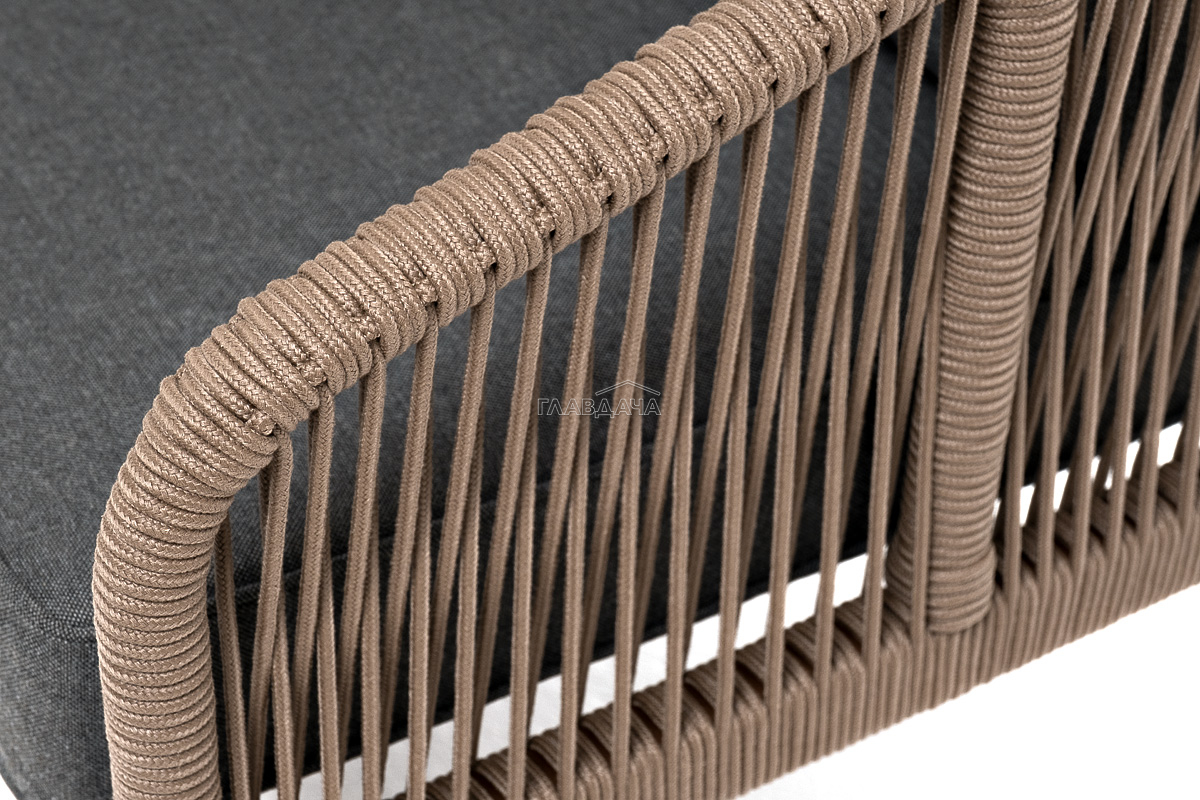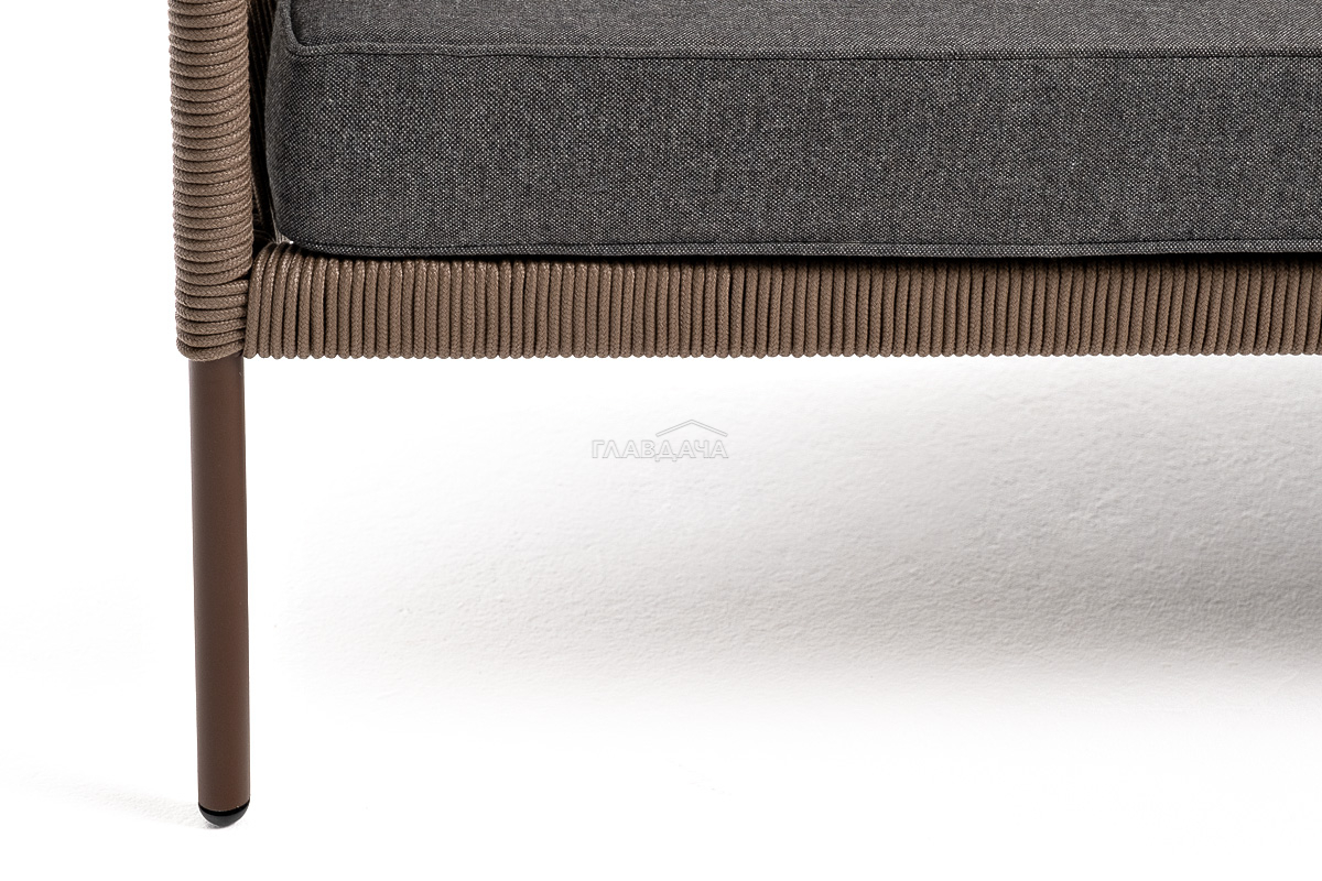 Диван имеет алюминиевый каркас коричневого (RAL8016) цвета, который обеспечивает прочность и надежность конструкции. Он вручную оплетен круглым роупом аналогичного коричневого цвета, что придает дивану элегантный и современный вид.