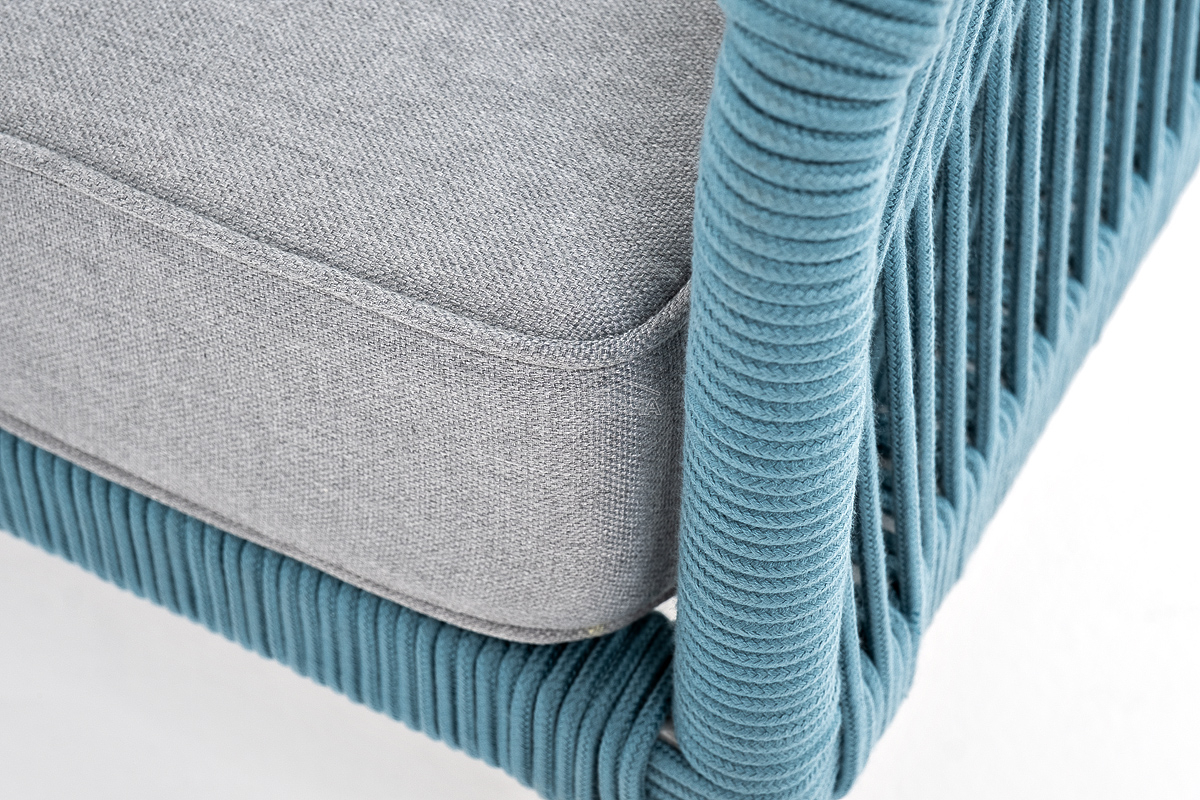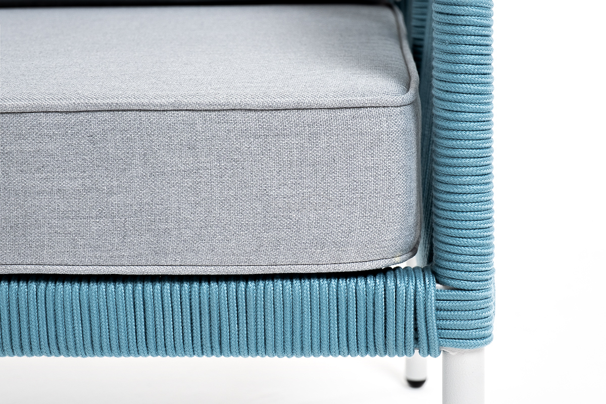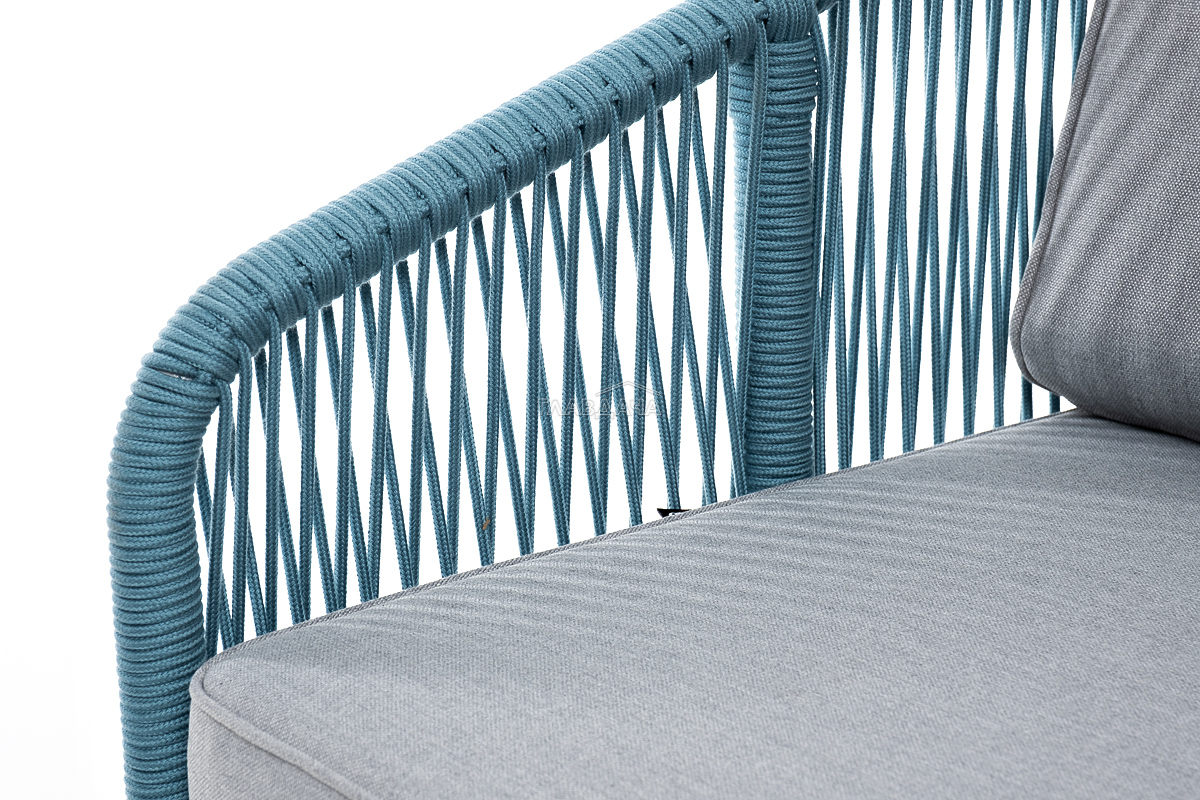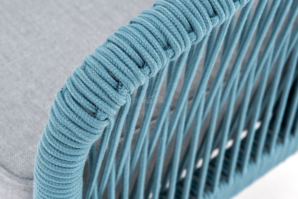 Двухместный диван «Канны» плетеный бирюзовым роупом - эластичными синтетическими лентами, выполненными из полиэфирных волокон.