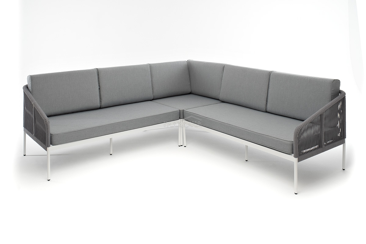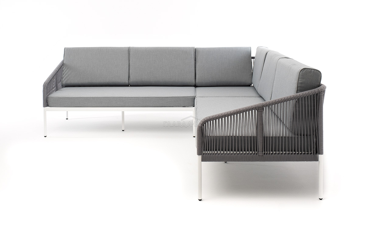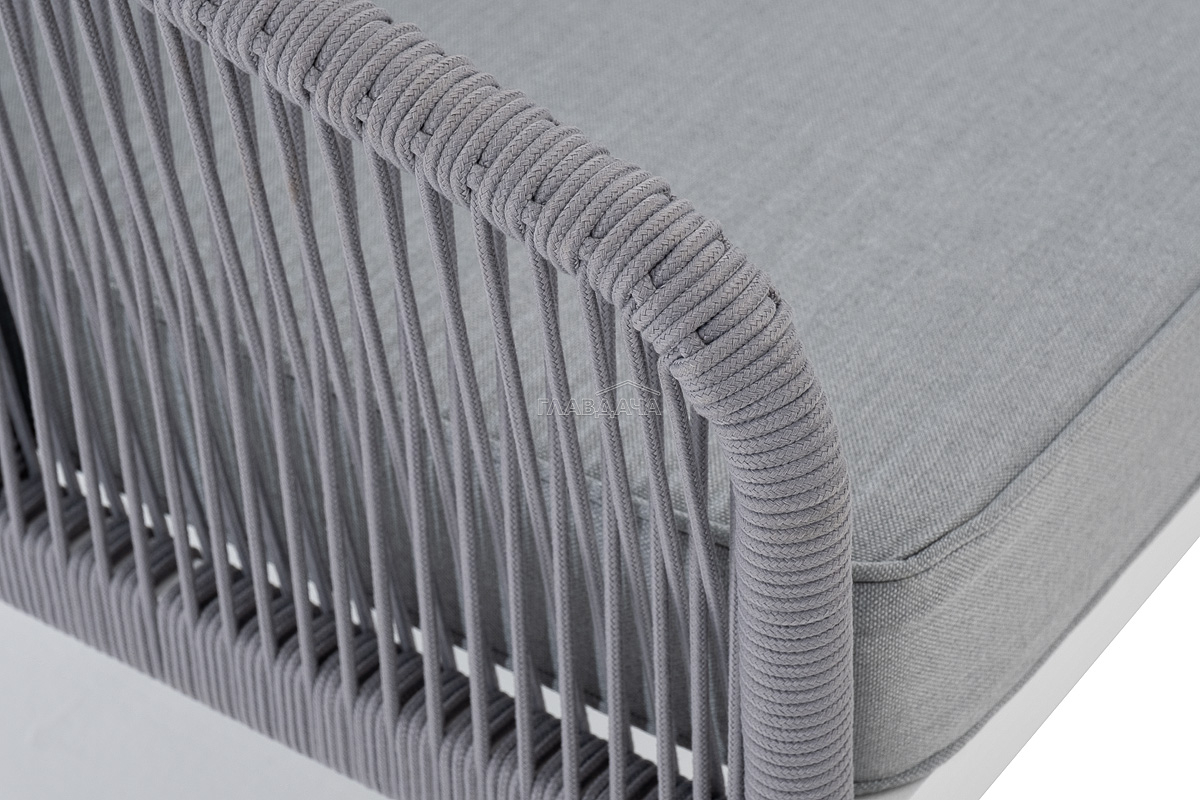 Диван имеет алюминиевый каркас, окрашенный порошковой краской в белый цвет. Боковины каркаса вручную оплетены роупом - эластичными синтетическими лентами, изготовленными из высокопрочных полиэфирных волокон. Цвет оплетки - светло-серый.