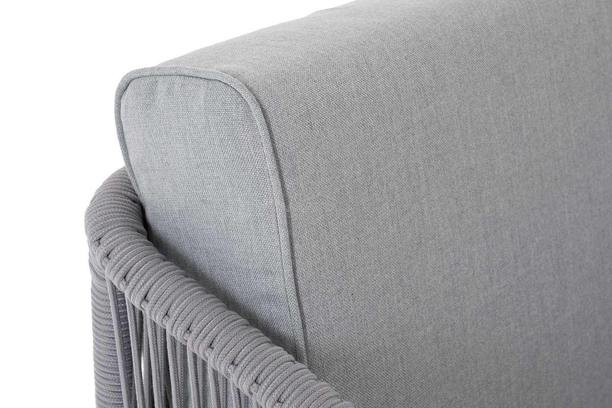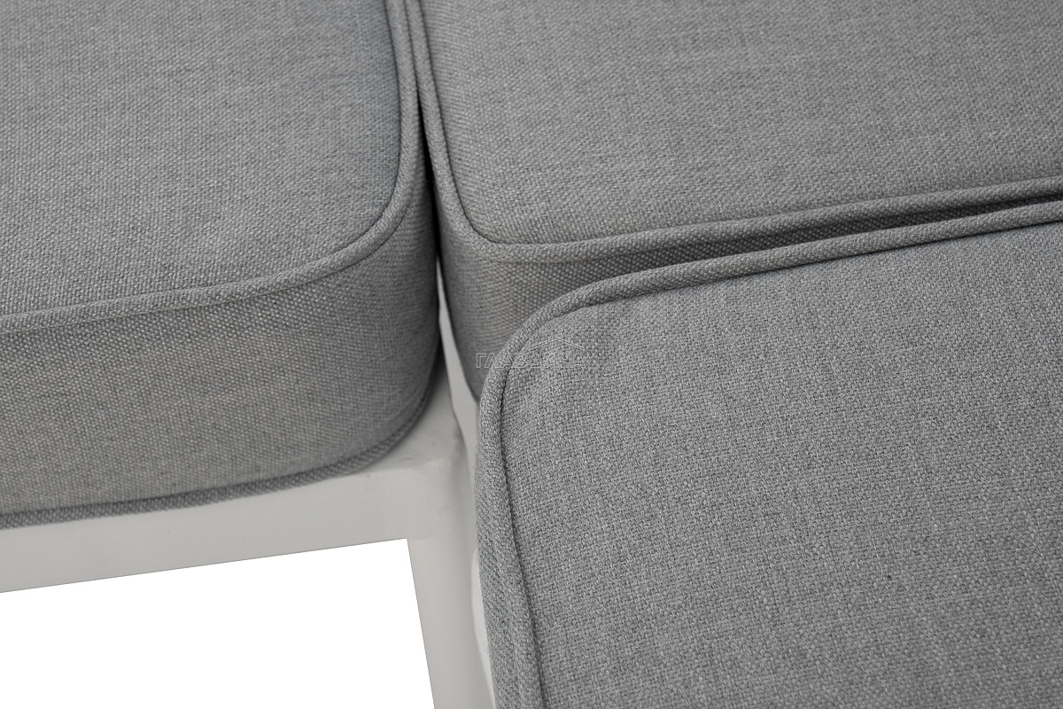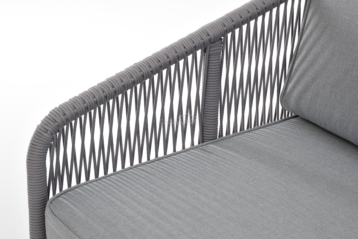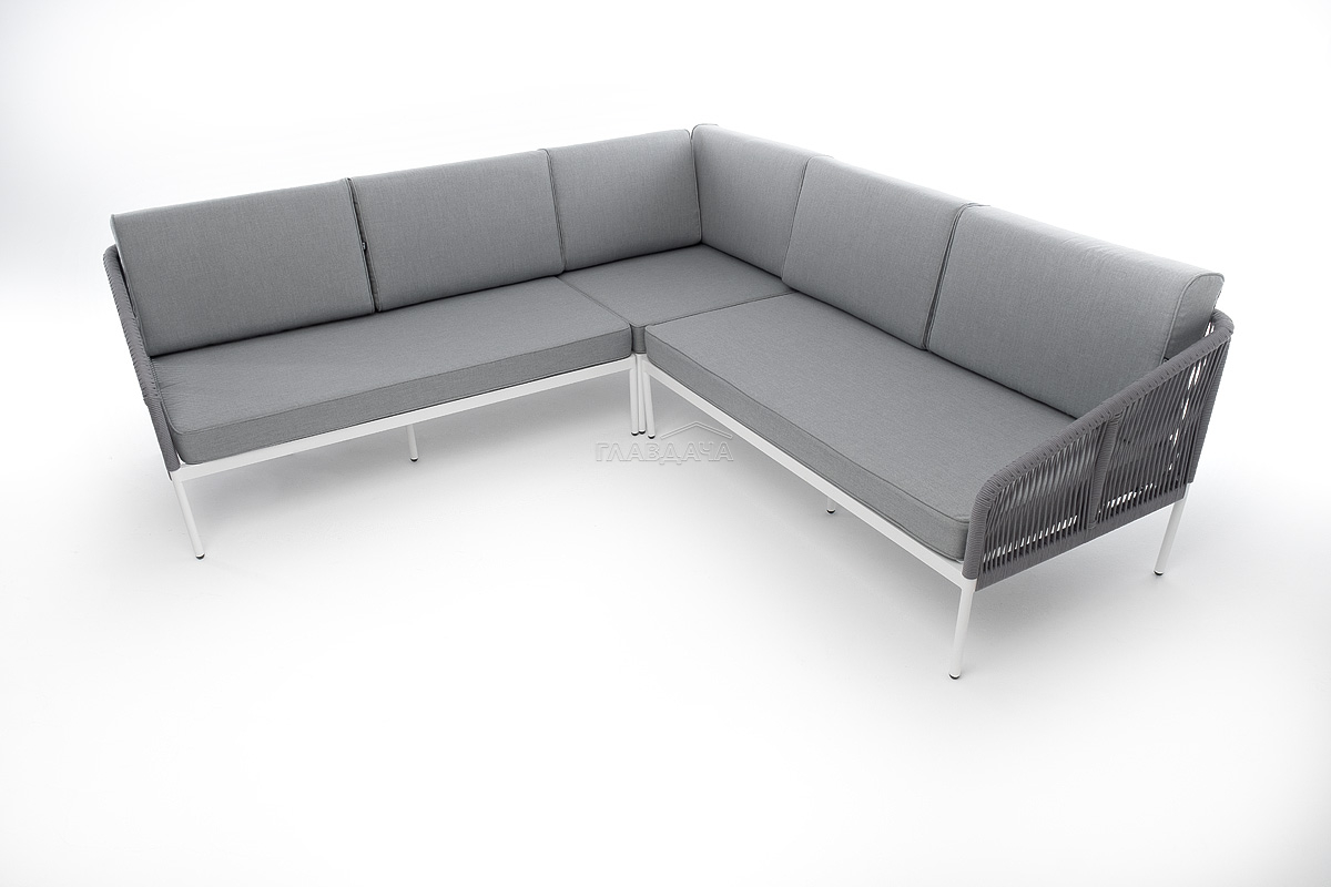 Диван имеет алюминиевый каркас, окрашенный порошковой краской в белый цвет. Боковины каркаса вручную оплетены роупом - эластичными синтетическими лентами, изготовленными из высокопрочных полиэфирных волокон. Цвет оплетки - светло-серый.