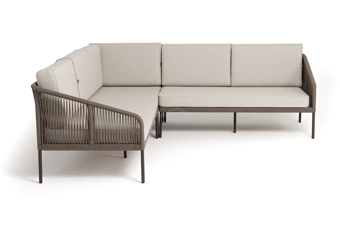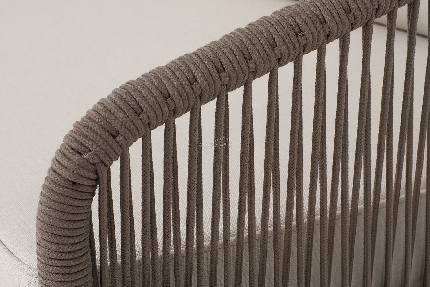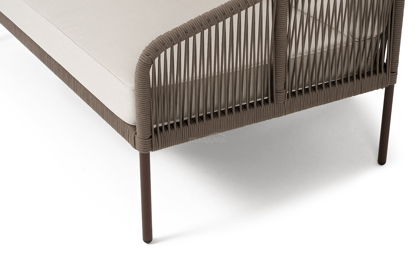 Диван имеет алюминиевый каркас, окрашенный порошковой краской в коричневый (RAL8016) цвет. Боковины каркаса вручную оплетены роупом - эластичными синтетическими лентами, изготовленными из высокопрочных полиэфирных волокон. Цвет оплетки - коричневый.