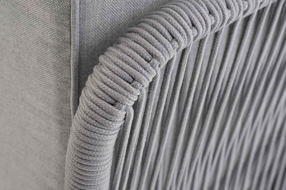 Плетеный модуль имеет алюминиевый каркас, окрашенный порошковой краской в белый цвет. Боковины каркаса вручную оплетены роупом - эластичными синтетическими лентами, изготовленными из высокопрочных полиэфирных волокон. Цвет оплетки - светло-серый.