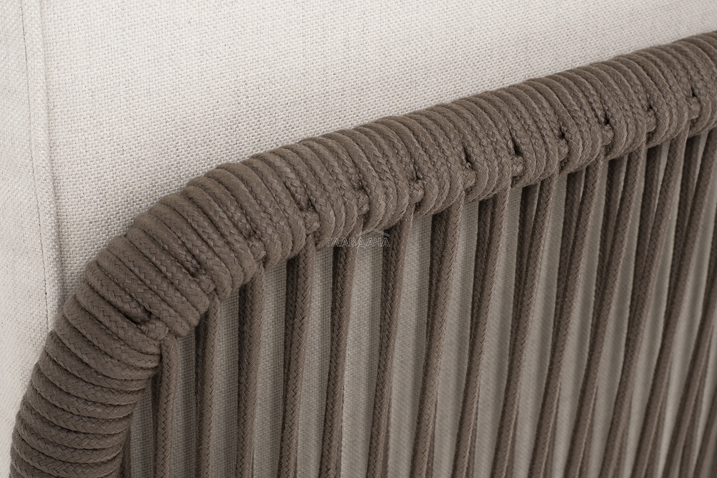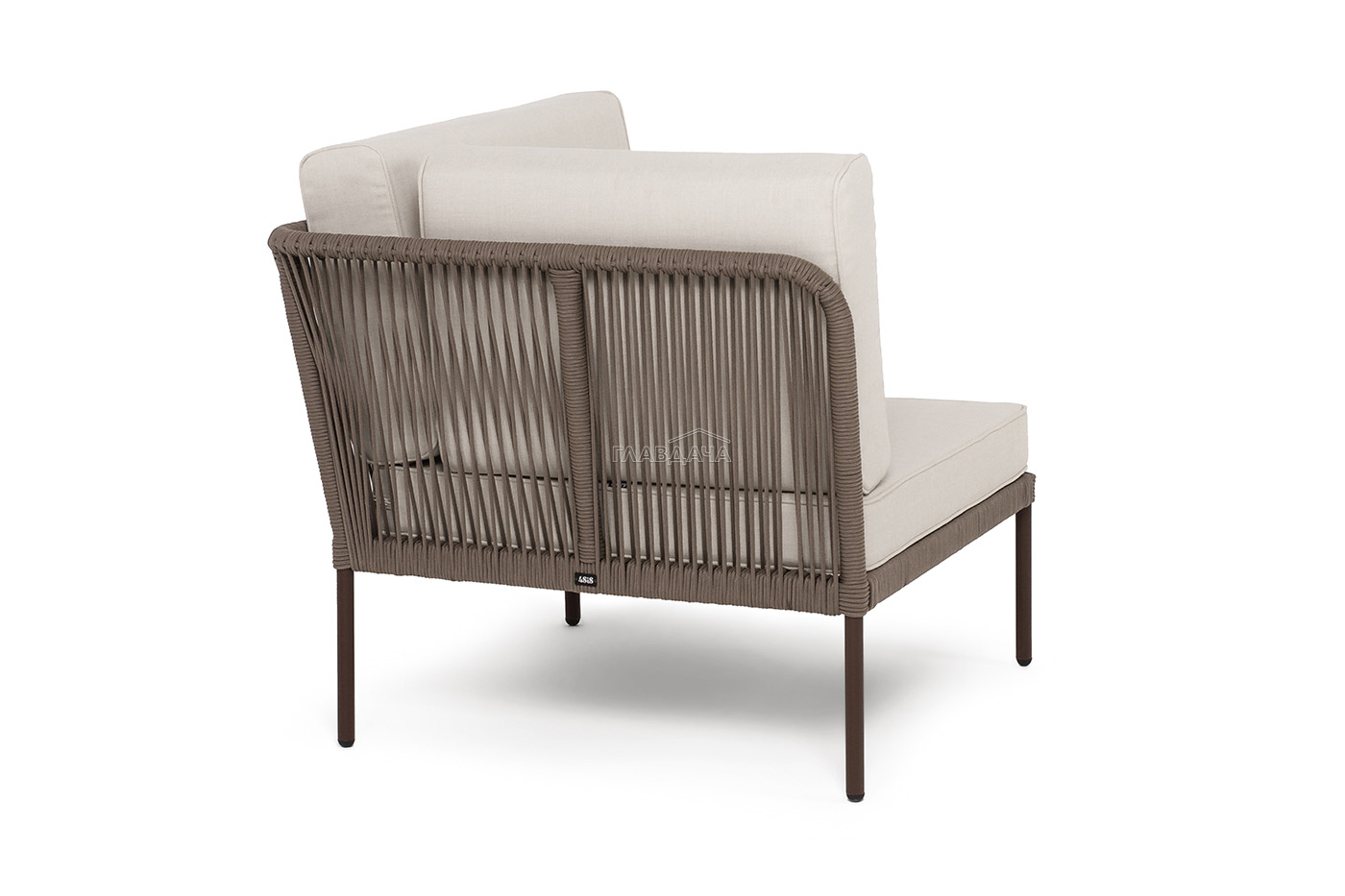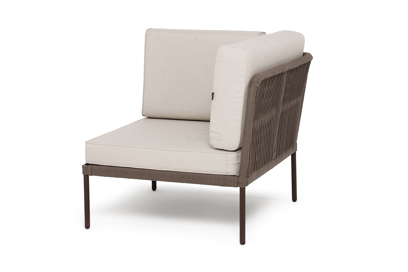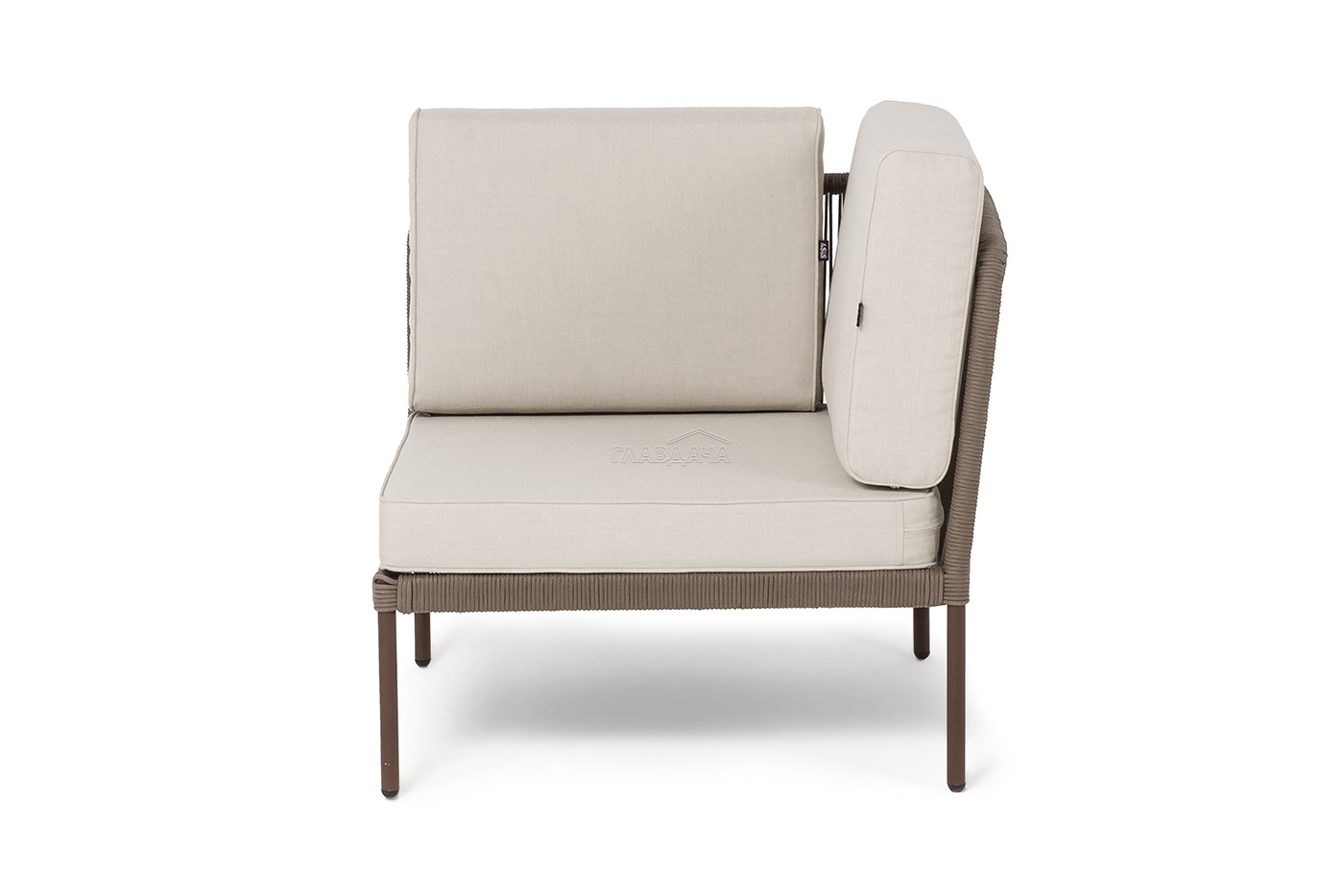 Плетеный модуль имеет алюминиевый каркас, окрашенный порошковой краской в коричневый (RAL8016) цвет. Боковины каркаса вручную оплетены роупом - эластичными синтетическими лентами, изготовленными из высокопрочных полиэфирных волокон. Цвет оплетки - коричневый.