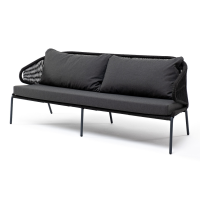 Диван имеет алюминиевый каркас, окрашенный порошковой краской в светло-серый (RAL7035) цвет. Боковины каркаса вручную оплетены роупом - эластичными синтетическими лентами, изготовленными из высокопрочных полиэфирных волокон. Цвет оплетки - серо-коричневый.